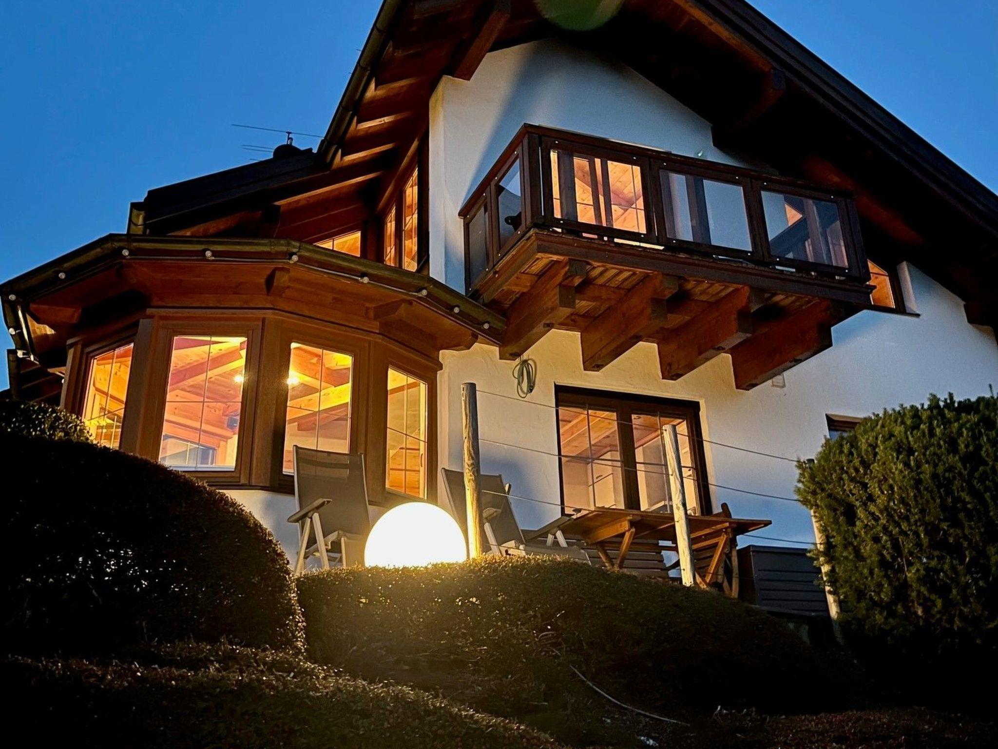 The very high quality and lovingly furnished house offers over 100 square metres of living space on three floors on a 300 square metre plot. At your disposal are two marble bathrooms with two showers and a corner bath, two open fireplaces, a spacious open-plan kitchen, a large terrace and a garden (exclusive use), a balcony and a light-flooded round bay window in the living area with a view over the Achental valley. Black marble flooring with underfloor heating, integrated music system, satellite TV and Internet/ WLAN included. Built in 1992, this is a south-facing corner house of a total of three terraced houses with north-south orientation. The house, the garden, the terrace and a garage for one car are at your exclusive disposal.