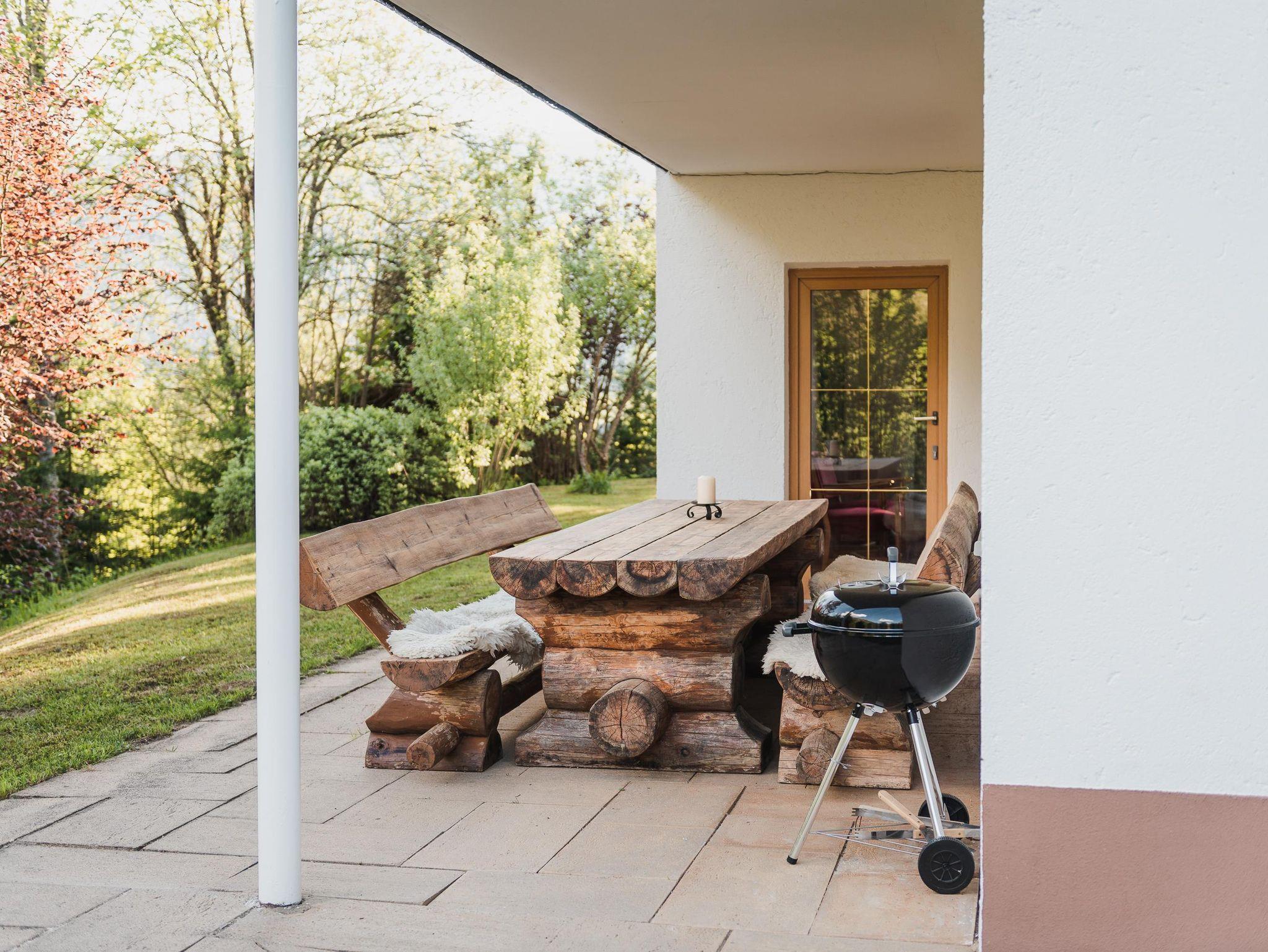 Auf der private Terrasse gibt es einen großen Massivholztisch mit Bänken und einen Grill. Die Terrasse wird von früh bis spät von der Sonne beschienen und ist somit der perfekte Ort für ein langes Essen mit der ganzen Familie.