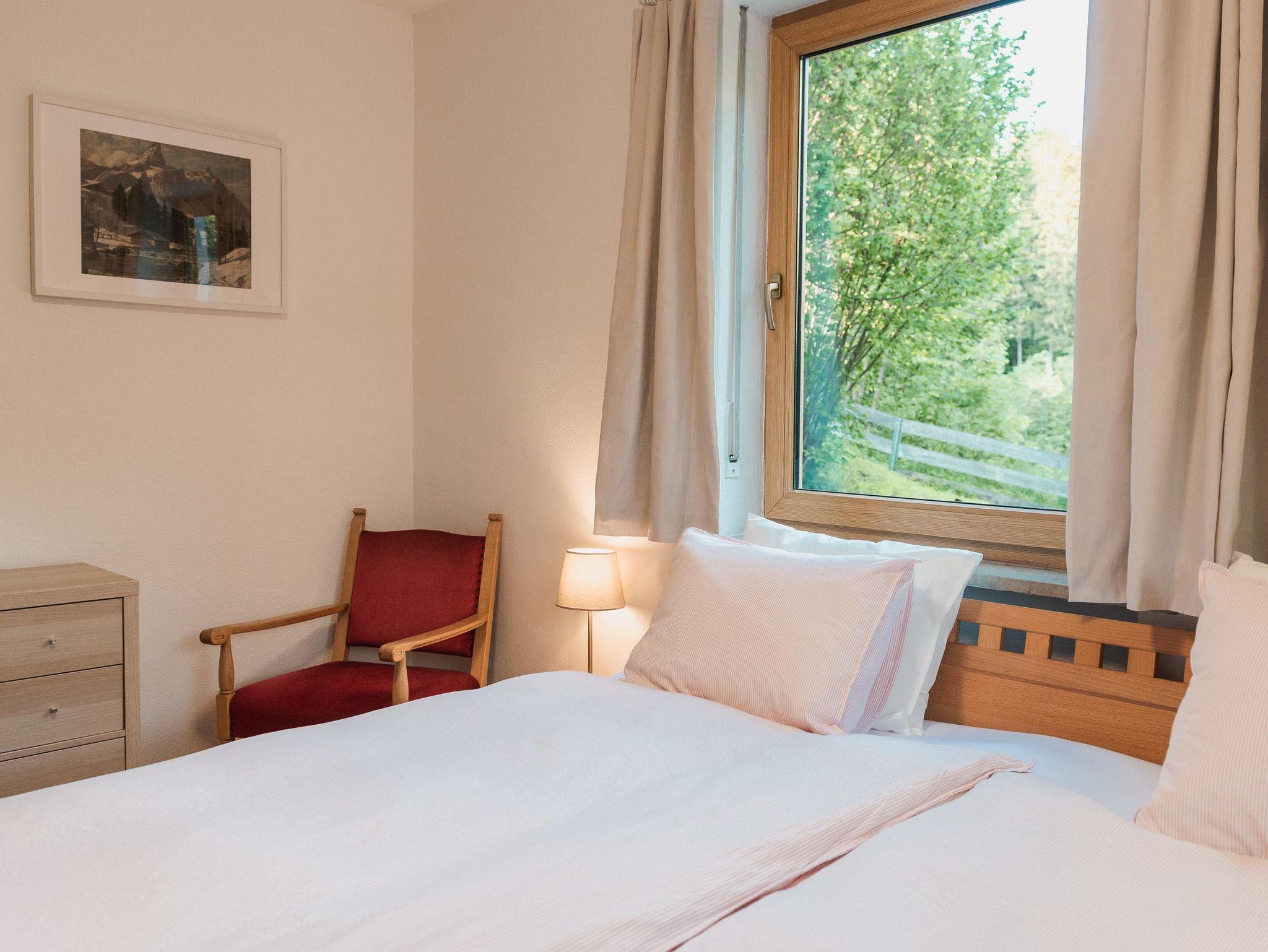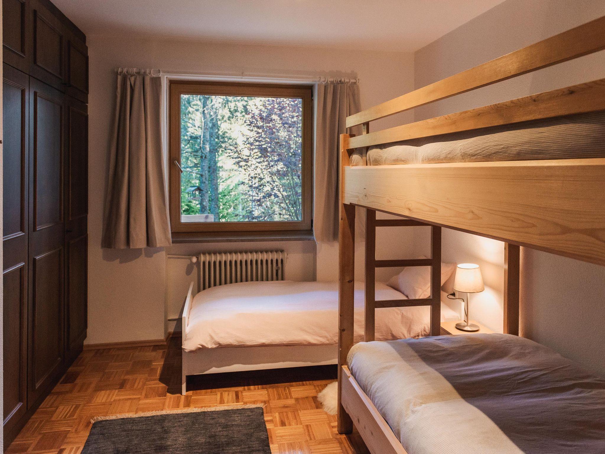 Das erste Schlafzimmer hat ein Doppelbett und das zweite hat ein Etagenbett und ein Einzelbett. Beide Schlafzimmer haben große Einbauschränke und Blick auf den Wald und die Berge.