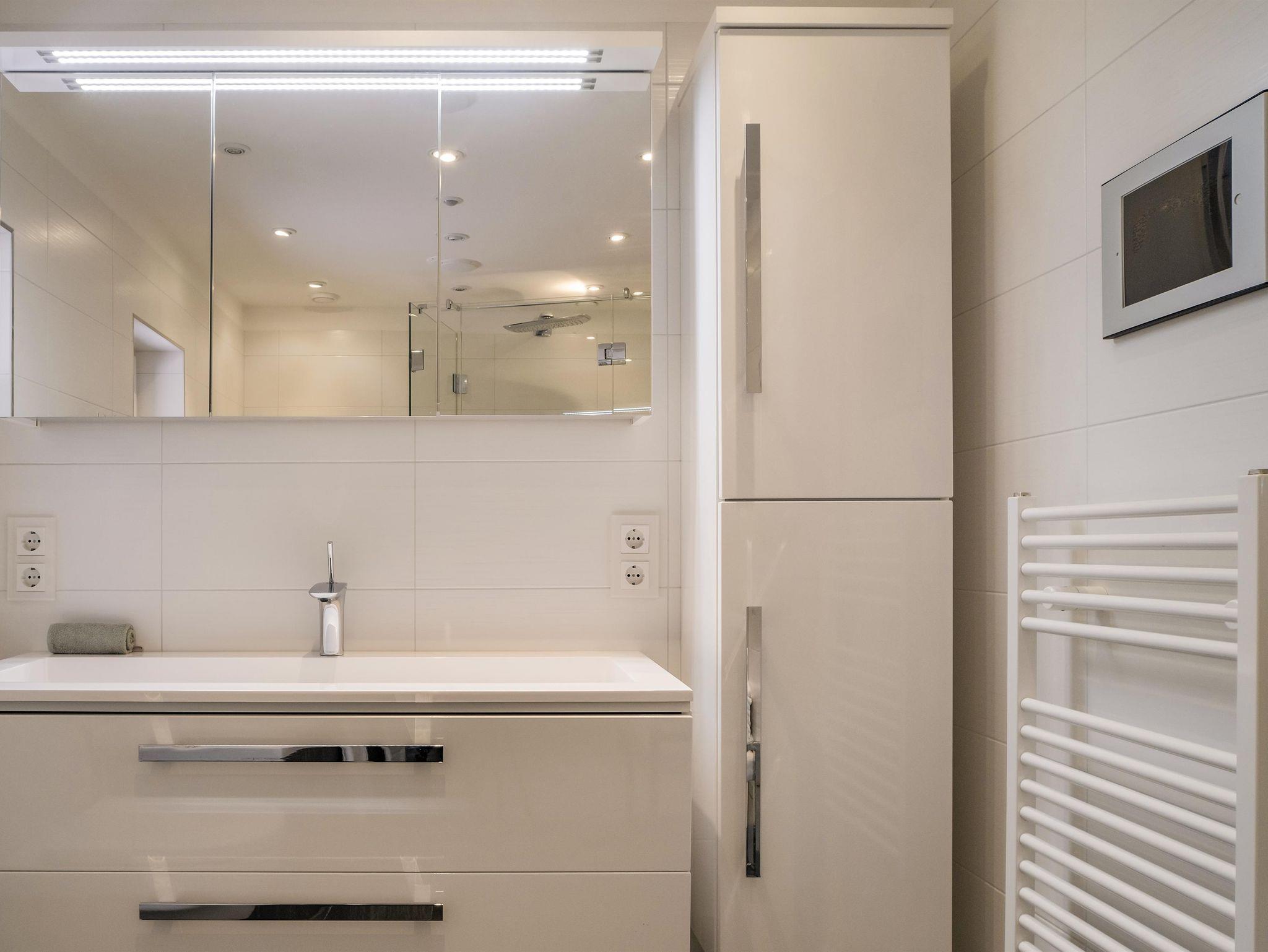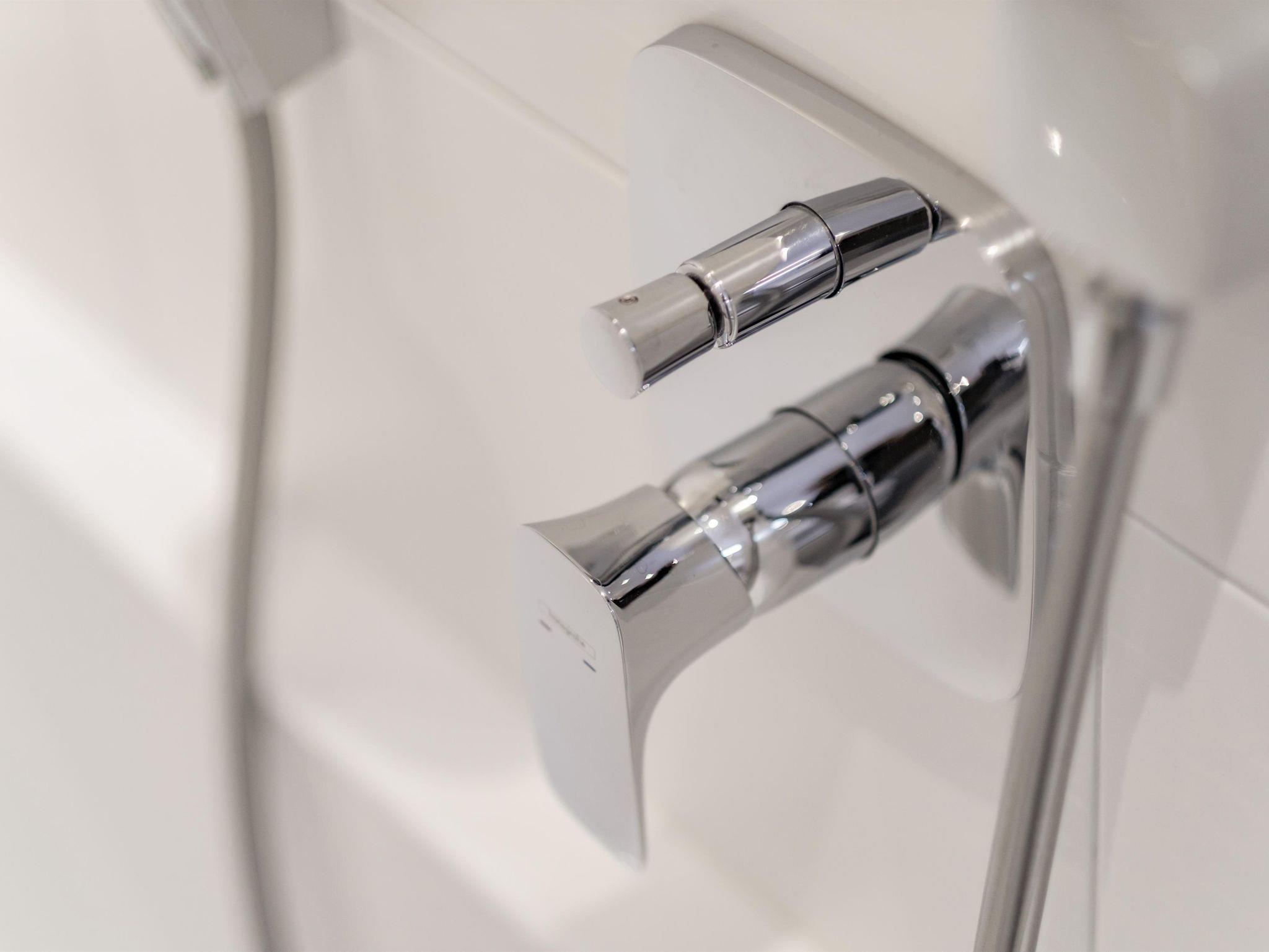 - 1 Badezimmer mit Dusche, Badewanne, Toilette und ausreichend Stauraum
