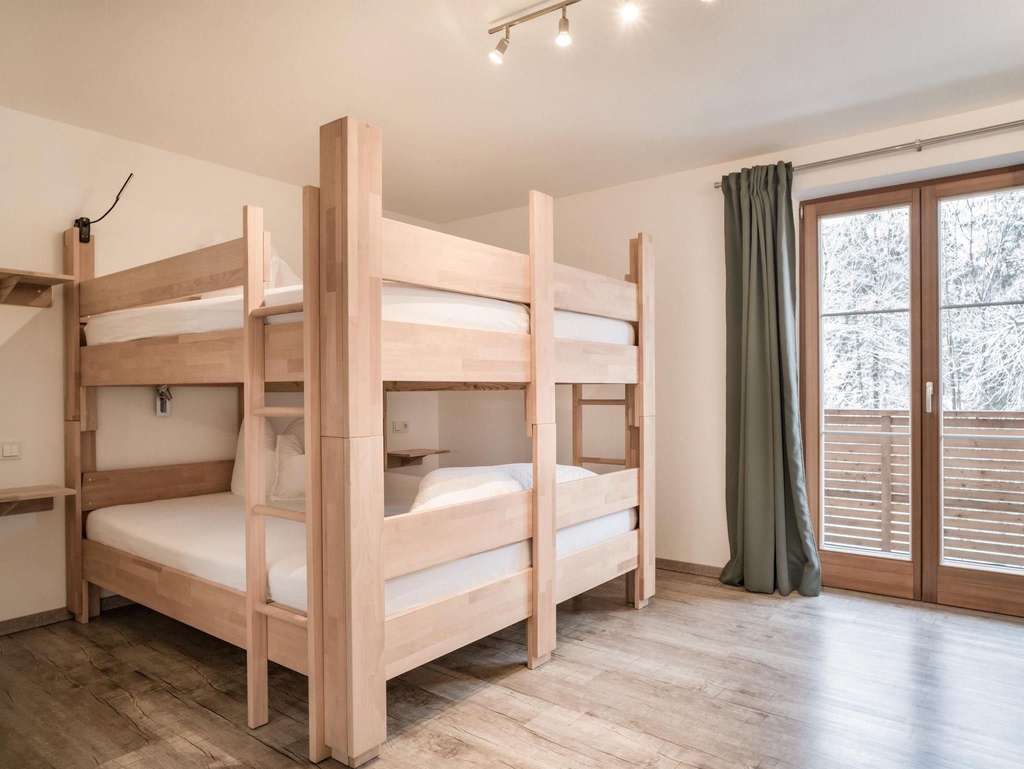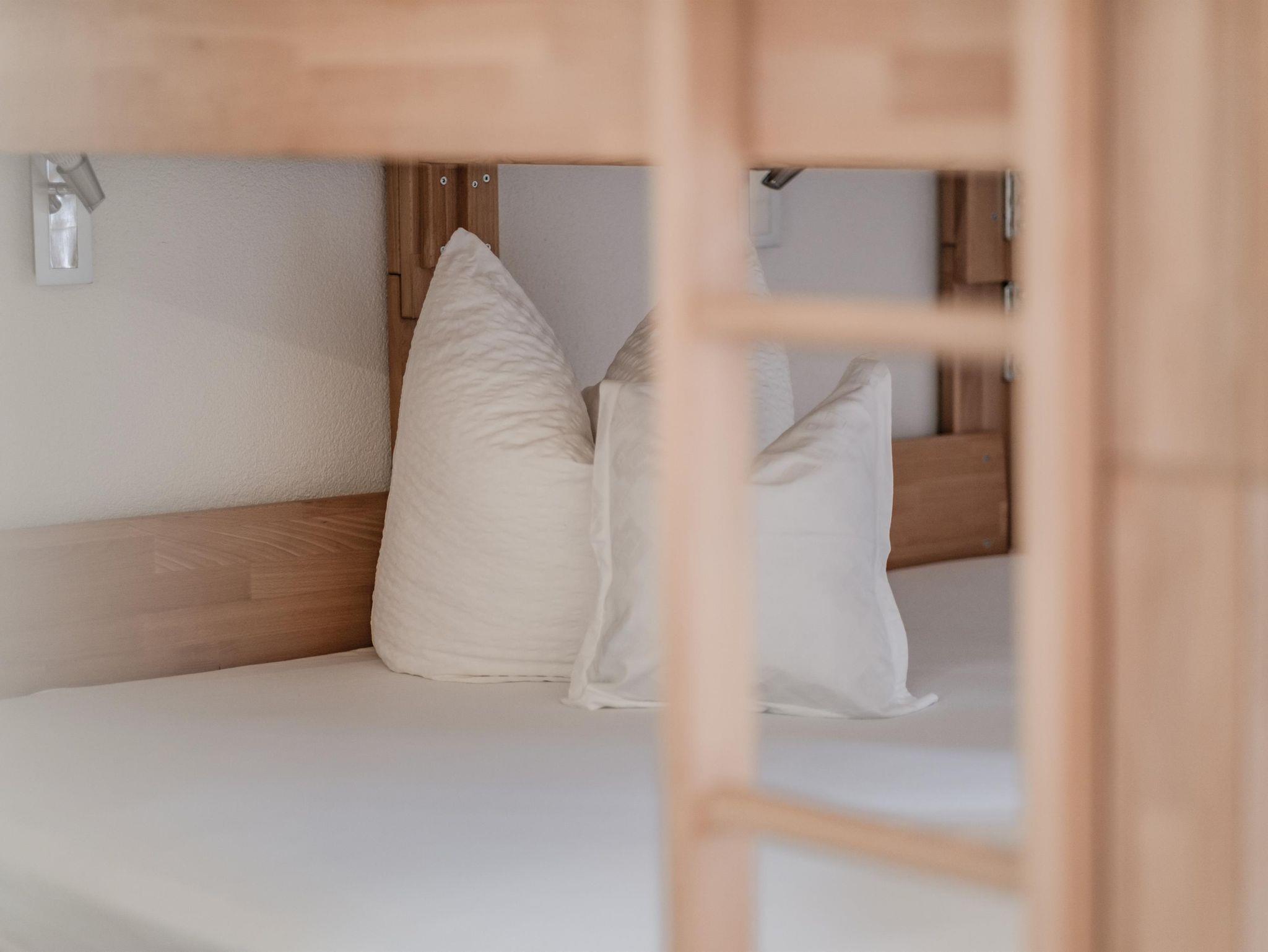 • 1. Stock: Ein Badezimmer mit viel Stauraum, ein Familienzimmer mit Vollholzbett (200 x 200 cm), ein Zimmer mit Boxspringbett (180 x 200 cm) und ein Doppelstockbettzimmer (180 x 200 cm). Alle Schlafzimmer haben Zugang zum Balkon.