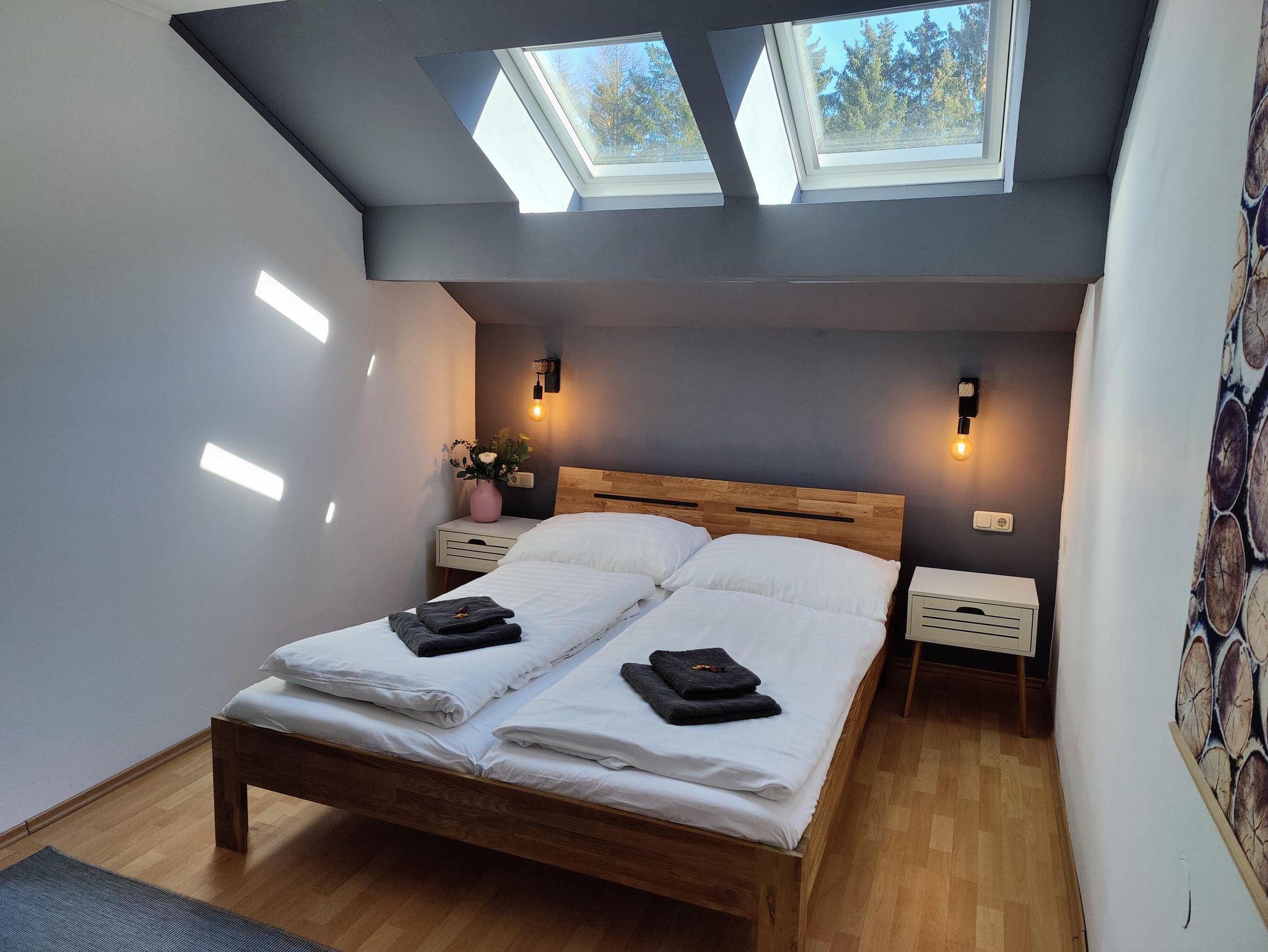 Dieses schöne Doppelzimmer befindet sich in der zweiten Stock. Vom Zimmer und vom eigenen Balkon aus können Sie den Blick auf die Berge genießen. Der Raum verfügt über zwei Oberlichter. Es gibt ein Satellitenfernsehen, ein Wasserkocher, W-lan und ein Schließfach. Das Badezimmer ist mit Dusche und WC, Föhn und einem Kosmetikspiegel ausgestattet.
