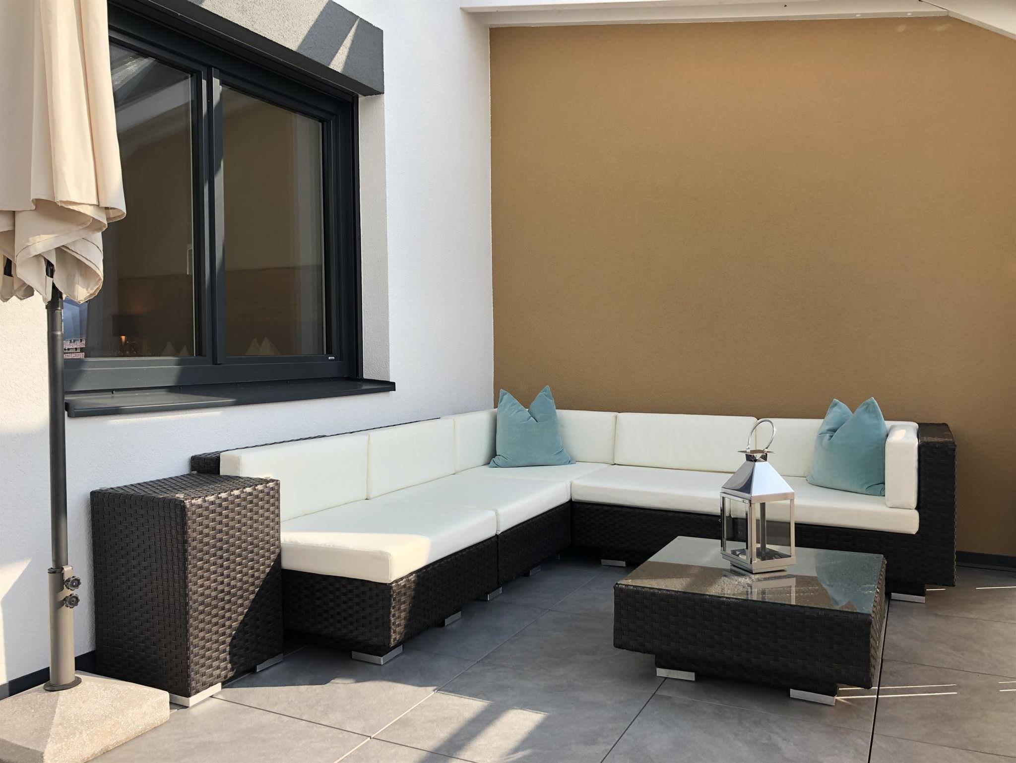 großzügige Sonnenterrasse mit Loungemöbel, Esstisch und Sonnenschirm