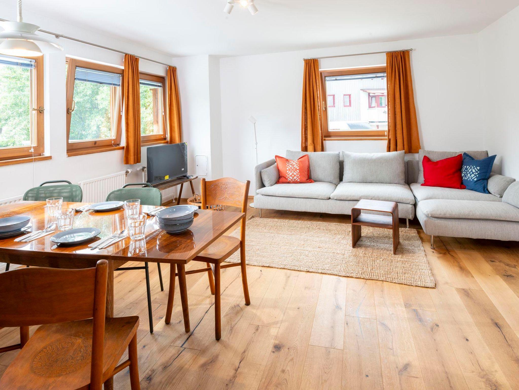 Das gemütliche Wohnzimmer mit einer bequemen Sitzgruppe und die gut augestatte Küche laden zum gemeinsamen Kochen und Entspannen nach einem aktiven Tag ein.