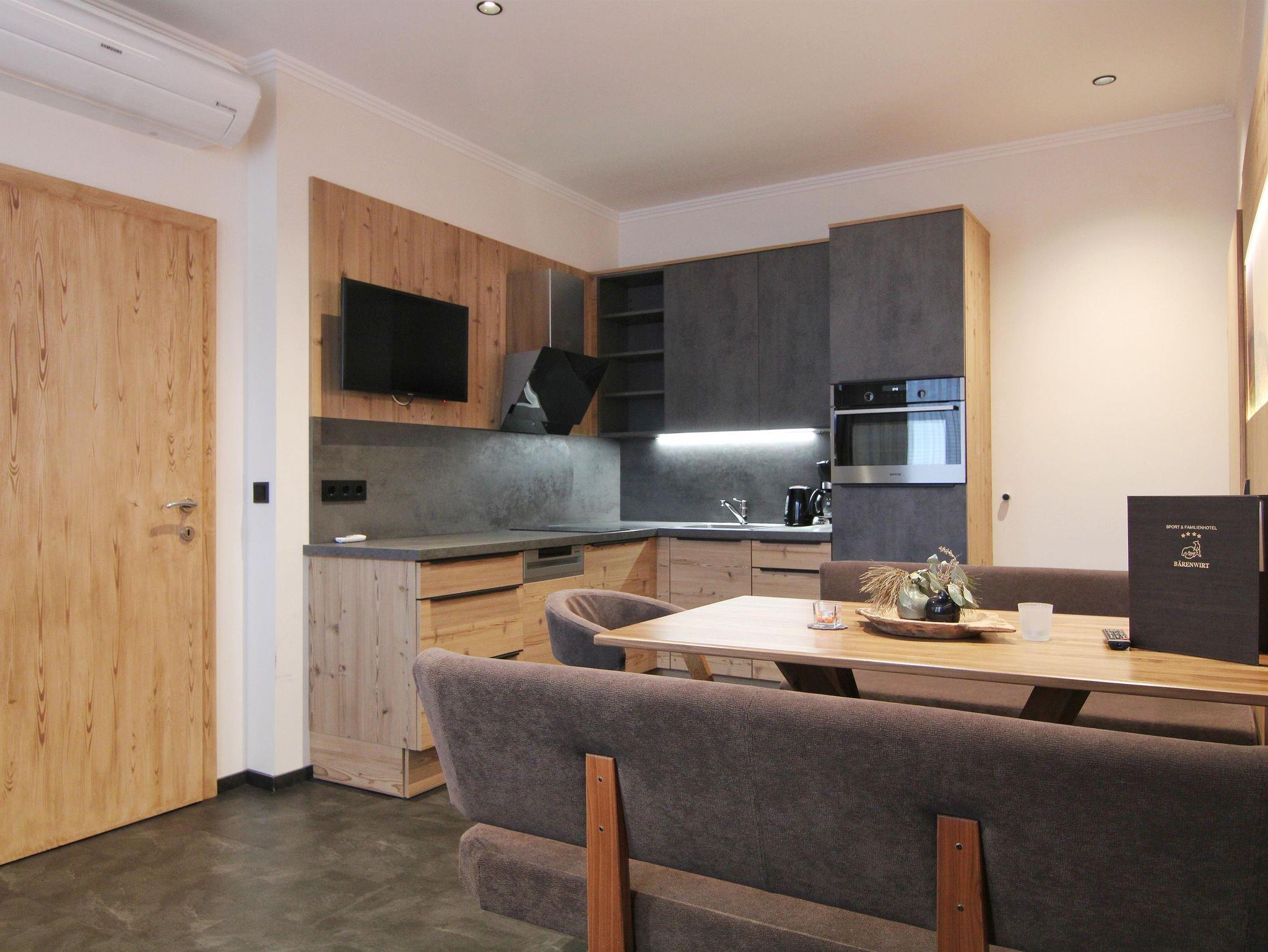 ca. 50 m² komfortable und praktische Ausstattung im ländlichen Stil garantiert Wohlempfinden und Urlaubsfreude. 2 Schlafzimmer, Wohnraum mit modernen Küchenblock Geschirrspüler, 2 Kabel-TV`s, Sonnenterrasse, Parkplätze etc. Genießen Sie alle Vorzüge eines Hotels wie zB unsere großzügige Wohlfühloase Bären SPA , Saunaland, Hotelpool, große Liegewiese, Ruhezonen, Animationsprogramm, Bären Extras und alle Annehmlichkeiten.