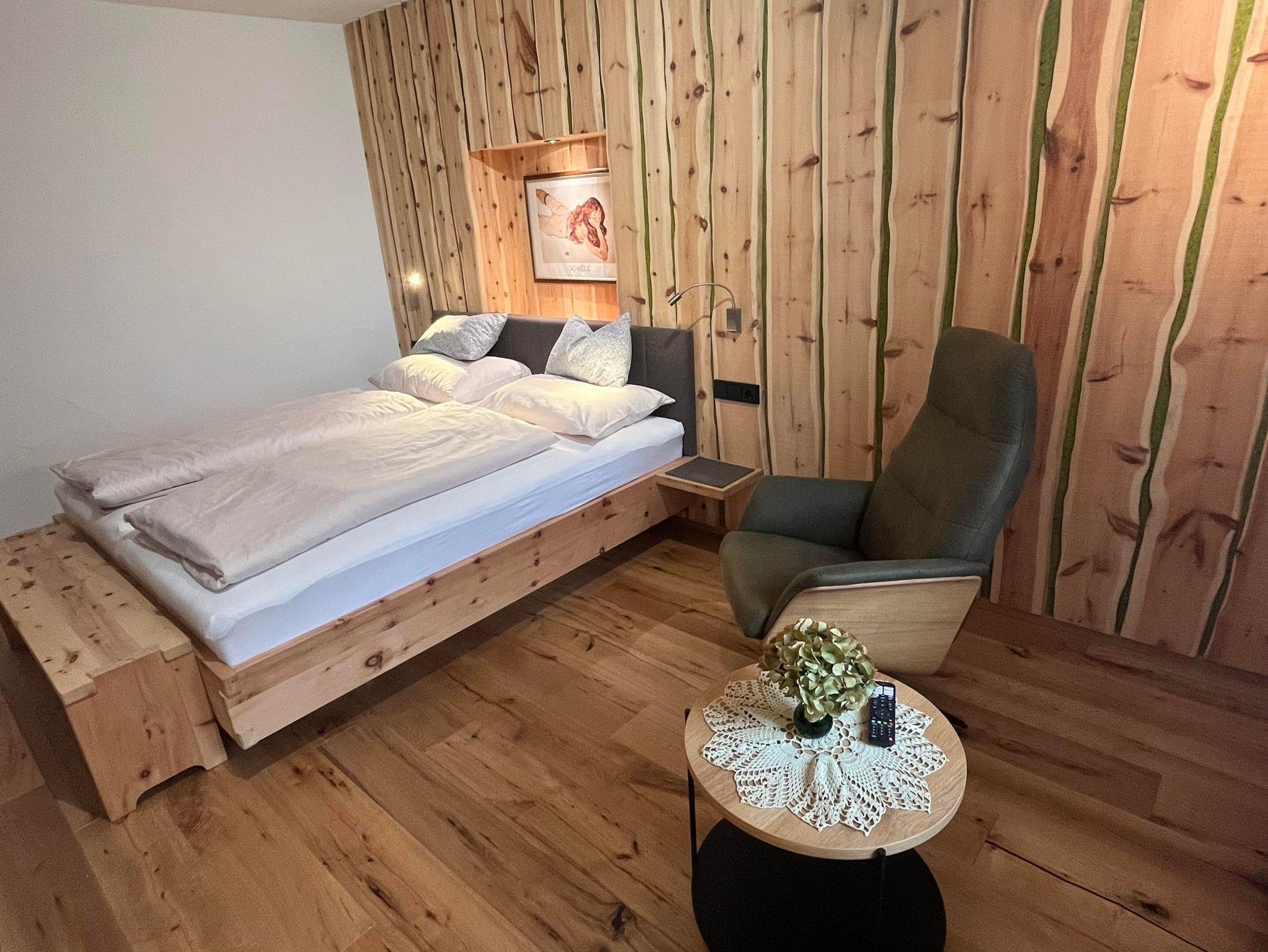 Neues, gemütliches Doppelbett-Zimmer aus heimischen Zirbenholz - zentralgeheizt, schönes Bad mit Dusche und WC;
