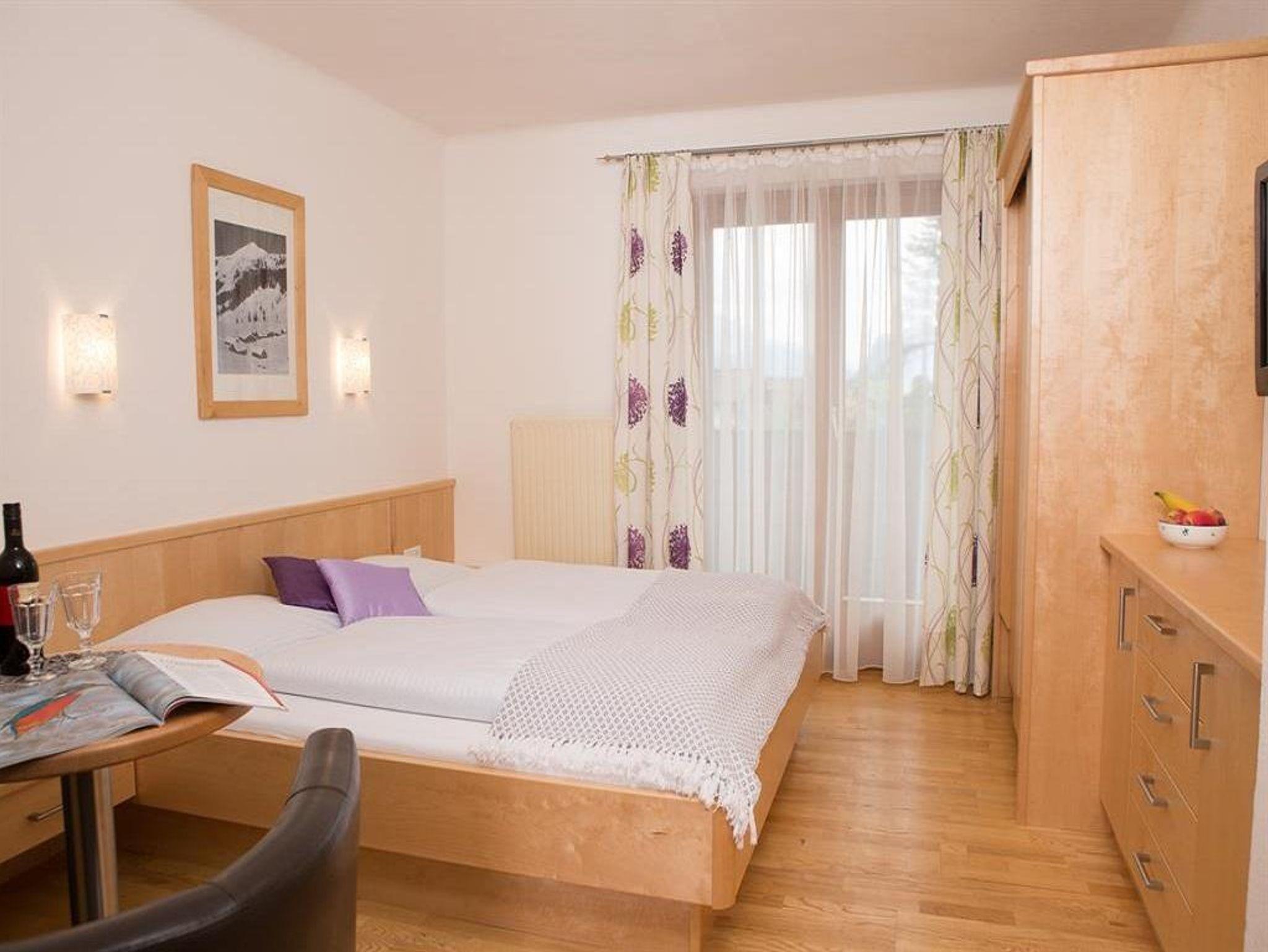 Doppelbett-Zimmer mit DU/WC, Couch, TV, Radiowecker und Balkon.