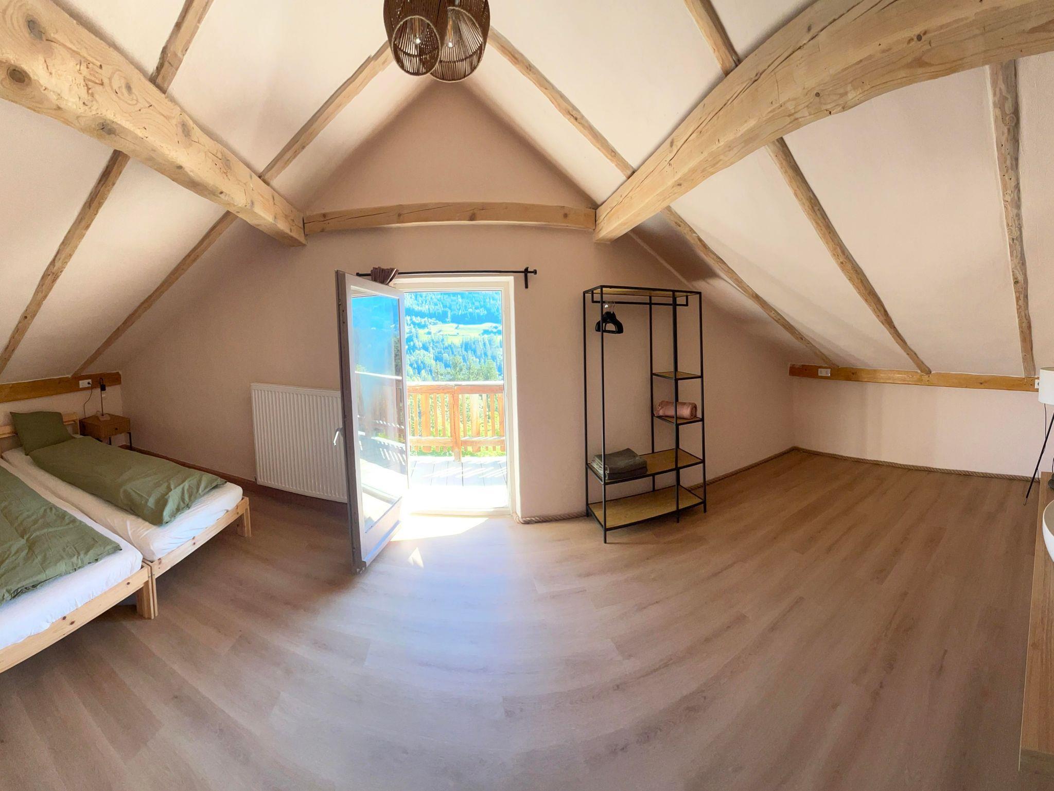 Im Mittelpunkt steht die große Wohnküche mit komplett ausgestatteter Küche, amerikanischem Kühlschrank, großem Ofen und 5-Platten-Herd. Der Esstisch bietet Platz für 10 Personen, die Sitzecke mit Holzofen lädt zum Aufwärmen und Erzählen ein.