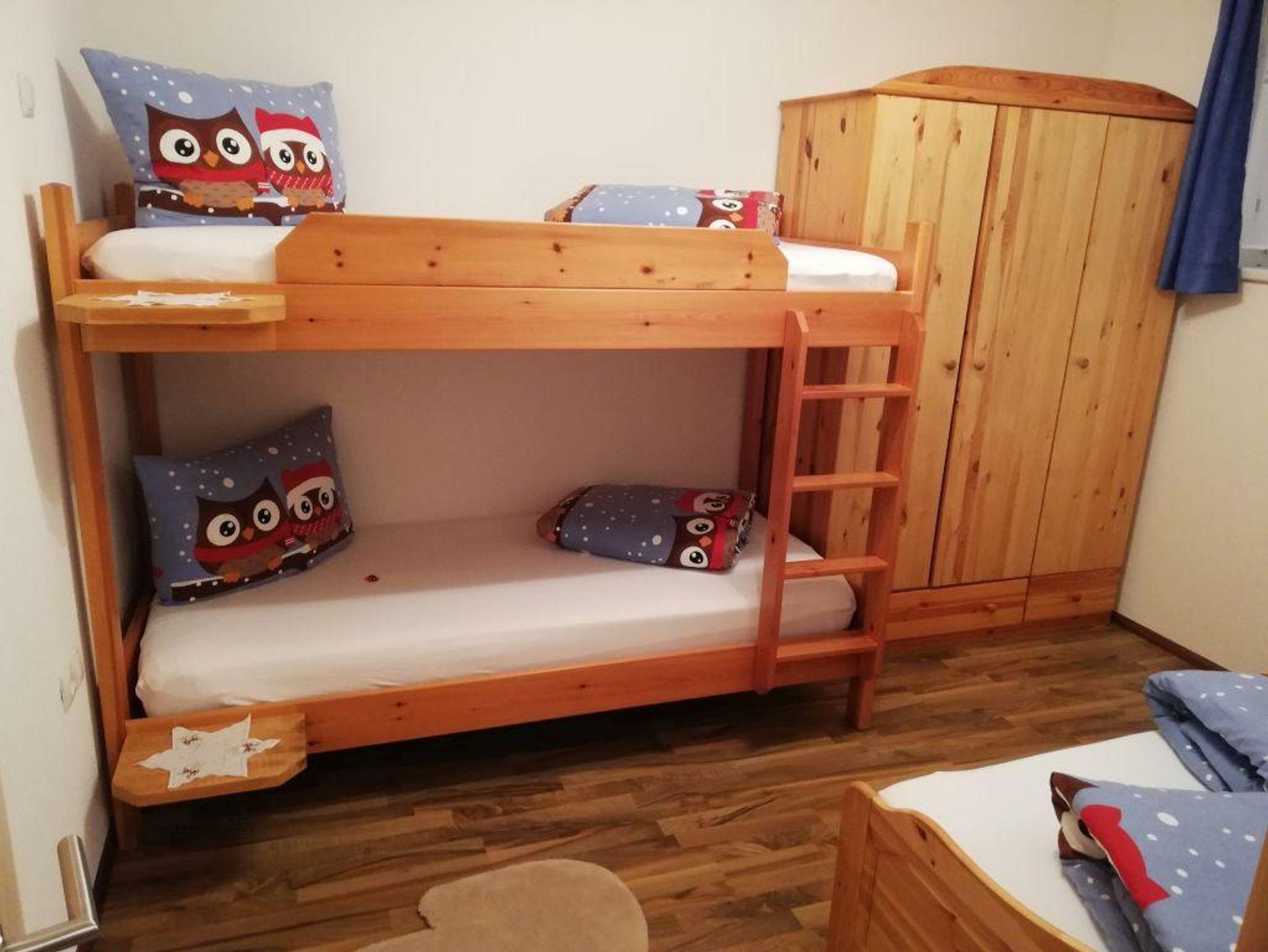 Eigener Eingang zum Apartment und gratis W-LAN/Wifi. Die Küche ist mit einem Küchenblock, vielen Küchenutensilien, (sowie Salz, Pfeffer, Zucker, versch. Tees, Spülmittel, Geschirrspültabs, Spül- und Geschirrtücher, usw.) 4 Platten Herd, Backofen, Dampfabzug, Kühlschrank mit Gefrierfach, Geschirrspüler, Kaffeemaschine, Toaster, Stab und Handmixer, Wasserkocher, großem Tisch mit Eckbank, und einem SAT TV ausgestattet. Unser Brötchenservice von Montag bis Samstag(außer Feiertage) verwöhnt sie mit frischem Gebäck zum Frühstück! Das Wohnzimmer ist mit einem gemütlichen Ecksofa und Tischchen für nette Spielabende, sowie einem großen SAT Fernseher ausgestattet. Das Apart bietet drei separate Vollholz Schlafzimmer. Zwei Zimmer sind mit einer Verbindungstür verbunden. Bad mit Dusche, WC und Doppelwaschbecken, WC extra, Garderobe, Terrasse, Liegewiese.