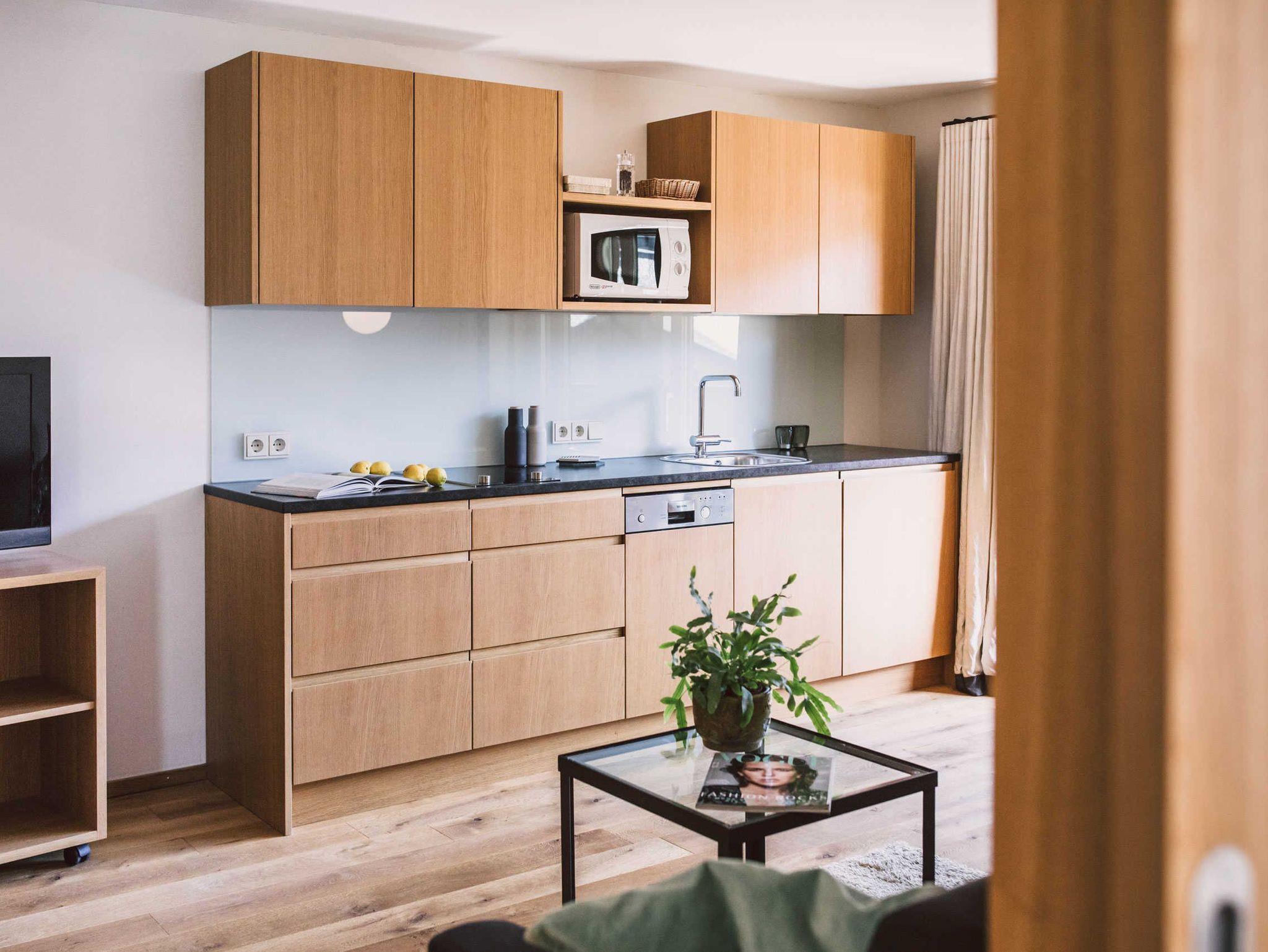 Die Apartments bestehen aus einem Schlafzimmer aus Zirbenvollholz, Panoramafenster mit Blick in die herrliche Bergwelt, Eichenvollholzboden, Wohn und Küchenbereich mit gemütlichen Sitzsofa und voll ausgestattete Küche mit Nespresso Kaffee Maschine, Herd, Mikrowelle, Geschirrspüler und Kühlschrank mit Gefrierfach.