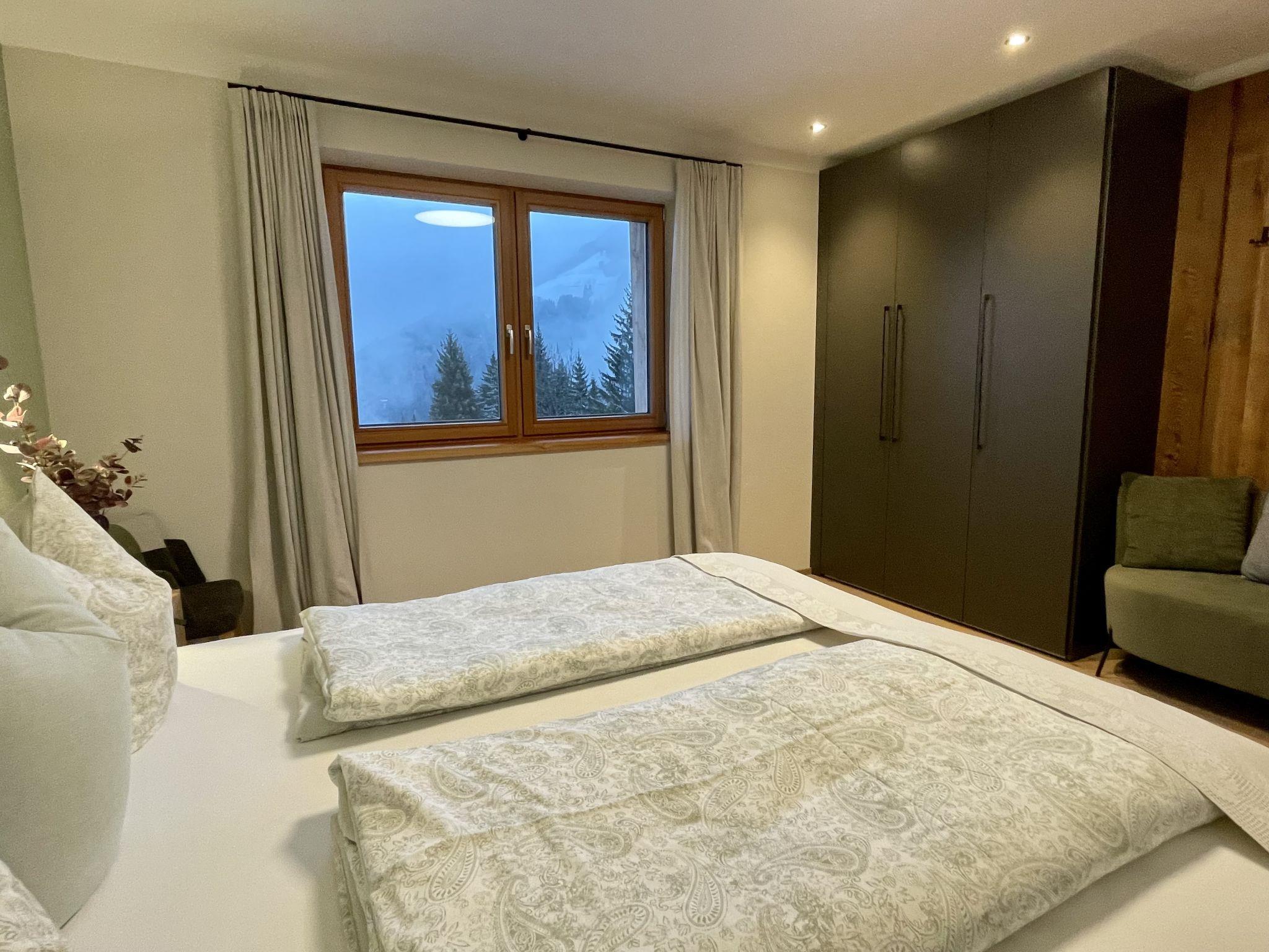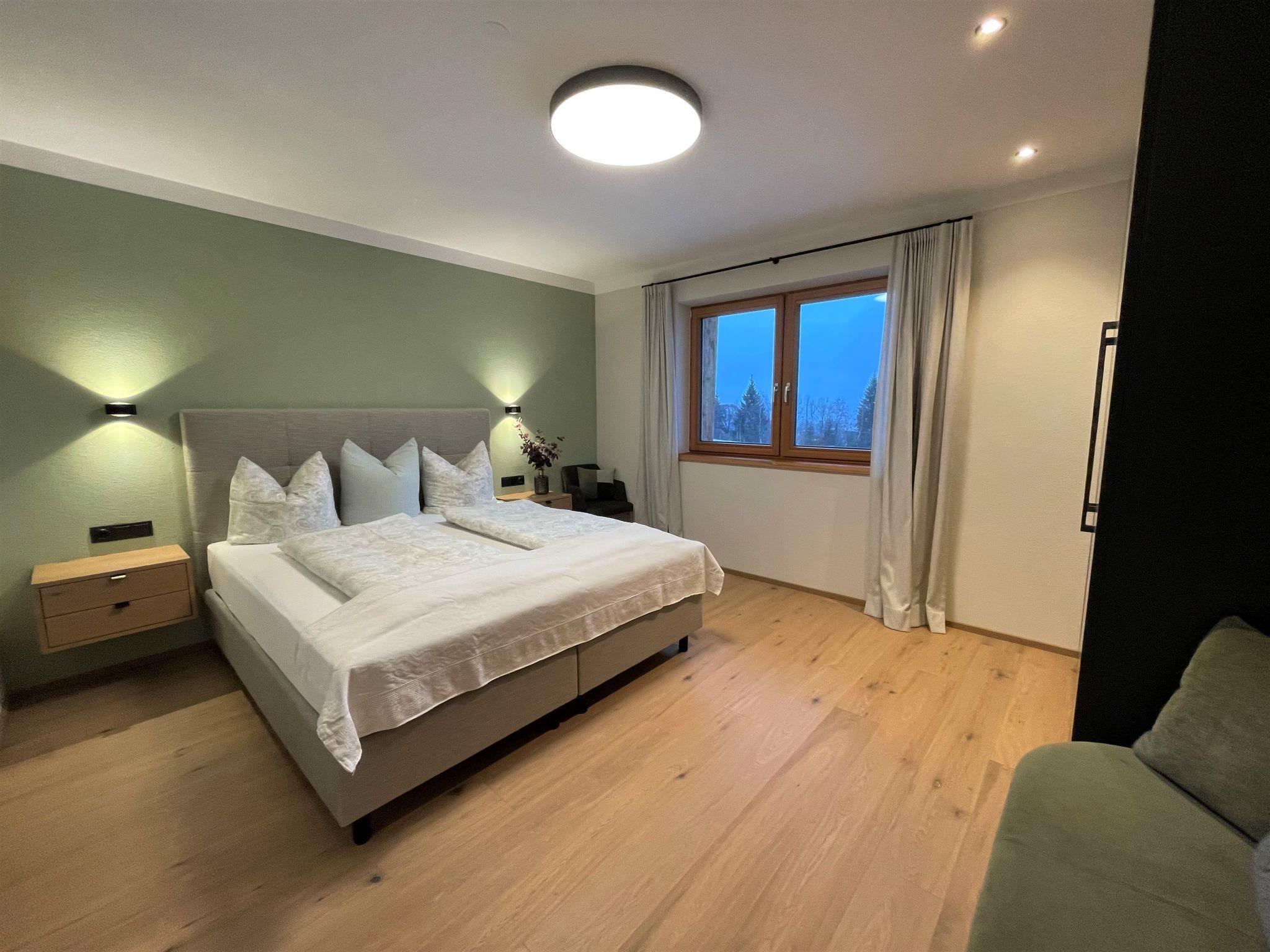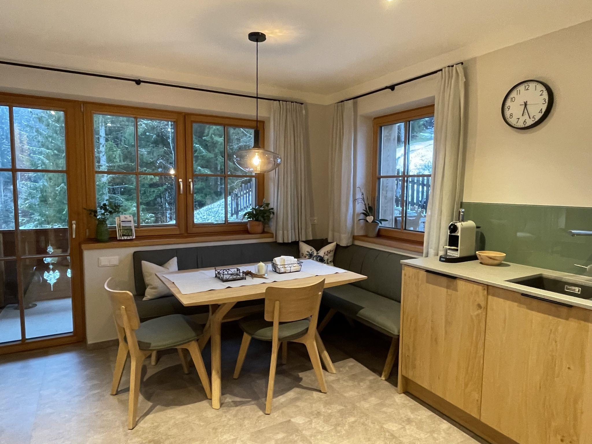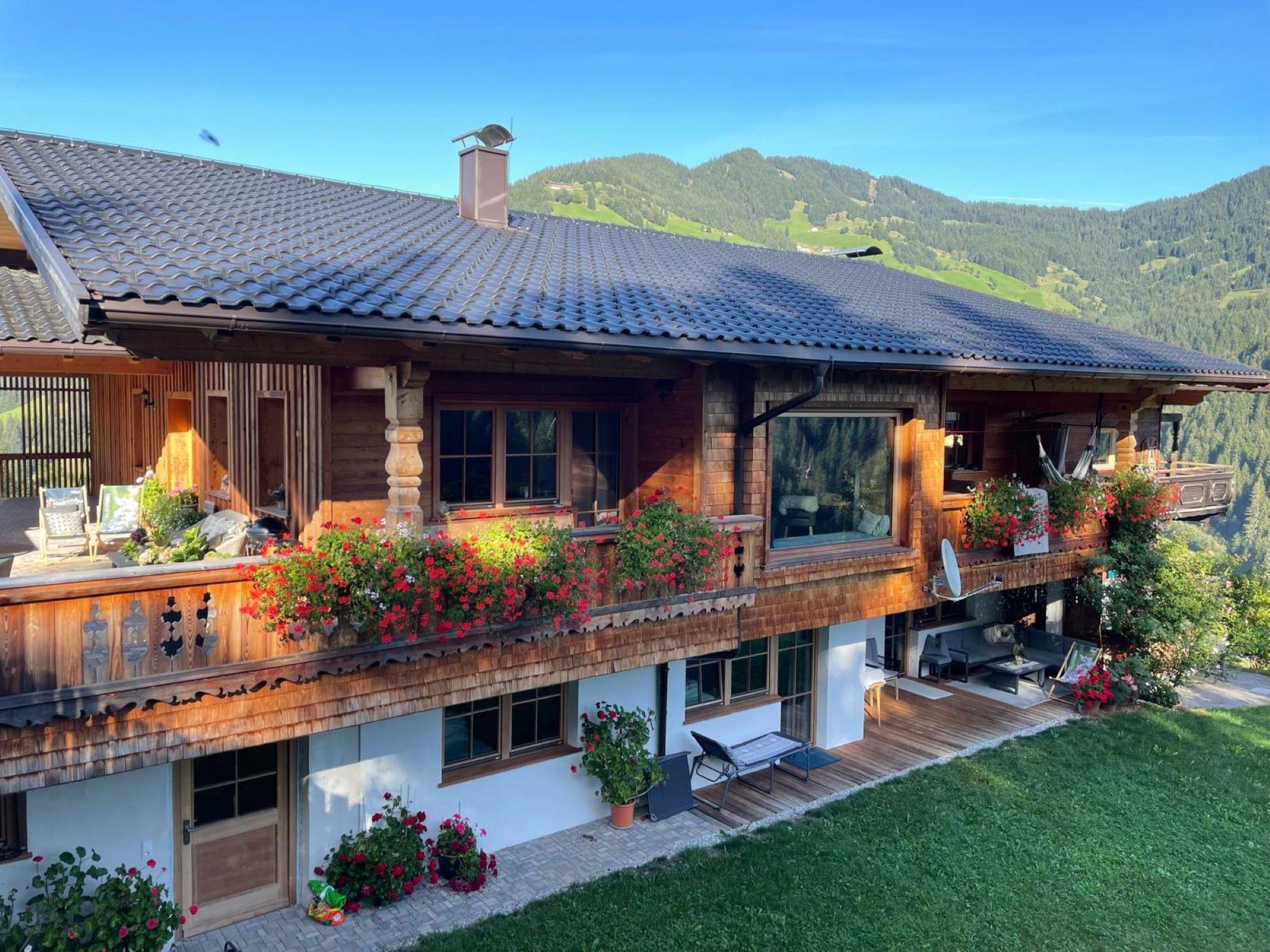 "Chalet Holzerjuwel", 7-room apartment 170 m2, on the ground floor. Bright, very comfortable and tasteful furnishings: entrance hall. 1 double bedroom with satellite TV. Exit to the terrace. 3 double bedrooms, each room with shower/WC and satellite TV. Office with 1 bed and satellite TV. Large kitchen-/living room (oven, dishwasher, 4 ceramic glass hob hotplates, toaster, kettle, electric coffee machine, Capsules for coffee machine (Nespresso)) with dining nook and satellite TV. Exit to the terrace. Shower/WC, sep. WC. Underfloor heating. Wooden floors. 2 large terraces 18 m2. Terrace furniture, electric barbecue, deck chairs (4), box-room. Marvellous panoramic view of the mountains and the valley. Facilities: children's high chair, baby cot, hair dryer. Internet (WiFi, free). Parking (4 cars). Please note: non-smokers only. Private entrance, fire extinguisher. No internal connecting door between the separated properties. Ideal accommodation for home office activities or for a "Workation" - thanks to the extra powerful business WLAN.