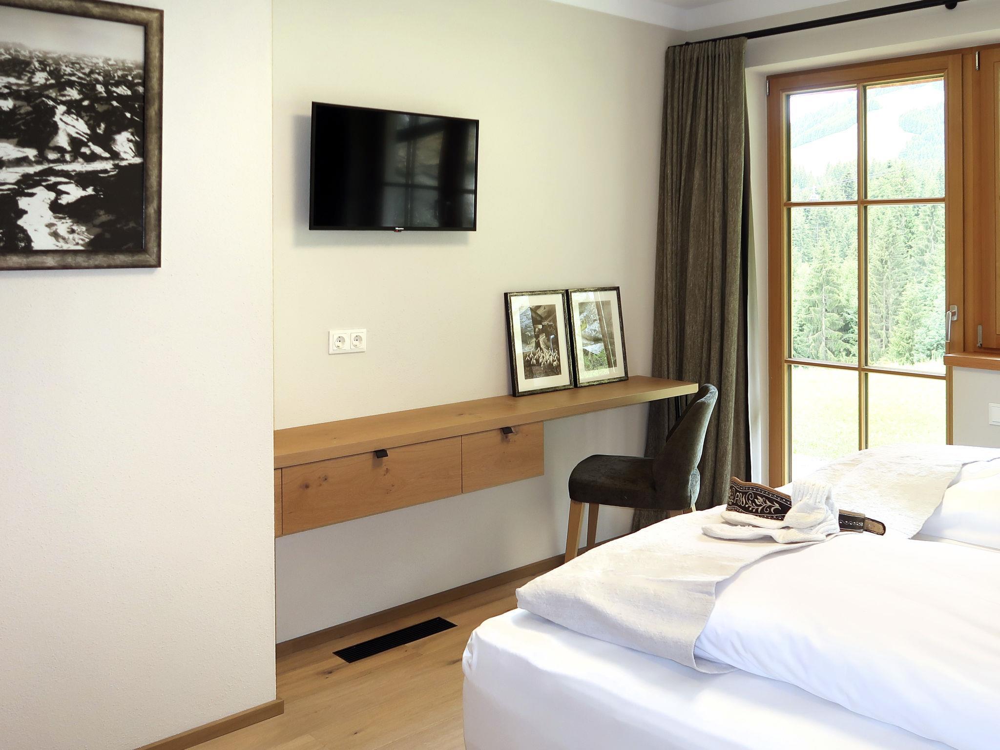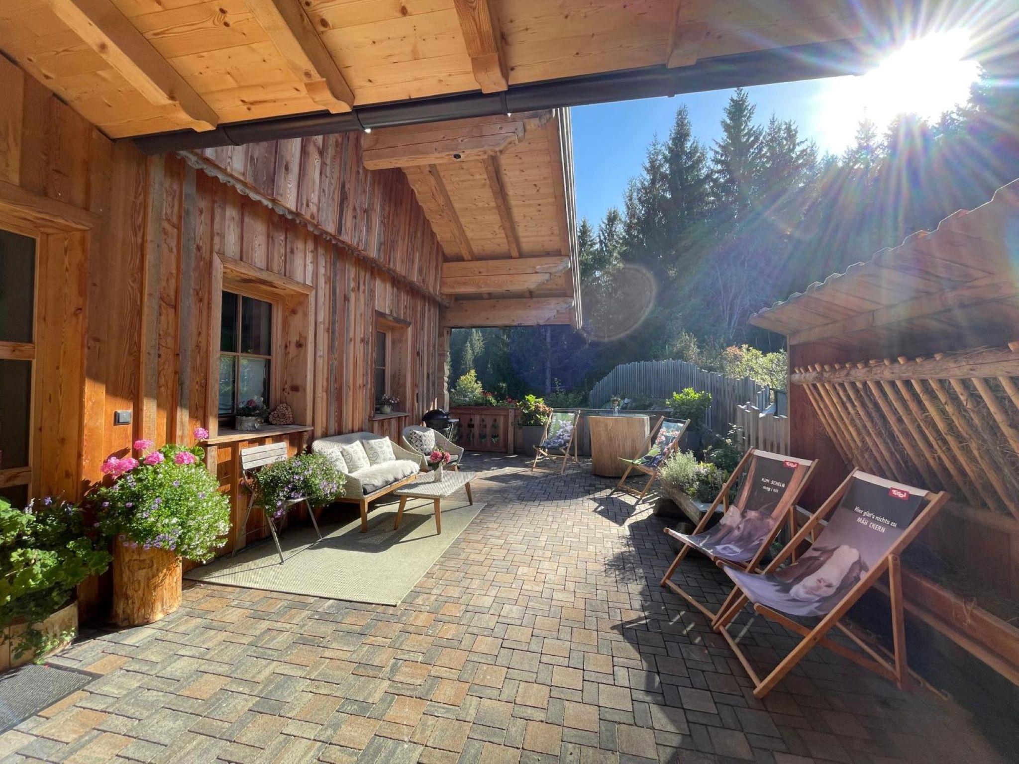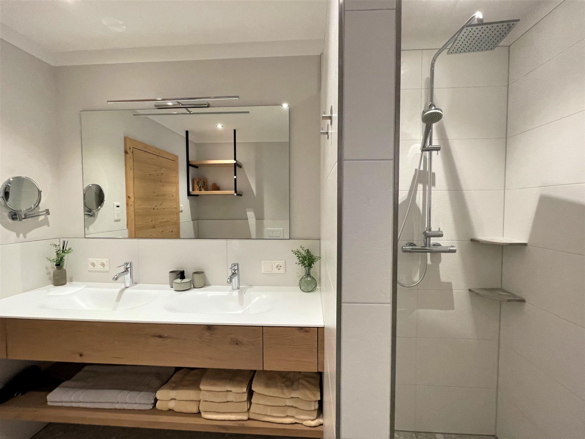 "Chalet Holzerjuwel", 7-room apartment 170 m2, on the ground floor. Bright, very comfortable and tasteful furnishings: entrance hall. 1 double bedroom with satellite TV. Exit to the terrace. 3 double bedrooms, each room with shower/WC and satellite TV. Office with 1 bed and satellite TV. Large kitchen-/living room (oven, dishwasher, 4 ceramic glass hob hotplates, toaster, kettle, electric coffee machine, Capsules for coffee machine (Nespresso)) with dining nook and satellite TV. Exit to the terrace. Shower/WC, sep. WC. Underfloor heating. Wooden floors. 2 large terraces 18 m2. Terrace furniture, electric barbecue, deck chairs (4), box-room. Marvellous panoramic view of the mountains and the valley. Facilities: children's high chair, baby cot, hair dryer. Internet (WiFi, free). Parking (4 cars). Please note: non-smokers only. Private entrance, fire extinguisher. No internal connecting door between the separated properties. Ideal accommodation for home office activities or for a "Workation" - thanks to the extra powerful business WLAN.