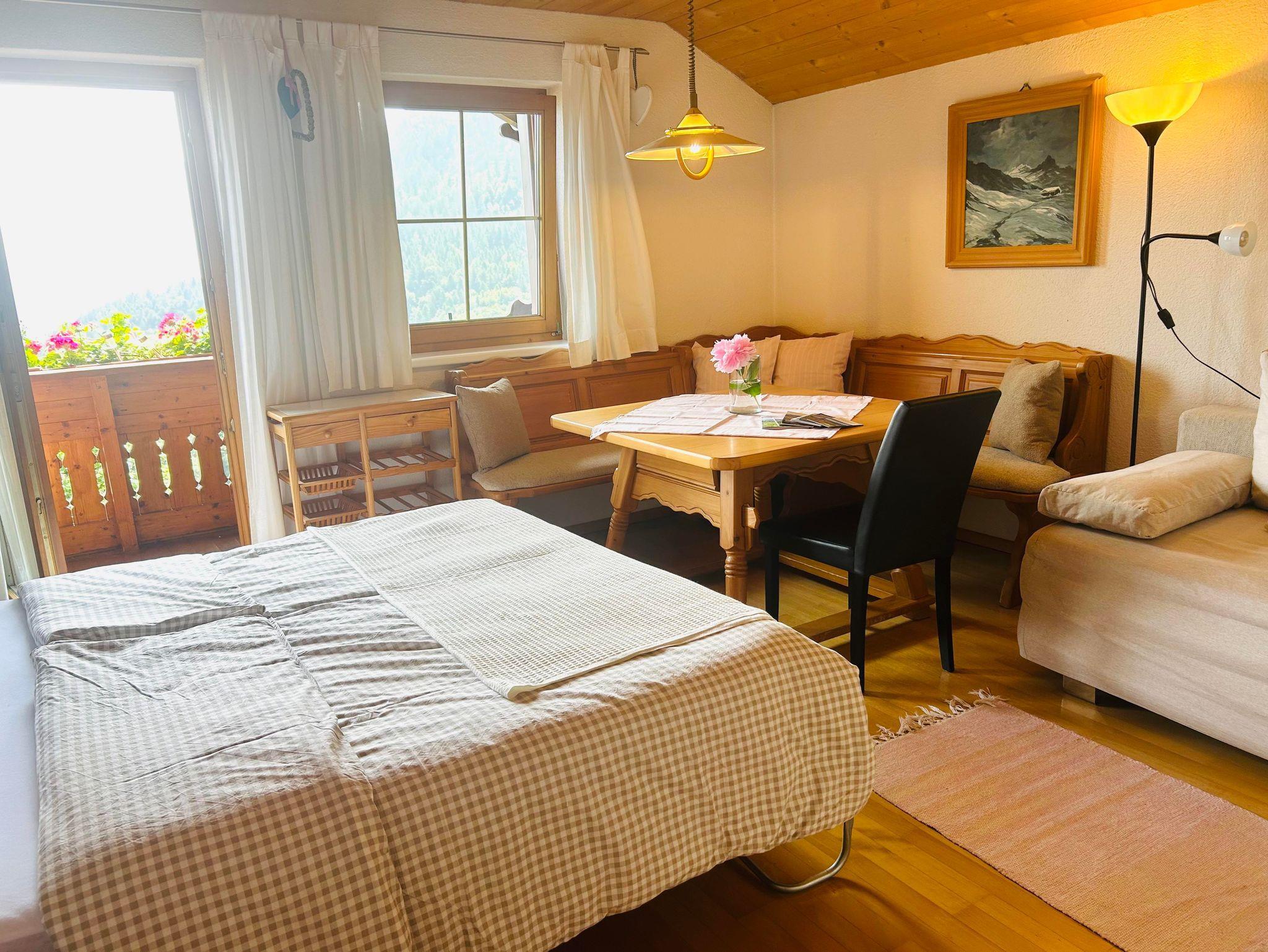Eine geräumige Eingangshalle, ein gemütliches Wohnzimmer (inkl. Schrankbett für 1 Person bei Bedarf), TV, Internet, Esstisch, gemütliche Couch und Zugang zum Balkon mit Bergsicht für gemütliche Stunden.