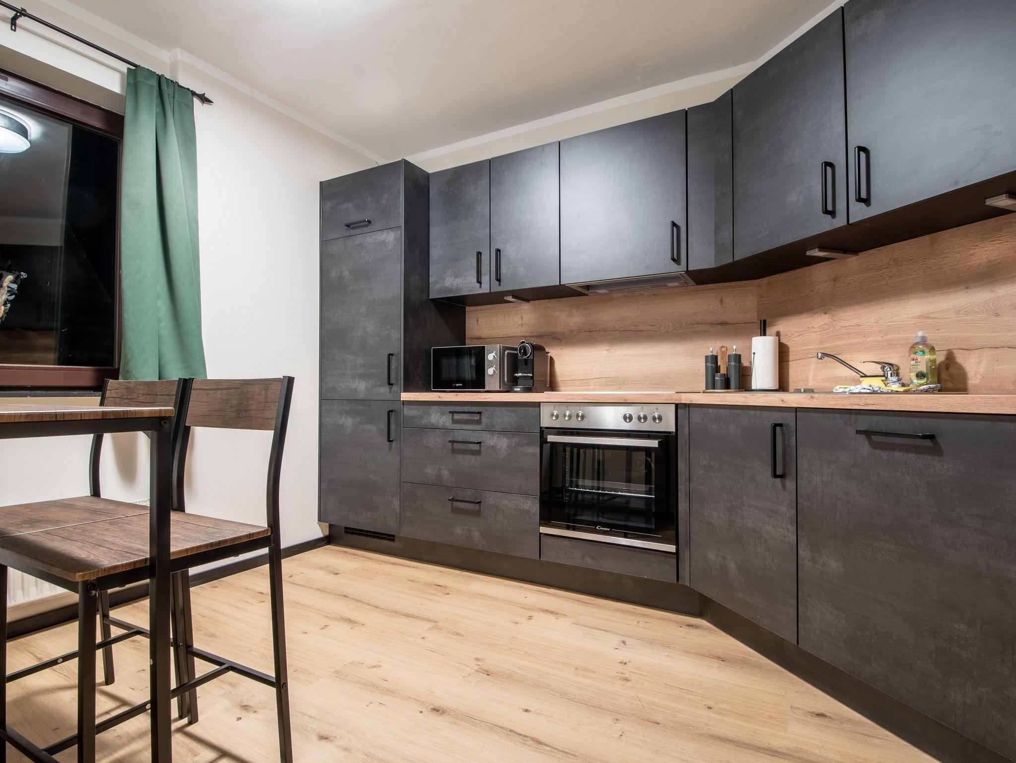 RAUM FÜR ENTSPANNUNG UND GESELLIGKEIT Das großzügige Gamskarkogel Appartement, ideal für 4 bis 6 Personen, verfügt über separate Schlafbereiche, eine vollausgestattete Küche und ein Wohnzimmer mit einem Esstisch für 6 Personen. Genießen Sie den Komfort von getrennten Bad- und WC-Bereichen und entspannen Sie auf dem Balkon. Die naturnahe Einrichtung mit lebendigen Moosakzenten unterstreicht unser Engagement für Nachhaltigkeit und Wohlbefinden.