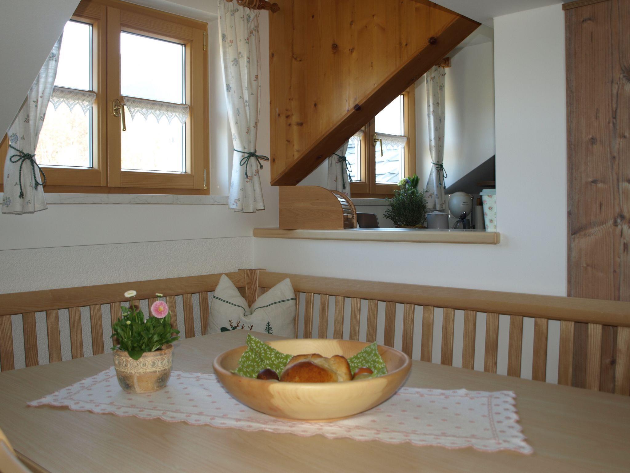 Die Wohnung befindet sich im Dachgeschoß unseres Hauses, die Sie bequem über unseren neu errichteten, seperaten Eingang über eine Wendeltreppe erreichen. Vor dem Eingang der Wohnung befindet sich eine sehr sonnige Terrasse mit wunderschönem Ausblick auf die umliegende Bergwelt. Hier befindet sich wiederum eine Sitzgelegenheit und Liegestühle - zum Relaxen.