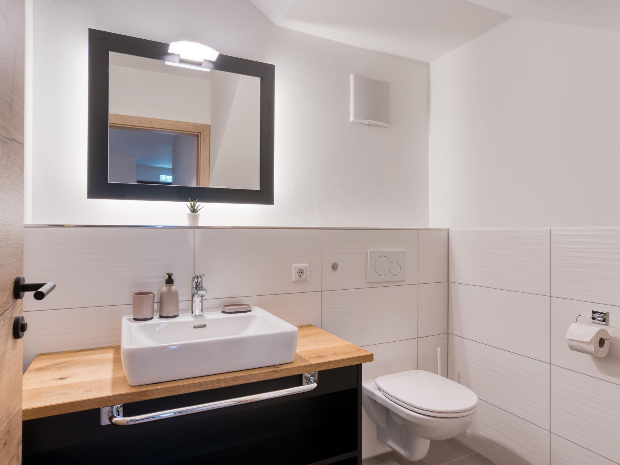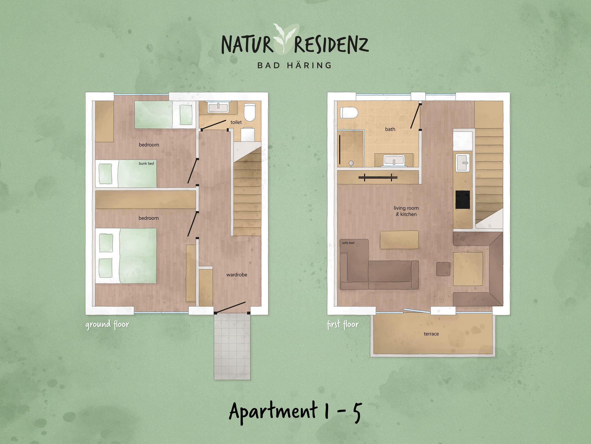 Herzlich willkommen in den gemütlichen und stilvoll eingerichteten Apartments von der Natur Residenz Bad Häring.Das Apartment 1 ist Dein zu Hause auf Zeit im malerischen Bad Häring. Großzügige 60m² warten darauf von dir bewohnt zu werden. Das Apartment 1 überstreckt sich über zwei Etagen. Im Erdgeschoß befinden sich insgesamt zwei Schlafzimmer. Eines der Schlafzimmer verfügt über ein Doppelbett während im anderen Schlafzimmer ein Stockbett sowie ein Einzelbett vorzufinden sind. Das Doppelzimmer ist dabei sehr gemütlich und besonders, da Altholzelemente liebevoll an der Wand positioniert wurden. Neben den beiden Schlafzimmern befindet sich im Erdgeschoß zudem eine separate Toilette. Der erste Stock kann über eine schöne, beleuchtete Treppe erreicht werden. Oben, im ersten Stock angekommen, wartet das Highlight der Wohnung auf Dich: es ist der stilvolle Wohn- und Essbereich. Die Küchenzeile lädt zu Kochabenden aller Art ein und die zuvor zubereiteten Speisen können dann auf der gemütlichen Eckbank verzehrt werden. Weiters verfügt der Wohnraum über eine komfortable Couch auf welcher man entspannen und auf dem großen Smart-TV fernsehen kann. Einfach zurücklehnen und das herrliche Ambiente genießen, eine warme Dusche im angrenzenden Badezimmer nehmen oder auf dem ebenfalls angrenzenden Balkon die letzten Sonnenstrahlen des Tages einfangen. Das alles ist möglich in Deiner Natur Residenz Bad Häring. Das - und noch vieles mehr - also nichts wie los und ab in die Berge Tirols!