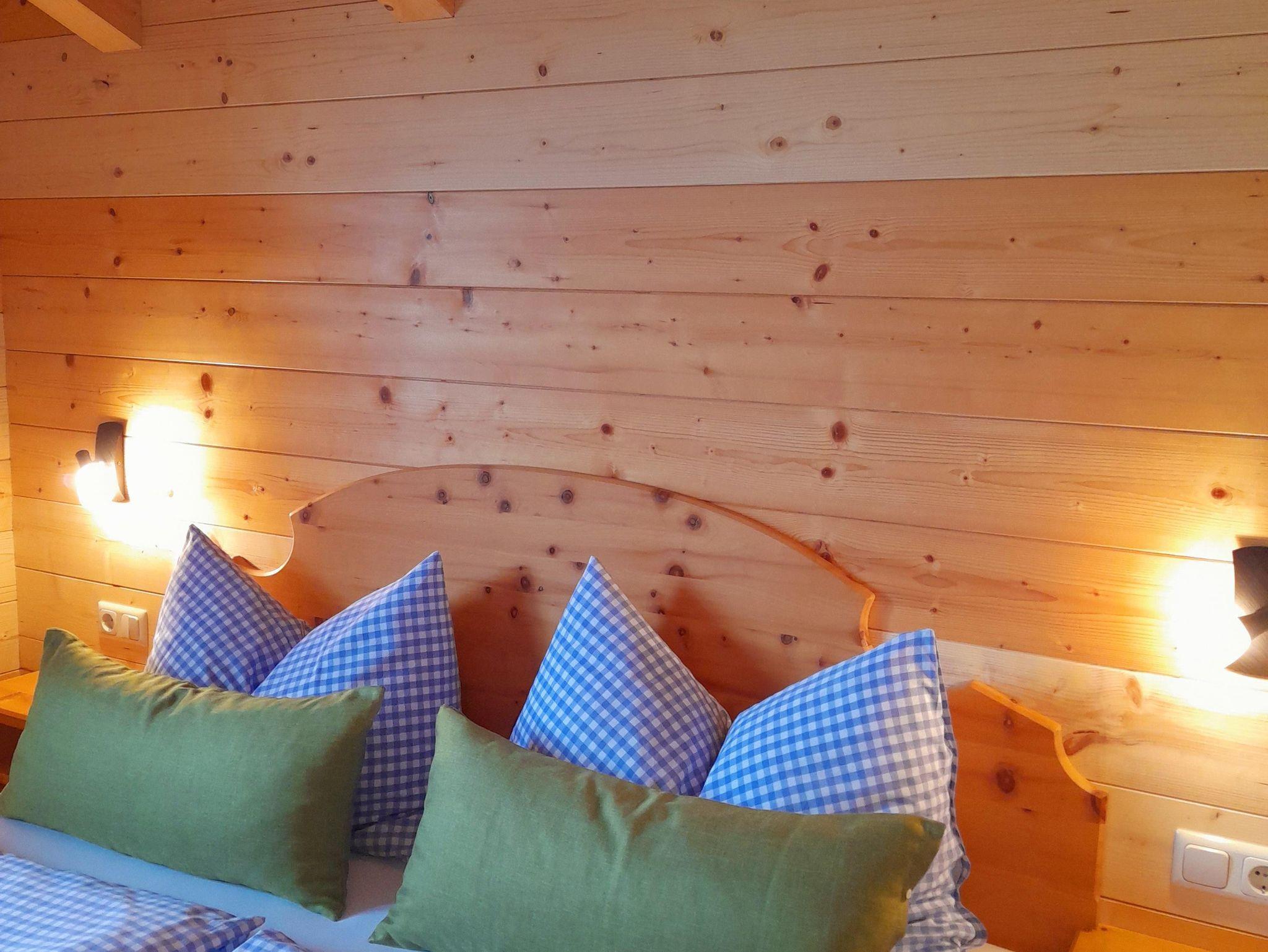 Sie schlafen herrlich im getrennten Schlafzimmer mit Betten aus ZIRBENHOLZ.