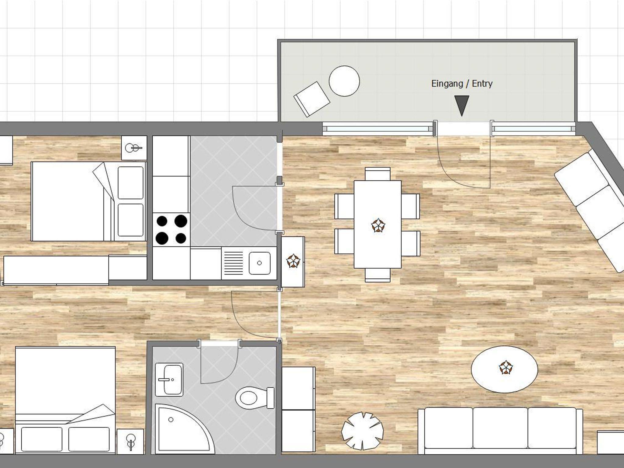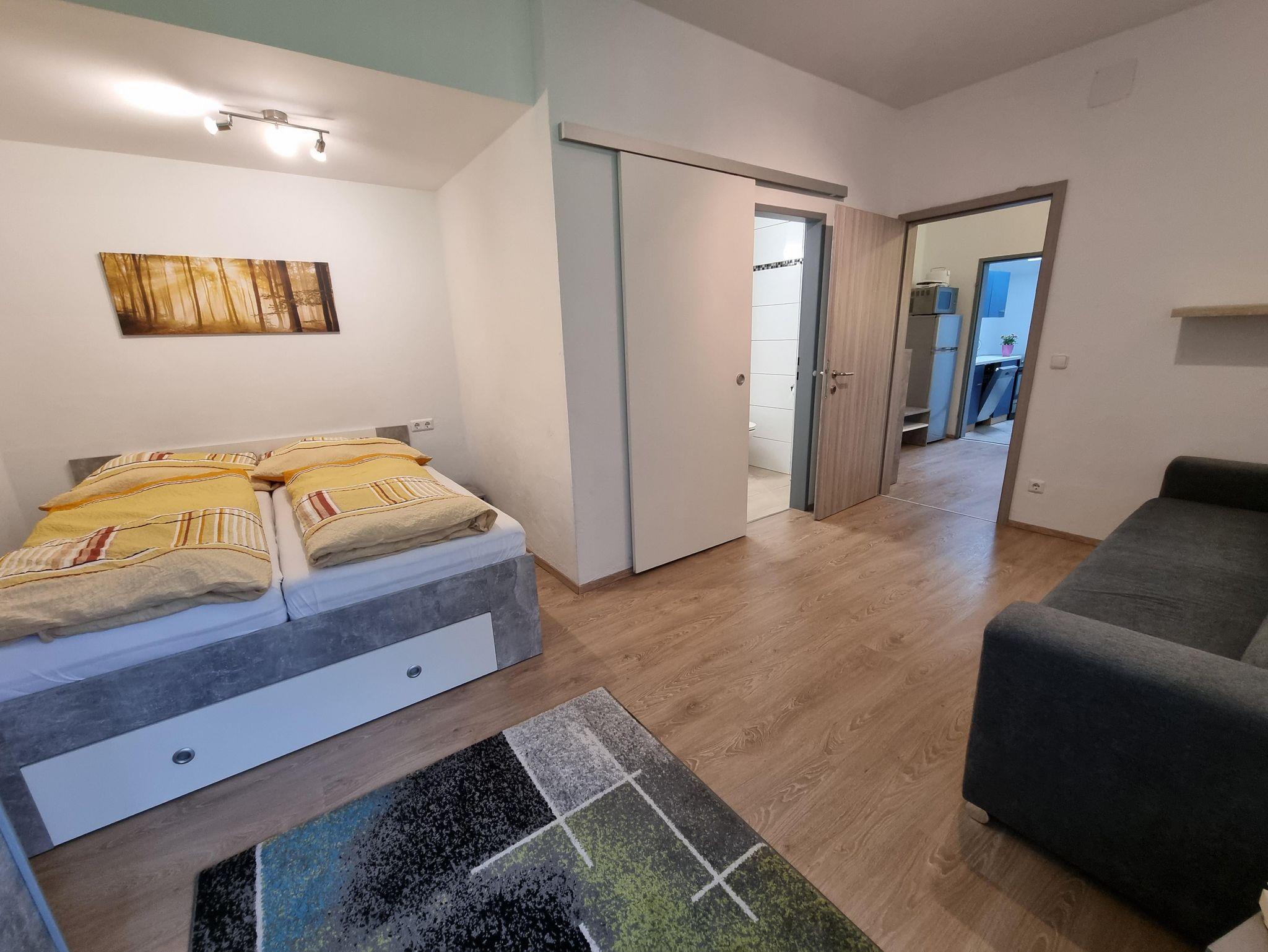 Das gemütliche Appartement bietet Platz für bis zu 6 Personen, bestehend aus 2 Schlafzimmern mit je einem Doppelbett, einem großen Wohn- / Essraum mit Doppelcouch und Schlafsofa, einer komplett ausgestatteten Küche (E-Herd, Backrohr, Mikrowelle, Kühlschrank mit Tiefkühlfach, Geschirrspüler, Kaffeemaschine, Toaster und Wasserkocher) sowie einem Badezimmer.