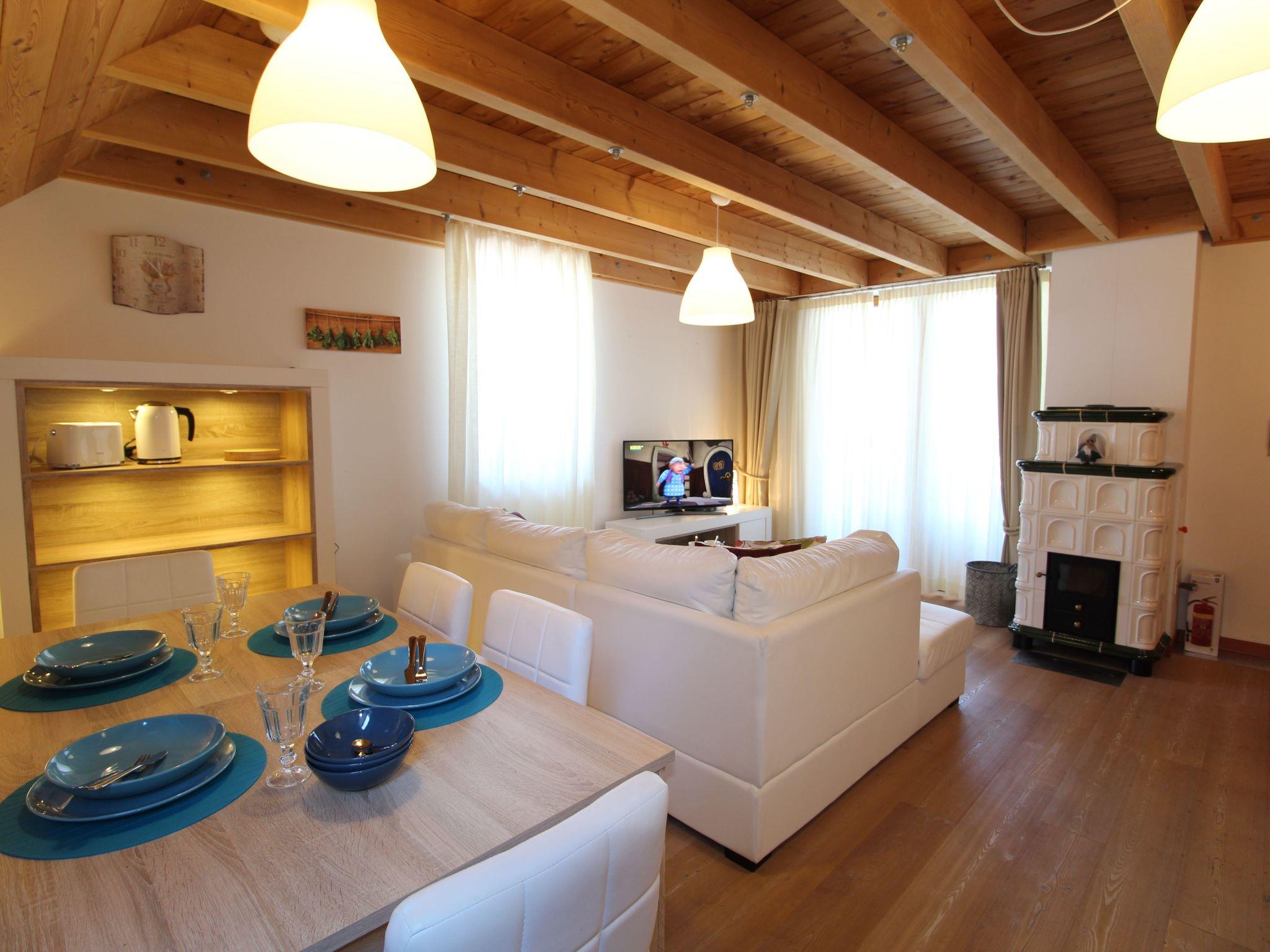 Inside, the flat has an inviting and warm atmosphere. It has three cosy double bedrooms that promise rest and relaxation after a long day on the slopes. Two complete bathrooms offer all the necessary amenities such as a toilet, washbasin, shower and bidet. The heart of the flat is the cosy living room, which is equipped with an integrated kitchen, a dining table for 6 people and a sofa. A special highlight is the traditional wood-burning stove, which provides cosy warmth. Access to a large balcony invites you to enjoy the fantastic view of the idyllic valley and the lively ski piste.