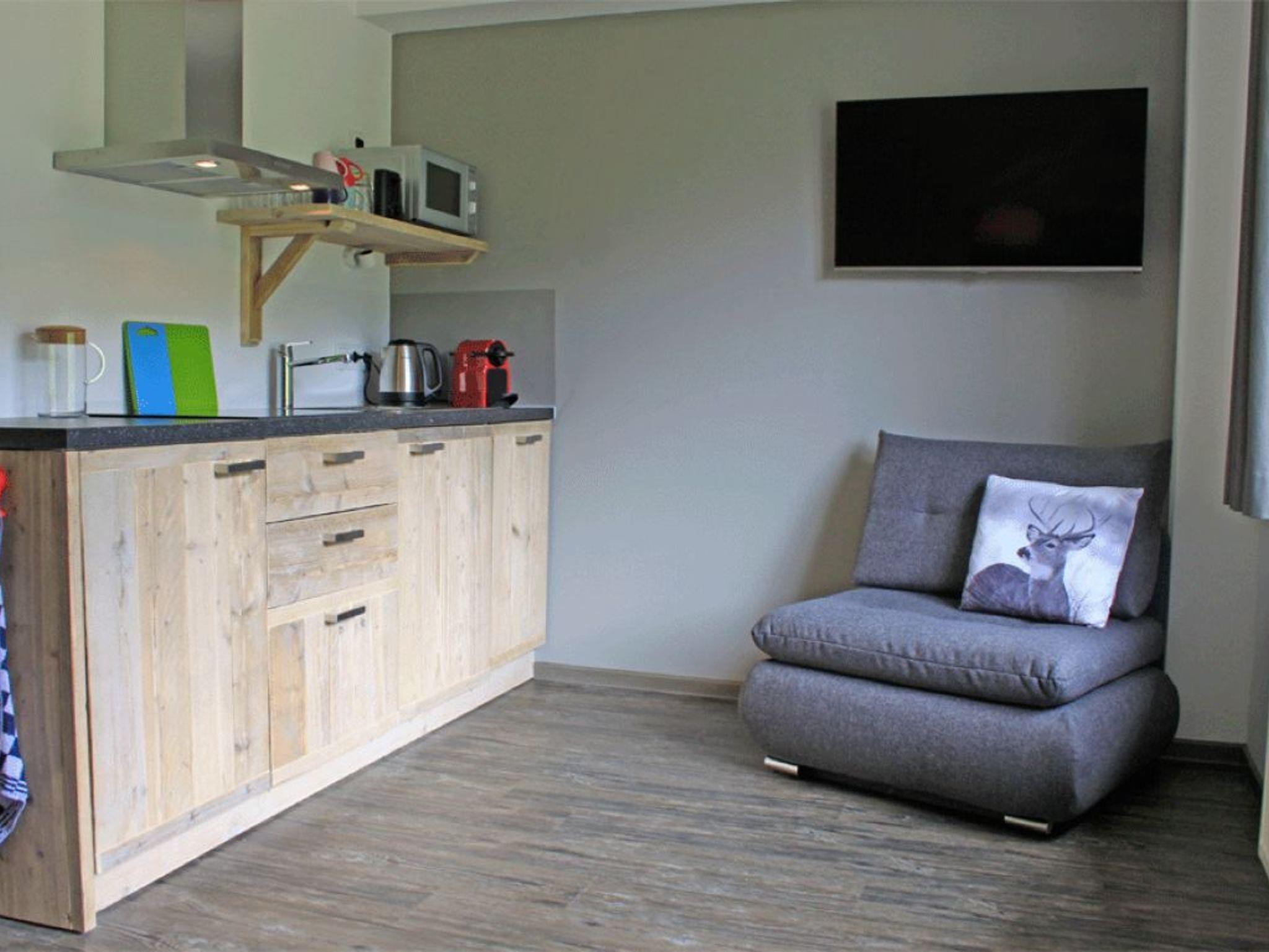• Eine komplett eingerichtete offene Küche inklusive einer Nespresso Kaffeemaschine;