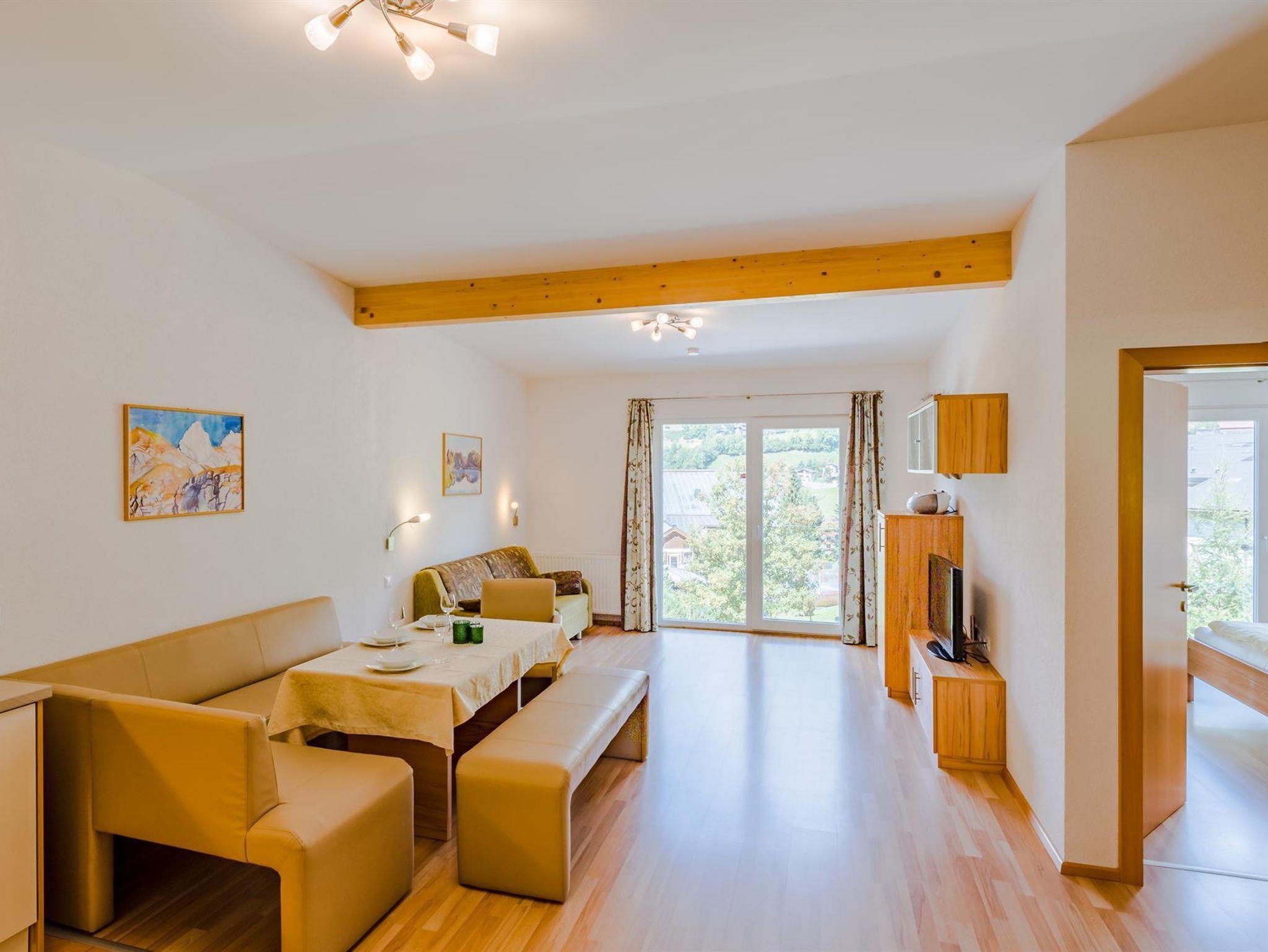 Das Apartment gliedert sich in folgende Räume: Windfang, Vorzimmer, Bad inklusive WC, Doppelbettschlafzimmer, Schlafzimmer mit einem Stockbett, großem Wohnzimmer mit einem ausziehbarem Sofa, Küche, Skistall und einer eigenen überdachten Terrasse mit Gartenmöbel. In der komplett ausgestatteten Küche befinden sich ein Geschirrspüler, eine Kaffemaschine, ein Toaster sowie eine Mikrowelle. Weiteres stehen Ihnen in jeder Wohnung Kabel TV und Radio zur Verfügung. Weiters können wir Ihnen in jedem Apartment WLAN zur Verfügung stellen.