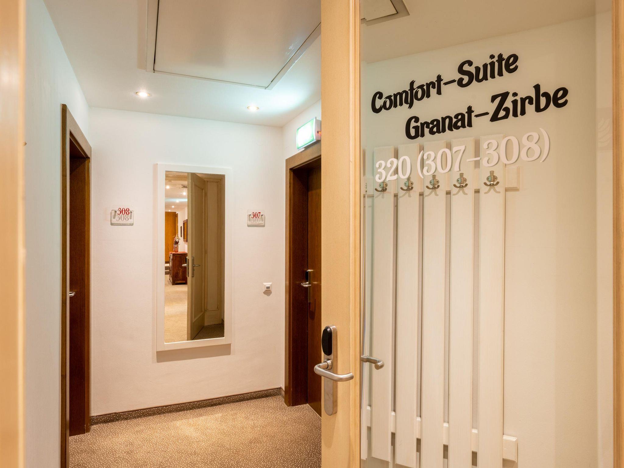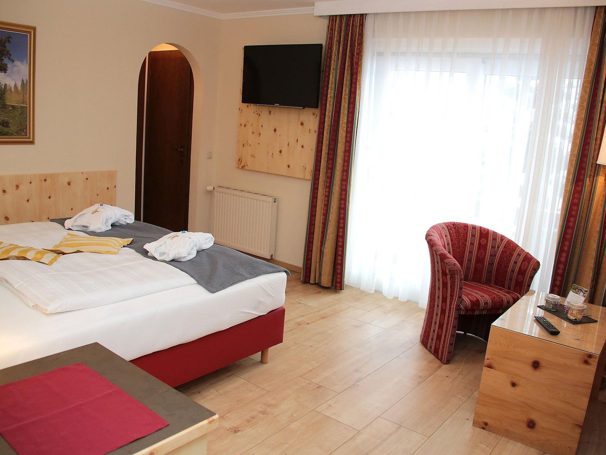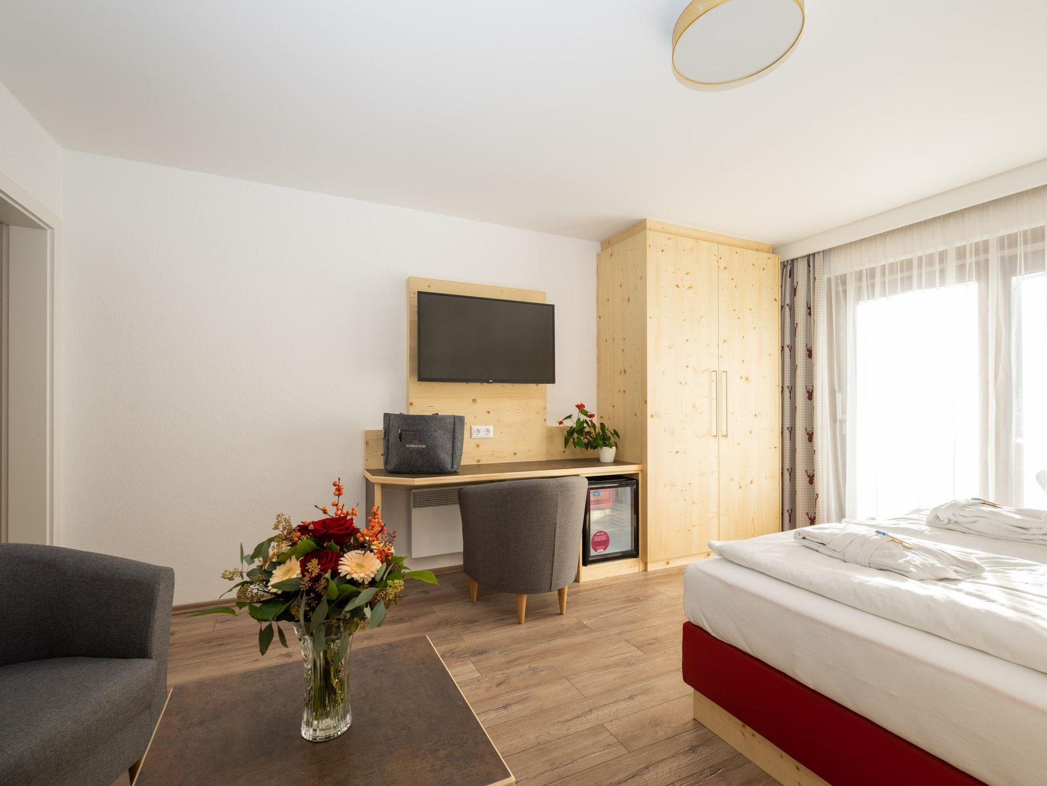 Doppelzimmer Zirbe-Birke Ca. 22 m² (für 1 bis 2 Personen), Ostbalkon oder Loggia, Gemütlicher Schlafraum und Wohnecke, Safe, Badezimmer mit Dusche und WC, Kosmetikspiegel, Föhn, Bademantel, Wellness-Korb, GRATIS WLAN