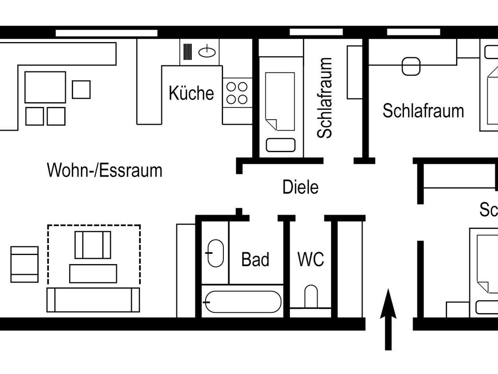 4 bis 6 Personen Appartement mit 3 getrennten Schlafräumen, Wohnraum mit ausziehbarer Couch, Küche mit Geschirrspüler, Bad mit getrenntem WC, SAT-TV, Telefon und Balkon.