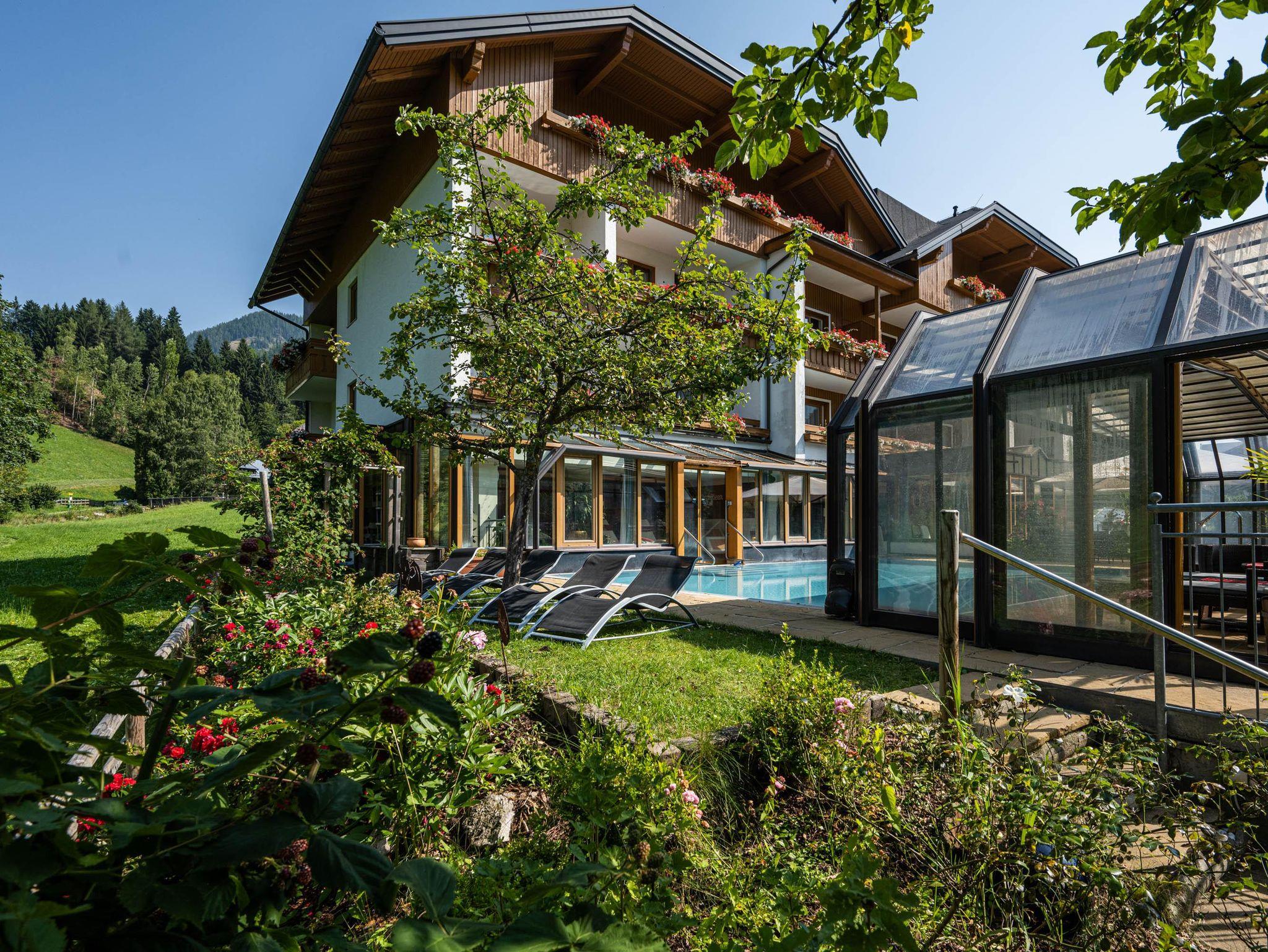 Willkommen im Hotel Almrausch mit der 500 Quadratmeter großen Wellnessoase auf zwei Ebenen. Freuen Sie sich auf jede Menge Relaxen, Energietanken und Kraftholen mit überdachtem, ganzjährig nutzbarem Pool (Sommer 29°C, Herbst/Winter 31°C), einer Saunaoase, verschiedenen Ruheräumen und bei wohltuenden Massagen. Sommerurlaub in Bad Kleinkirchheim