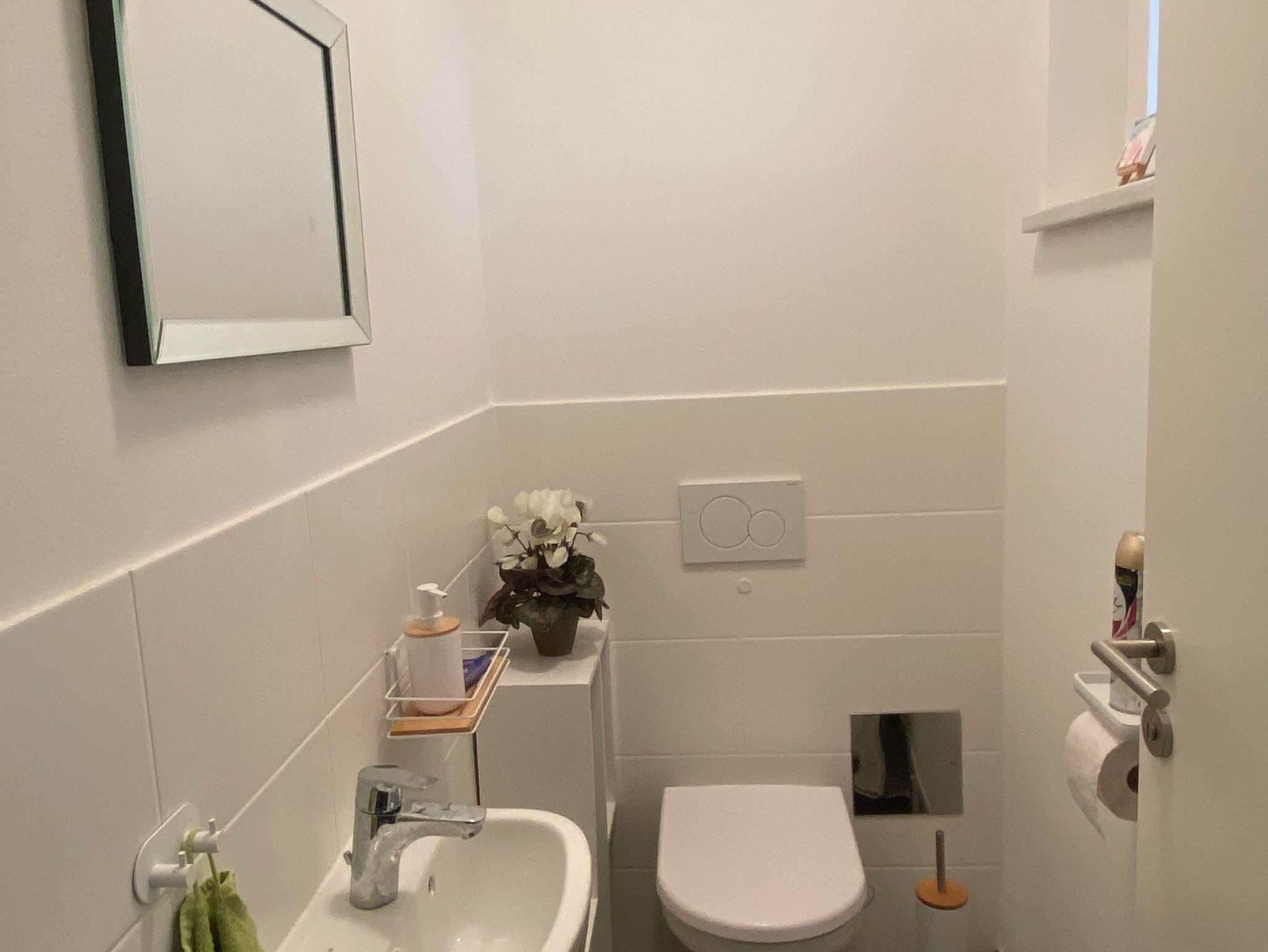 Bad mit Dusche und WC sind getrennte Räume und im Vorraum ist eine Waschmaschine angeschlossen.