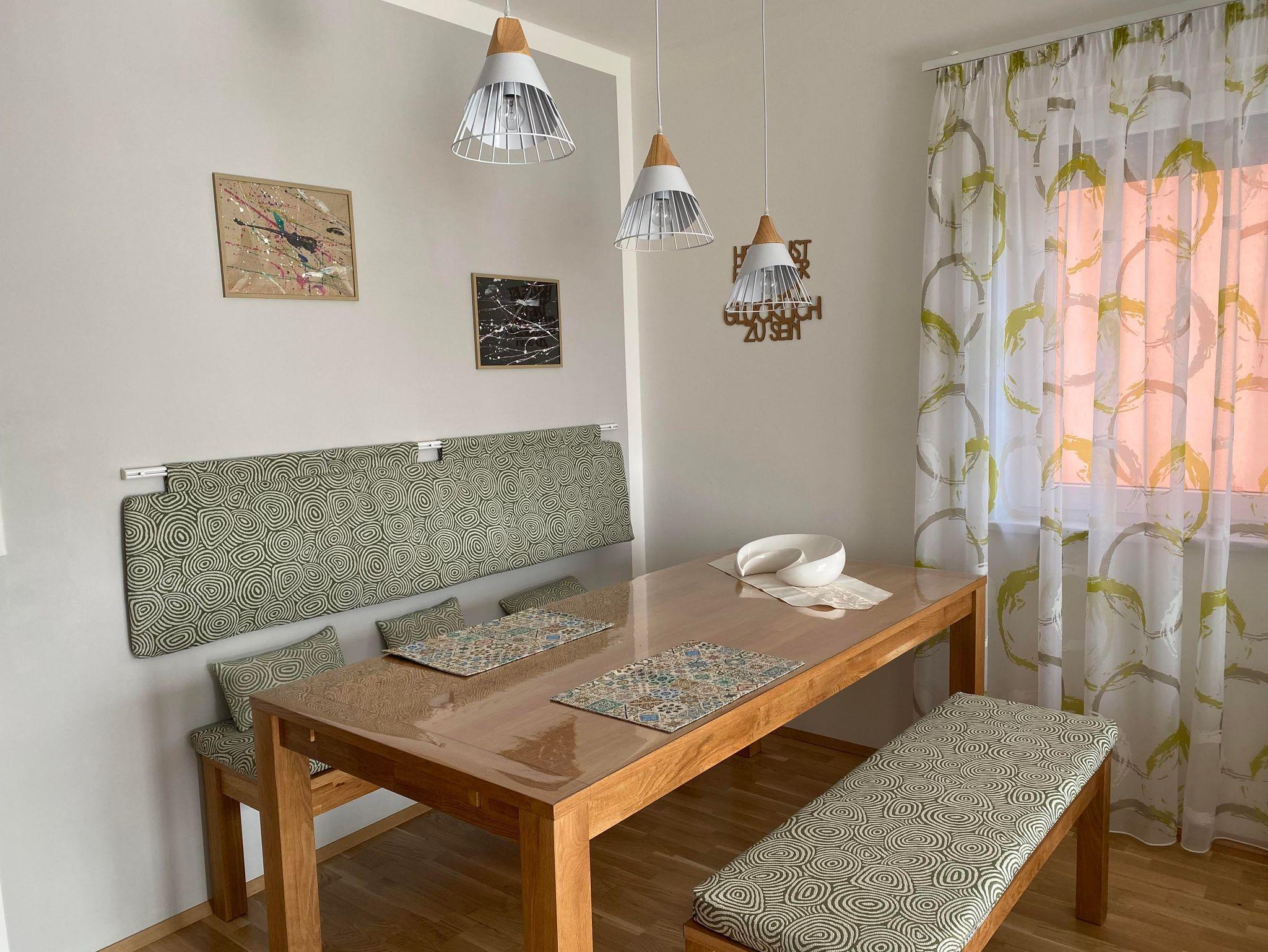 Sie bietet Platz für bis zu 5 Personen - ein Schlafzimmer für 2 Personen, ein Kabinett für 1 Person und eine ausziehbare Schlafcouch im Wohnzimmer für 2 Personen. Die Küche ist vollwertig und selbstverständlich auch bezüglich Geschirr etc. überkomplett ausgestattet.
