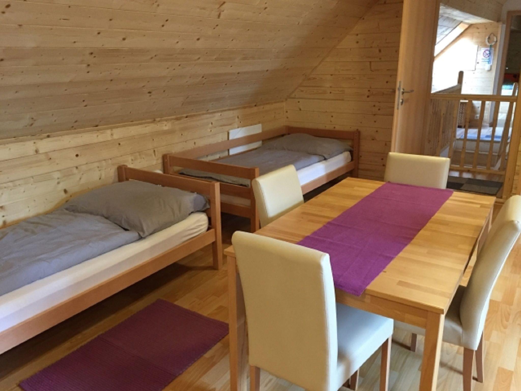 Unser voll eingerichtetes Familienzimmer ist ca. 30 qm groß und bietet Platz für bis zu 4 Personen. Das Zimmer befindet sich im Obergeschoss des Nebenhauses und verfügt über ein Schlafzimmer sowie 2 getrennte Betten im Wohnbereich. Das Schlafzimmer ist ausgestattet mit einem Doppelbett. Bettwäsche und Handtücher sind vorhanden.. Die Küchenzeile ist ausgestattet mit einem Kühlschrank,Teekocher sowie einer Kochplatte. Geschirr sowie Tisch- und Küchenwäsche ist vorhanden. Im Wohn-Essbereich gibt es einen Esstisch und einen Fernseher. Das Badezimmer verfügt über ein Waschbecken sowie Dusche und WC. Das Fenster im Badezimmer kann geöffnet werden.Zu diesen Zimmer gibt es auch eine Terasse. Ein Parkplatz steht kostenfrei zur Verfügung, auch Wlan kann kostenfrei genutzt werden. Das Zimmer ist ein Nichtraucherzimmer.