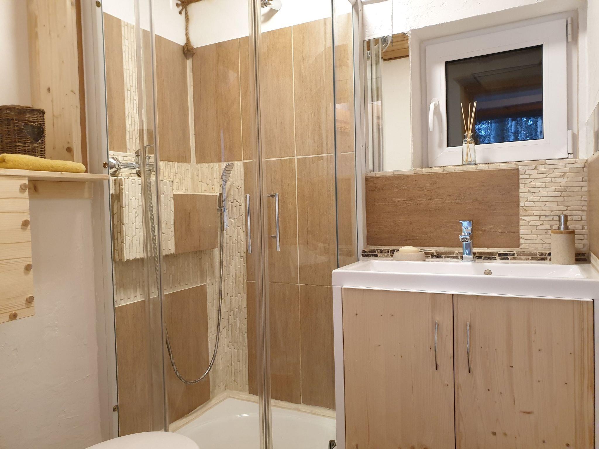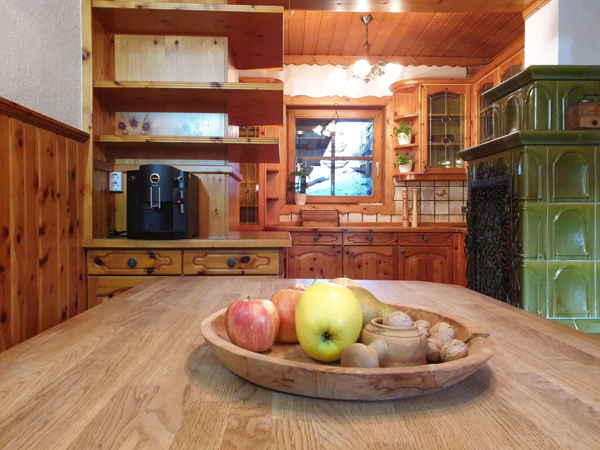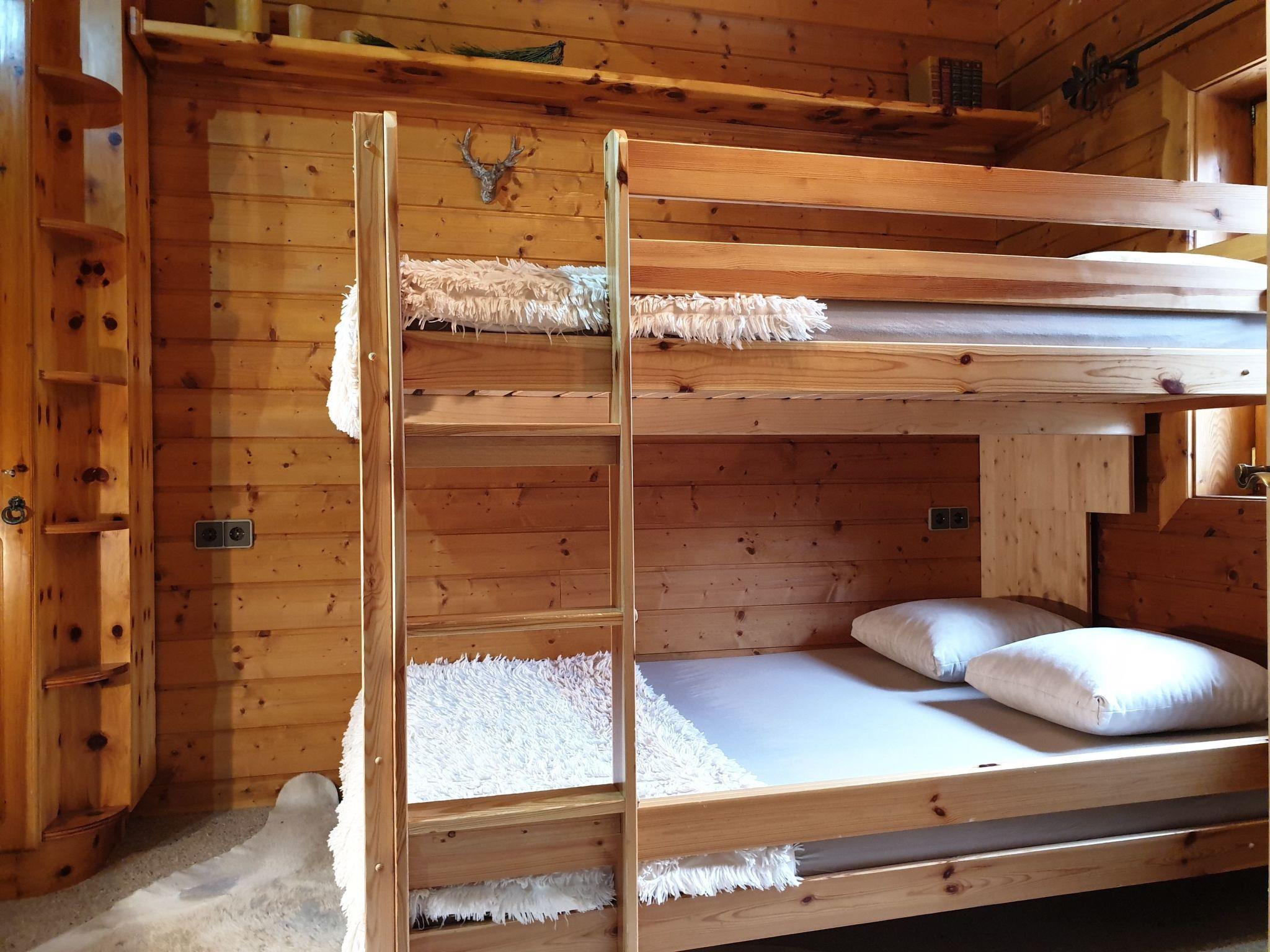The holiday flat on the upper floor, the Zirbenstüberl, with a living space of 95 m² offers space for 10 people. It can also be accessed at ground level and all rooms are also accessible from the outside via the terraces. It has four bedrooms and two bathrooms. The first bedroom for three people has a double bed (200 cm wide) and a single bed (90 cm wide) as well as a sofa, a wardrobe, a TV and a terrace. The second bedroom for four people has two double beds (140 cm wide), a sofa, a wardrobe, a Swedish stove and a TV. The third bedroom for two people has a double bed (200 cm wide) and a wardrobe. The fourth bedroom for two people is furnished with a double bed (140 cm wide), a sofa, a wardrobe, cooking facilities, a TV, a Swedish stove and a terrace. The two bathrooms have a bath and shower. There are also two toilets. The living/dining area is designed for eleven people. The kitchen is fully equipped with glasses, crockery, pots, pans, cutlery, fridge, freezer, oven, electric hob, microwave, kettle, blender, bread slicer and fully automatic coffee machine.