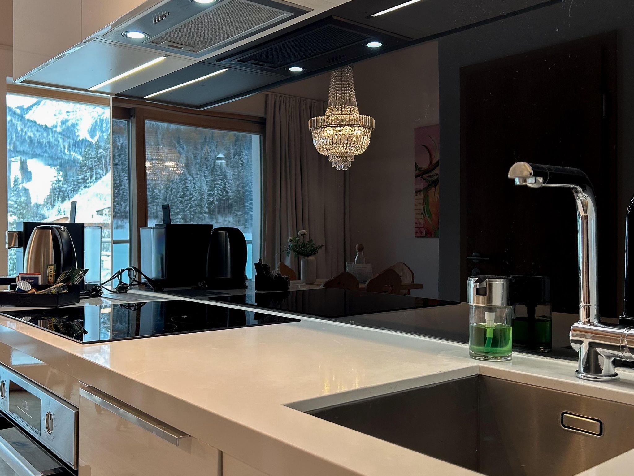 Dieses Apartment ist buchbar für bis zu 4 Personen und bietet auf 55 m² einen komfortablen Wohnbereich mit Flachbild-TV, ein Schlafzimmer mit Doppelbett, einen weiteren Schlafbereich für bis zu drei Personen, eine voll ausgestattete Küche, ein modernes Badezimmer mit Dusche, ein separates WC sowie einen Südbalkon mit herrlichem Bergblick. Das Apartment befindet sich im 2. Stock und ist über eine Treppe zugänglich.