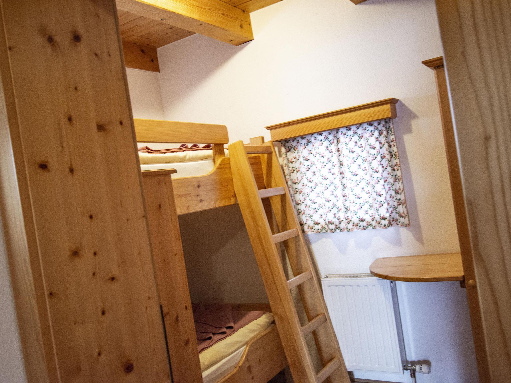 Ferienhaus mit einem Doppelbett und einem Kinderzimmer mit Stockbett. Gemütlicher Wohn- Essküche inkl. Sofa und Holzofen.