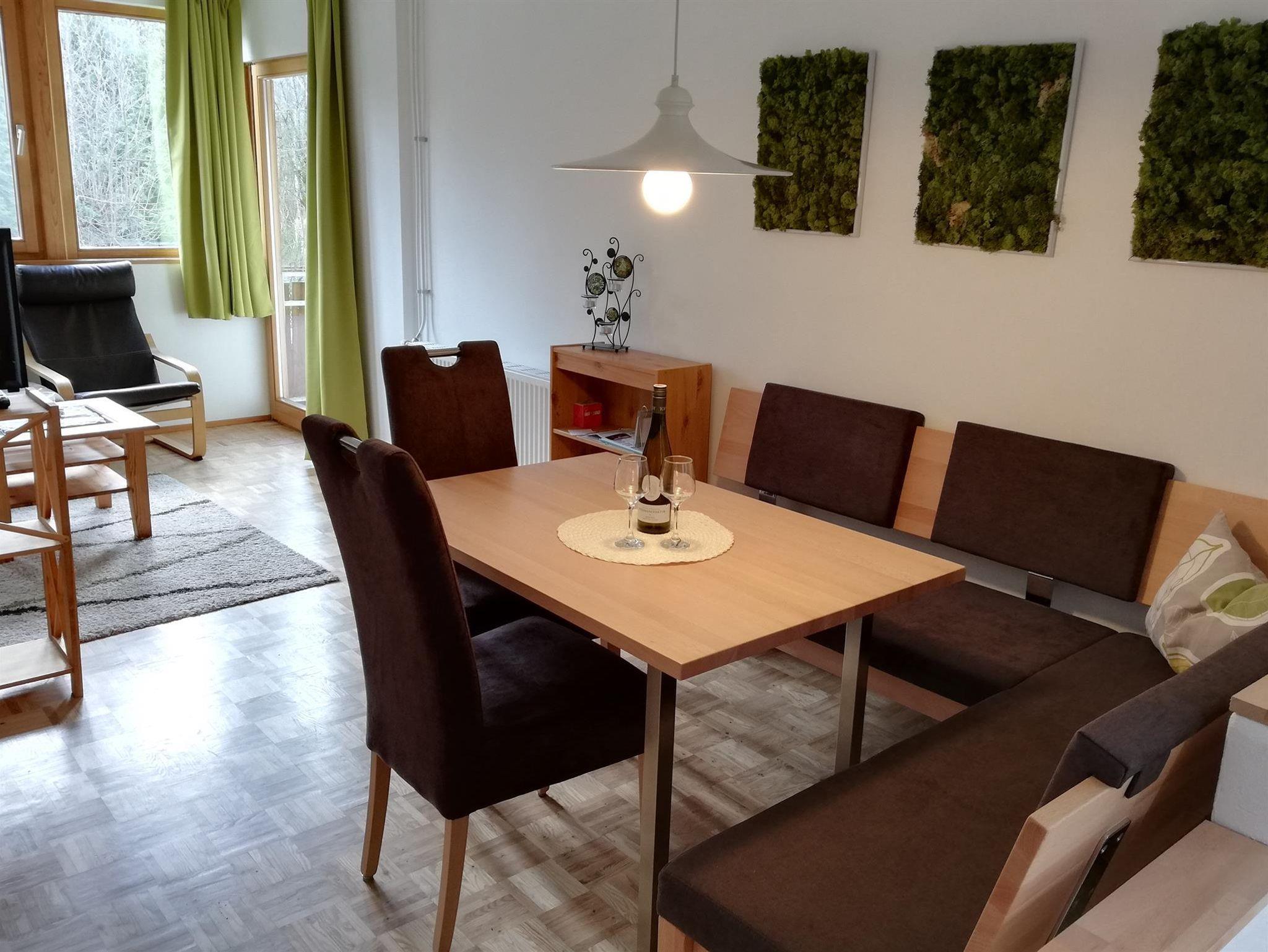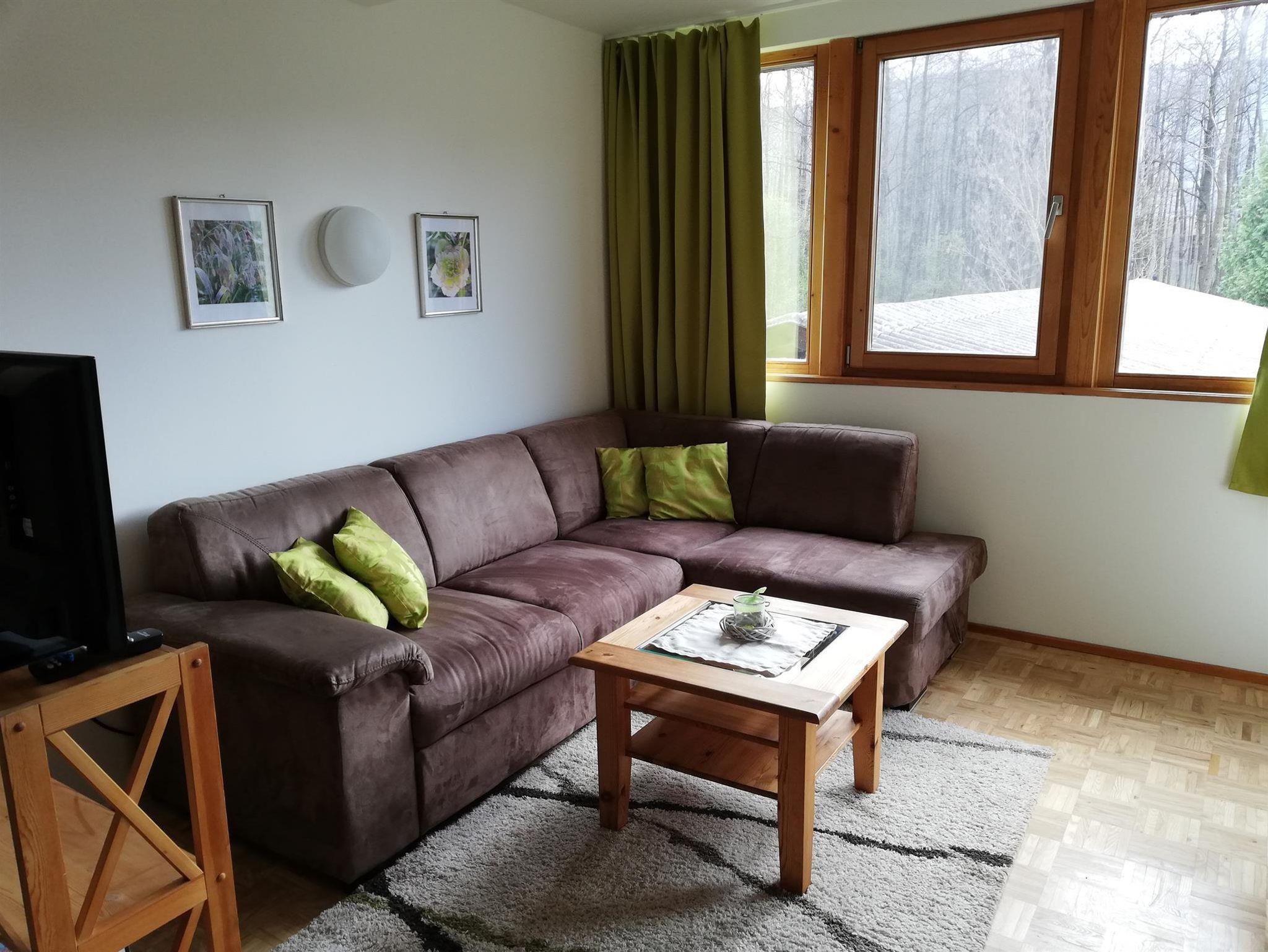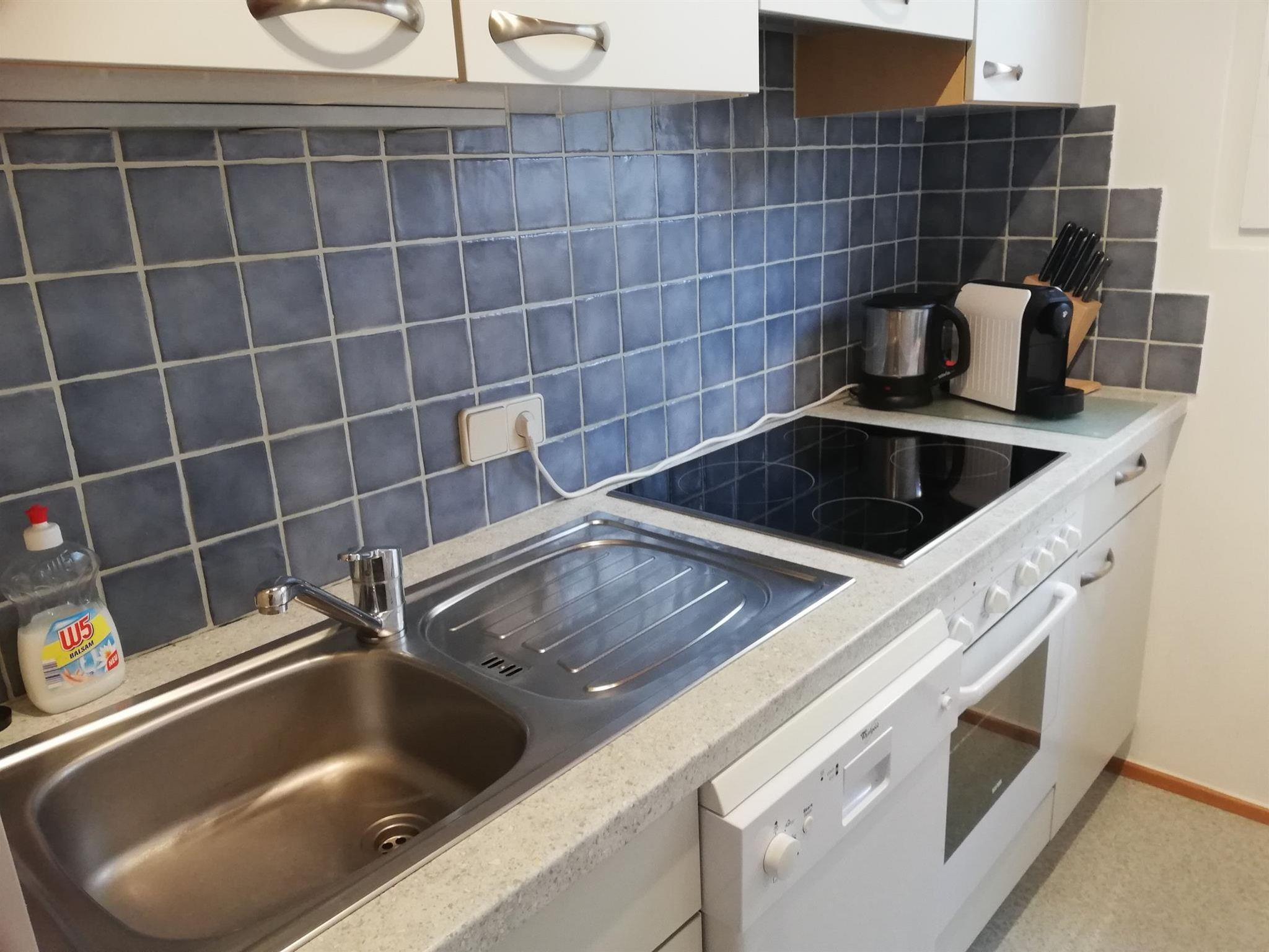 Die Ferienwohnung 65m² ( 2-5 Pers.) mit Balkon, 1 Schlafzimmer mit Doppelbett, 1 Schlafzimmer mit Doppelbett und 1 ausziehbarer Couch, Essecke, voll ausgestattete Küche mit Geschirrspülmaschine, Elektroherd mit Backrohr, Mikrowelle, Kühlschrank mit Gefrierfach, Kaffeemaschine. Kapselmaschine Cafissimo, SAT-TV, Flat-TV im Wohnzimmer, Dusche mit WC. Gratis WLAN.