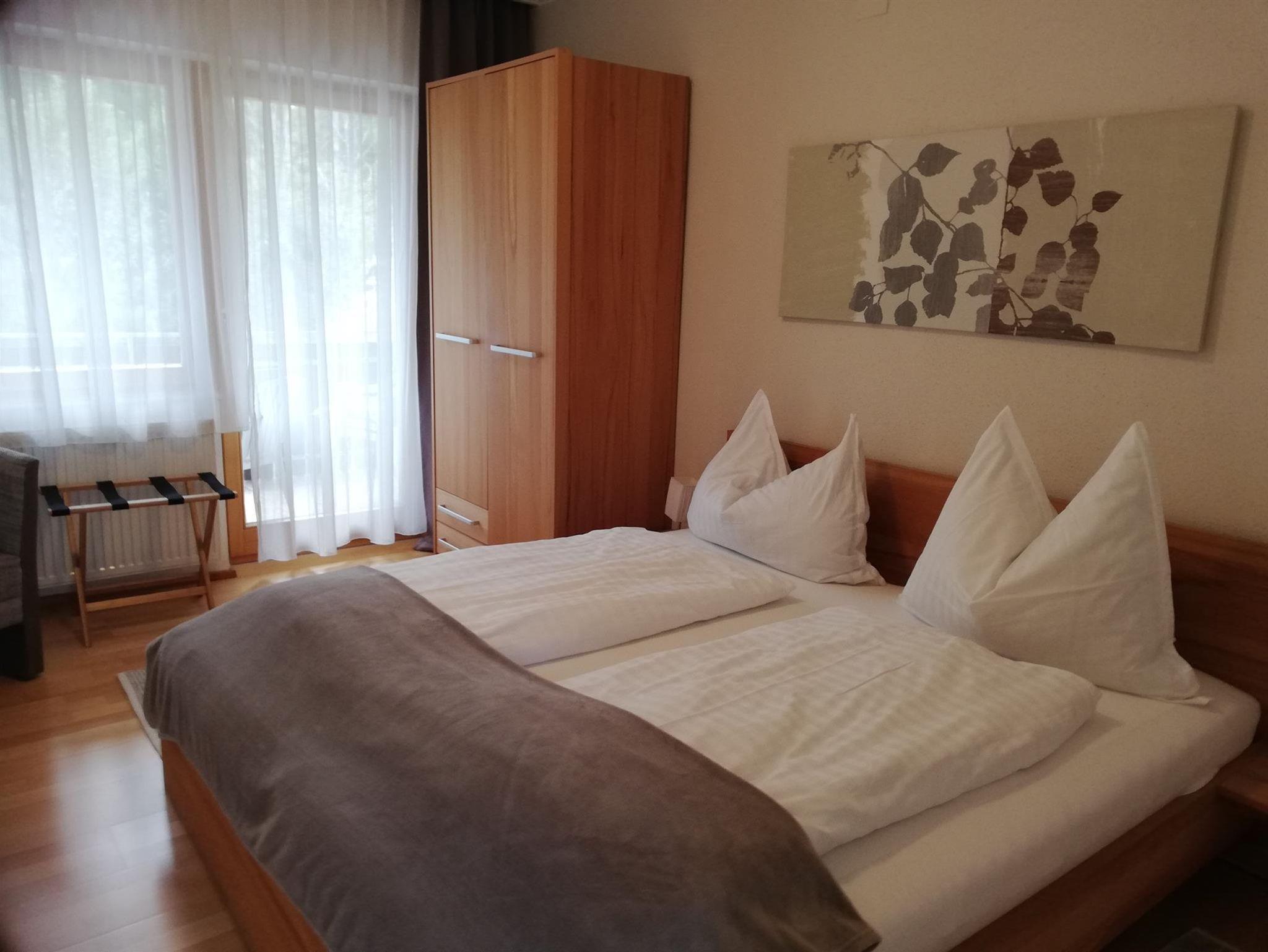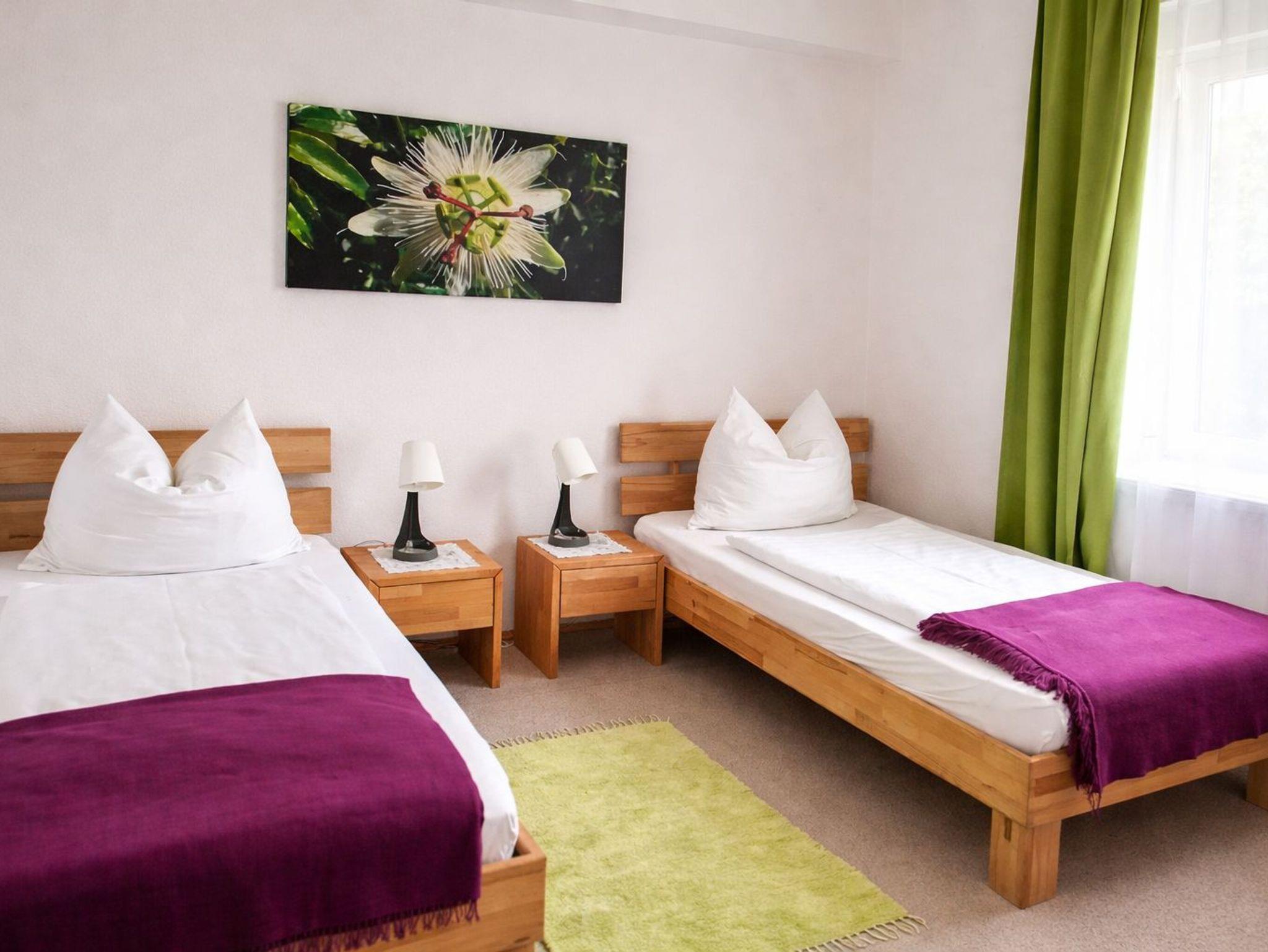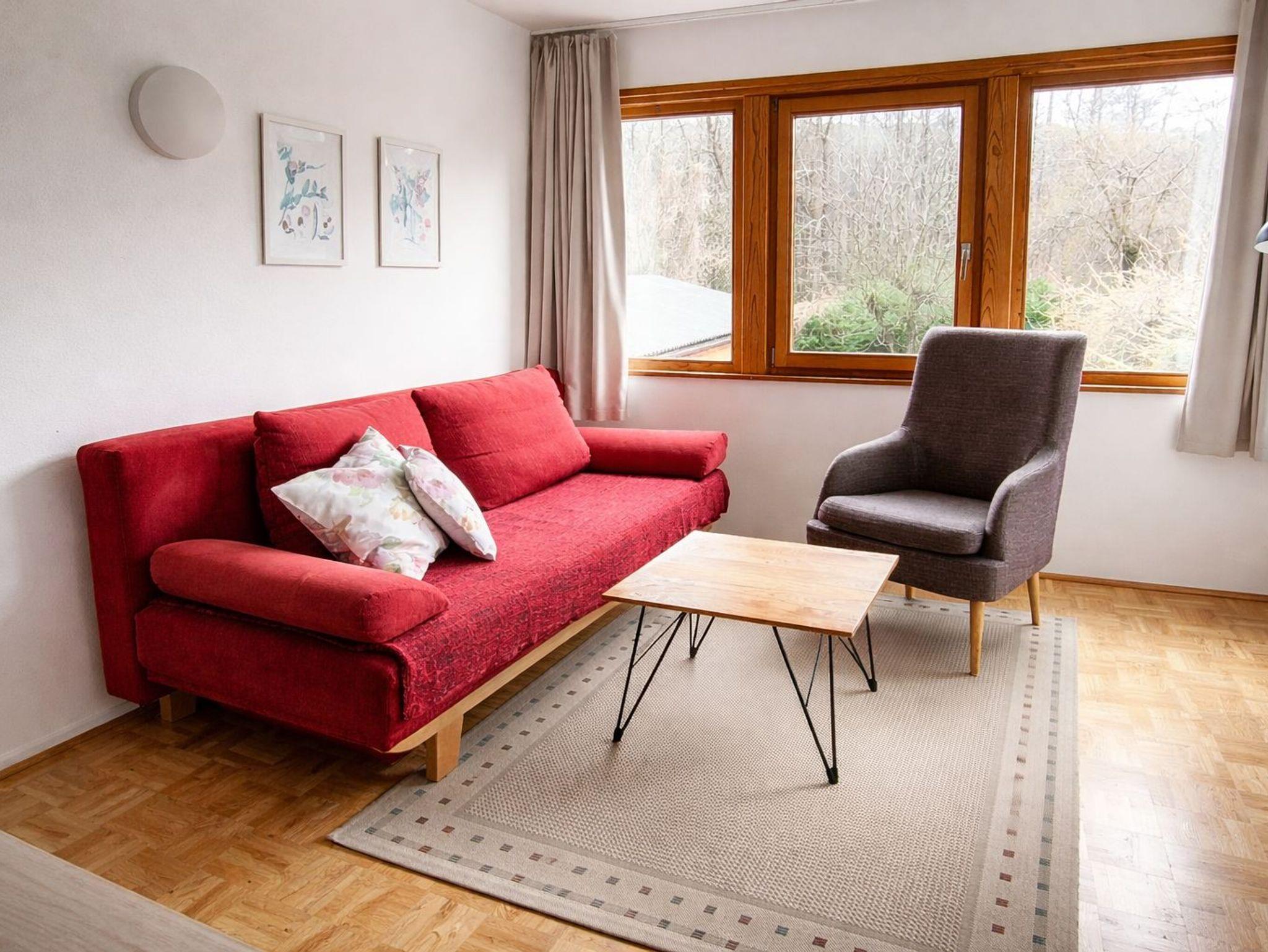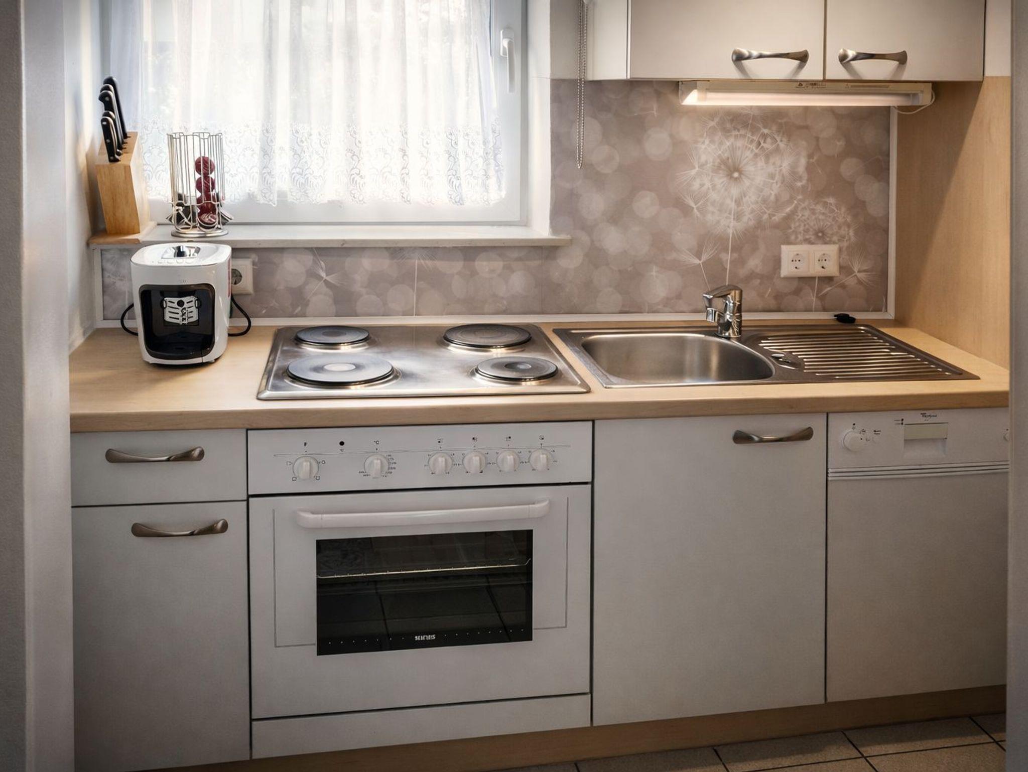 Die Ferienwohnung 65m² ( 2-5 Pers.) mit Balkon, 1 Schlafzimmer mit Doppelbett, 1 Schlafzimmer mit Doppelbett und 1 ausziehbarer Couch, Essecke, voll ausgestattete Küche mit Geschirrspülmaschine, Elektroherd mit Backrohr, Mikrowelle, Kühlschrank mit Gefrierfach, Kaffeemaschine. Kapselmaschine Cafissimo, SAT-TV, Flat-TV im Wohnzimmer, Dusche mit WC. Gratis WLAN.