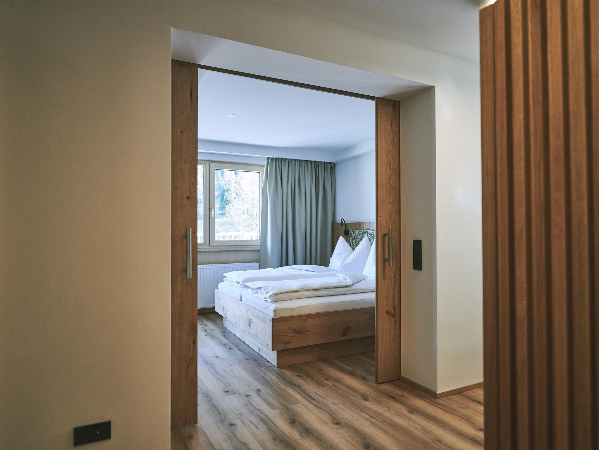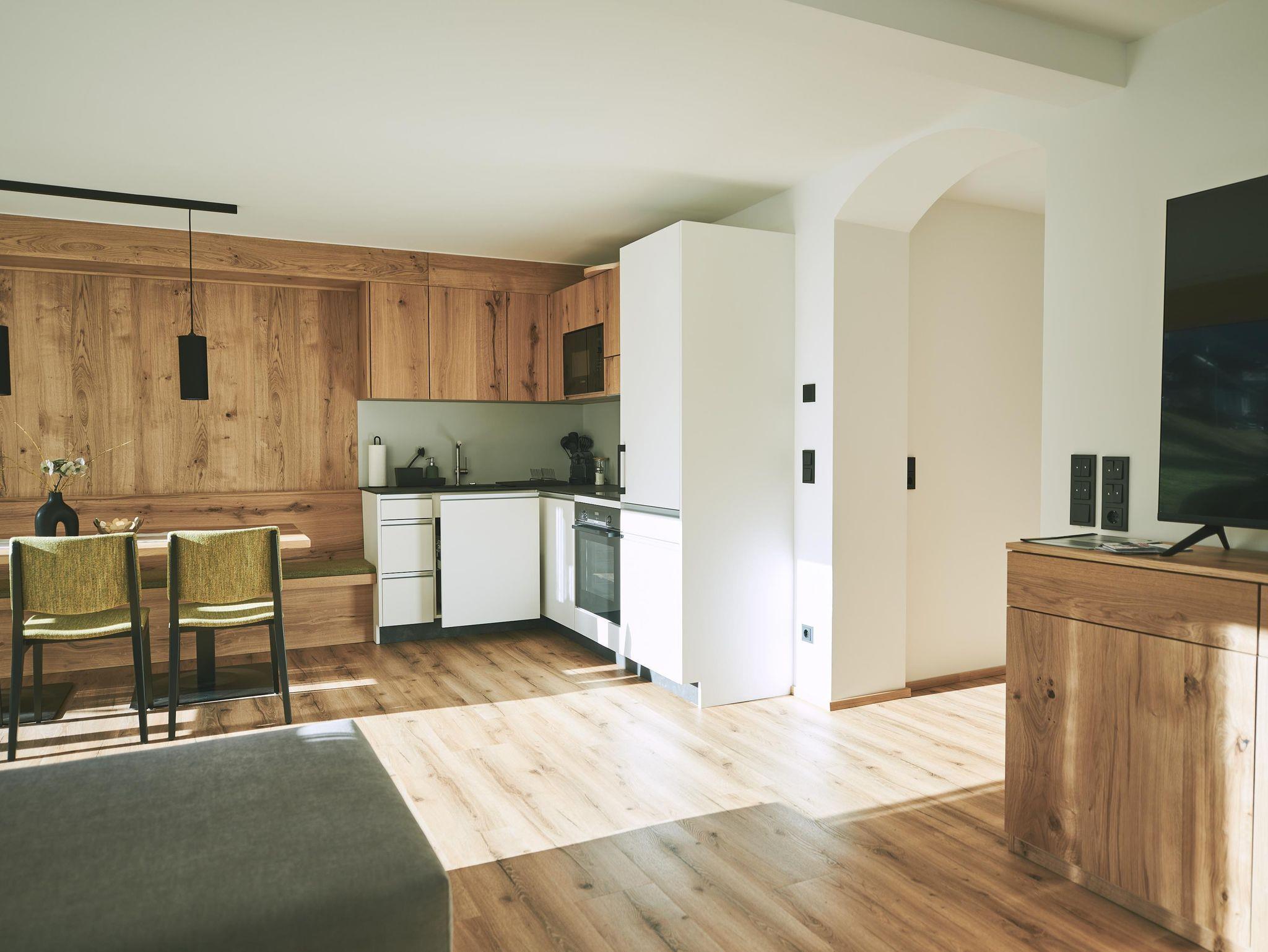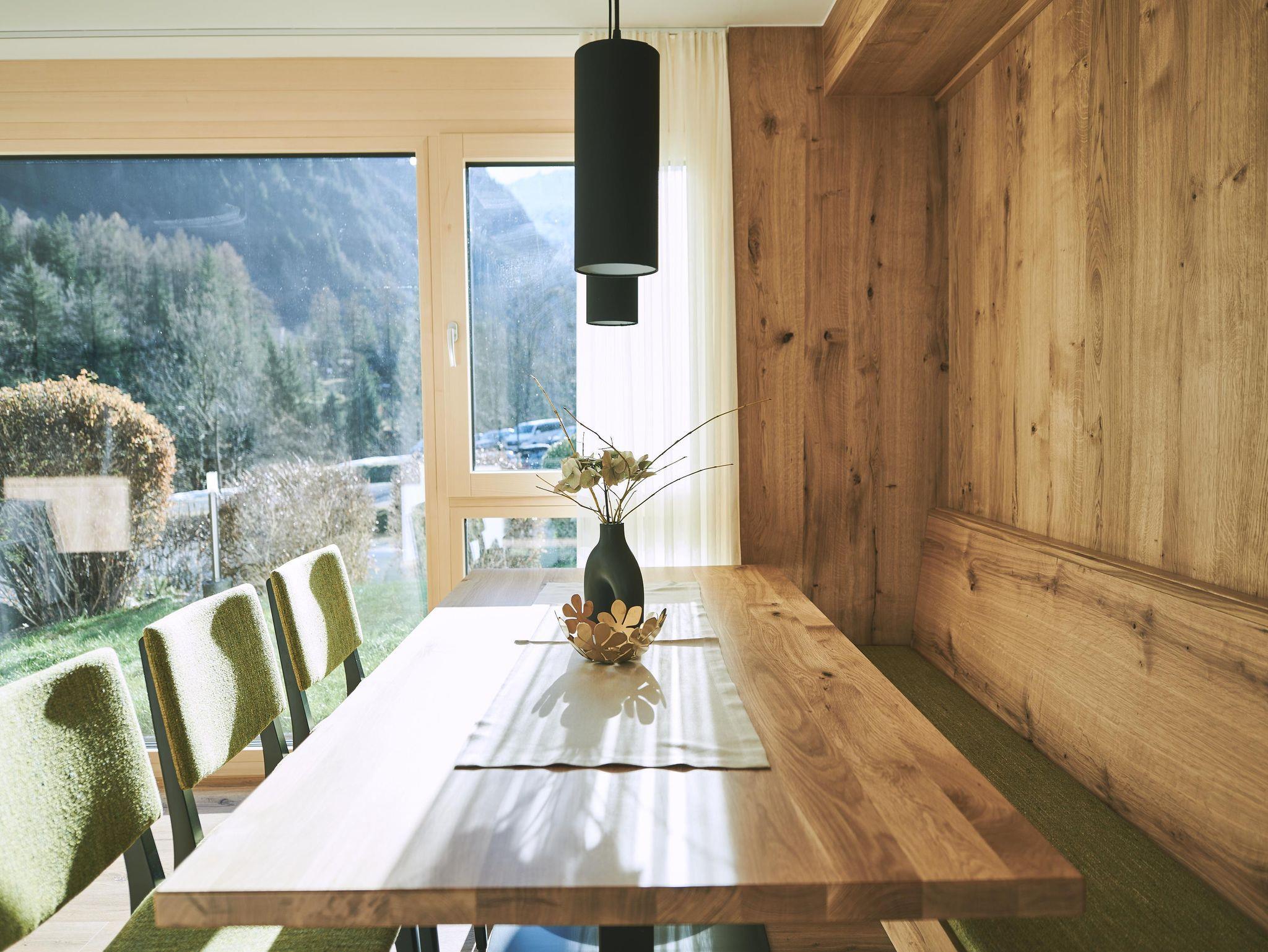 Mit 70 Quadratmeter bietet unser Familienappartement Mottakopf großzügig Platz für zwei bis fünf Personen. Im Wohn-Essbereich samt großen Esstisch, südseitiger Terrasse mit Panorama Bergblick, 1 Doppelzimmer mit Verbindungsschiebetür zum 2. Schlafzimmer mit 3 Betten, Badezimmer mit Dusche und WC sowie einem separaten WC gibt es genügend Platz für alle. In der vollausgestatteten Küche befinden sich Geschirrspüler, Induktionskochfeld, Backofen und Kapsel-sowie Filterkaffeemaschine. Heimeliges Wohngefühl und viel Holz gibt es von uns gerne obendrauf!