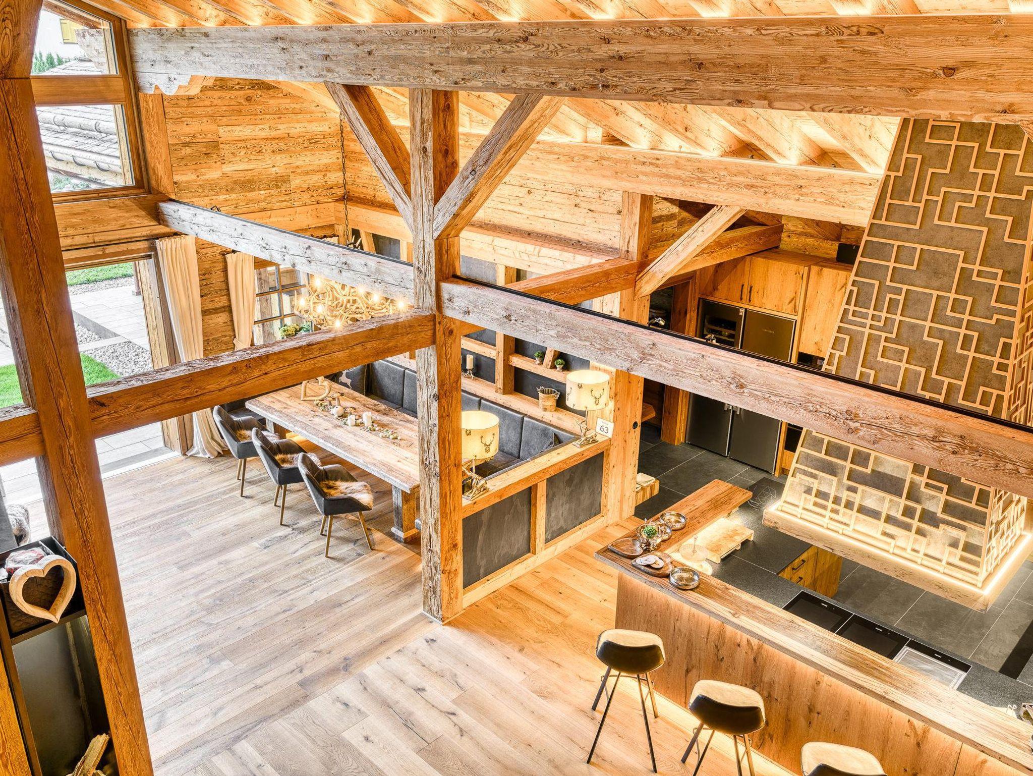 Das Chalet GM verteilt sich auf 2 Etagen. Im ersten Obergeschoss befindet sich das Herzstück des Hauses – der großzügige Wohnbereich mit offener Küche. Die Küche lässt keine Wünsche offen: inklusive Teppanyaki-Grillfläche, Dampfgarer, Bierzapfhahn und Schnapsbrunnen und vielem mehr – lasst euch überraschen!