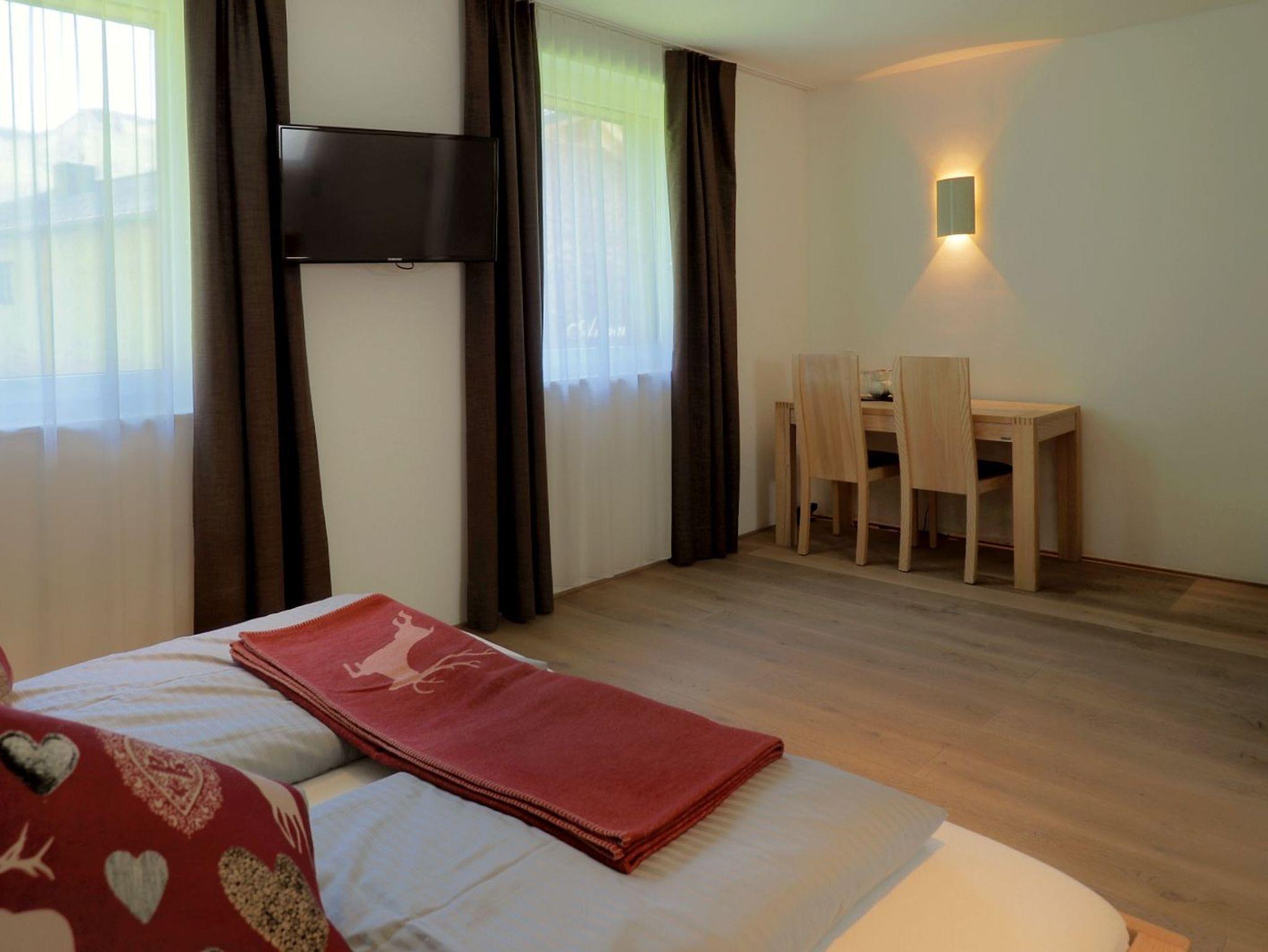 Obwohl das Zimmer keinen Balkon hat, sorgen die großen Fenster für ausreichend Tageslicht und ermöglichen Ihnen einen herrlichen Blick auf die umliegende Berglandschaft. Egal zu welcher Jahreszeit Sie unser Hotel besuchen, Sie können sich immer auf eine beeindruckende Aussicht freuen.