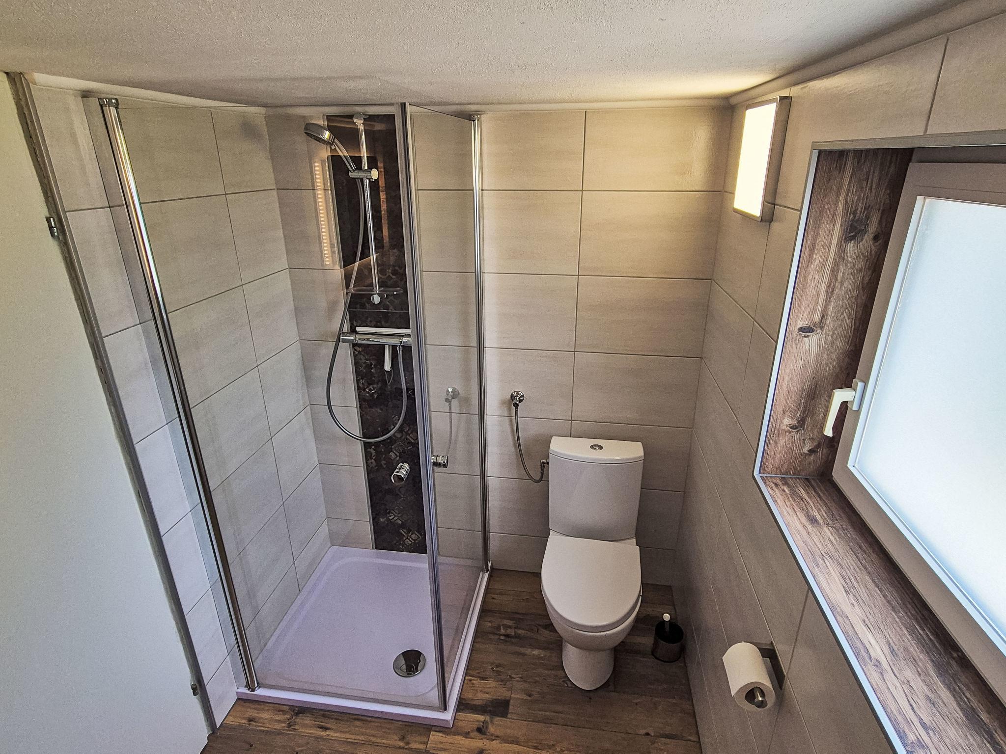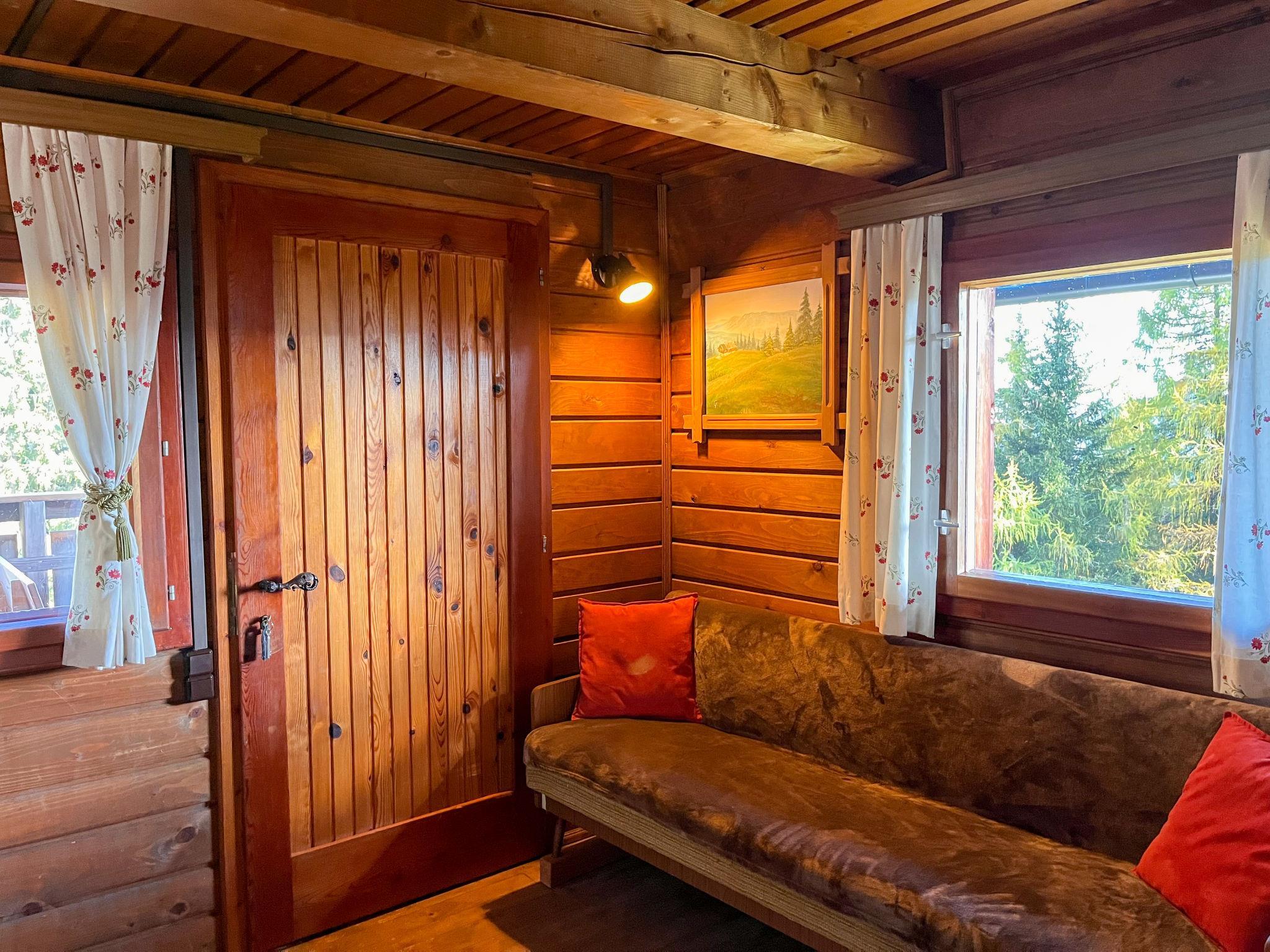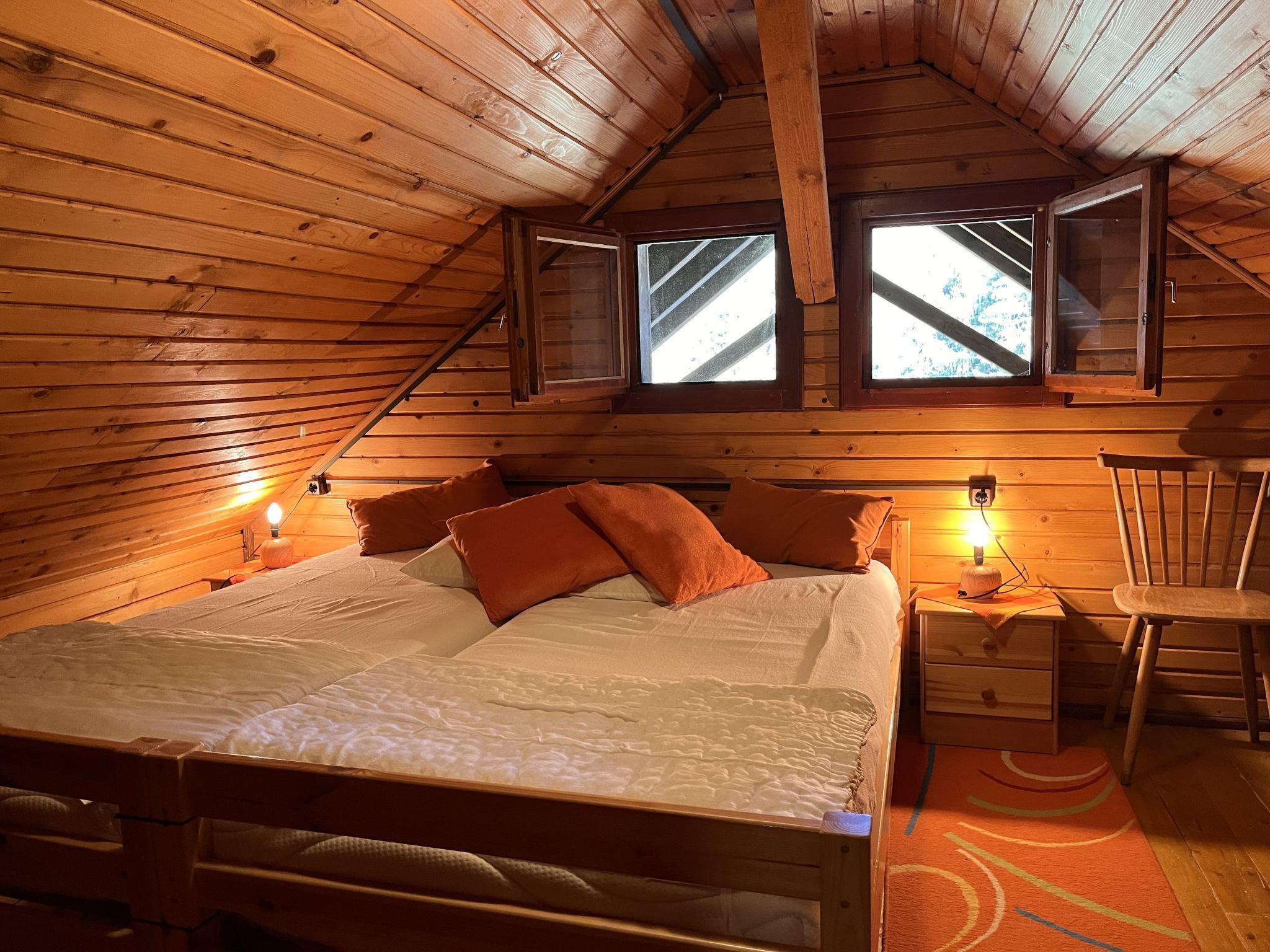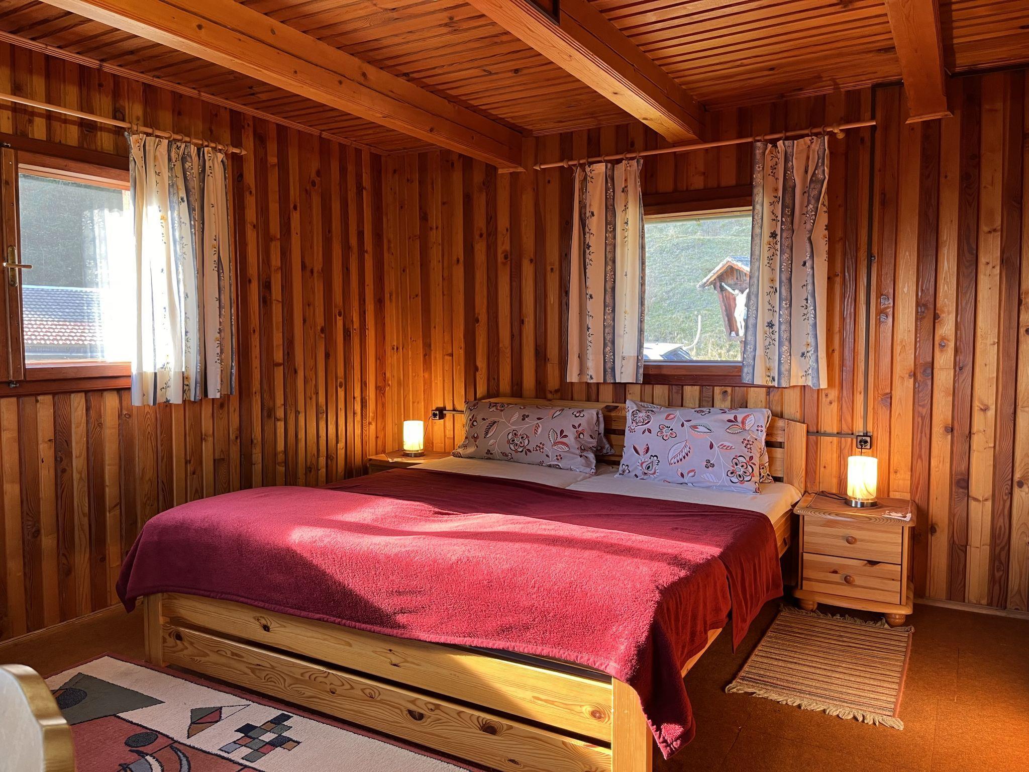 3-room chalet 120 m2 on 2 levels. Simple and rustic furnishings: living room with dining table. 1 double bedroom. Kitchen) with wood-burning stove. On the lower ground floor: shower/WC. Upper floor: 1 room with 3 double beds. Large patio. Marvellous panoramic view of the valley and the countryside. Please note: smoke alarm. The 2 double beds on the ground floor are in two alcoves separated by a wall without doors. The shower and toilet on the lower floor are accessible only through the terrace (balcony).