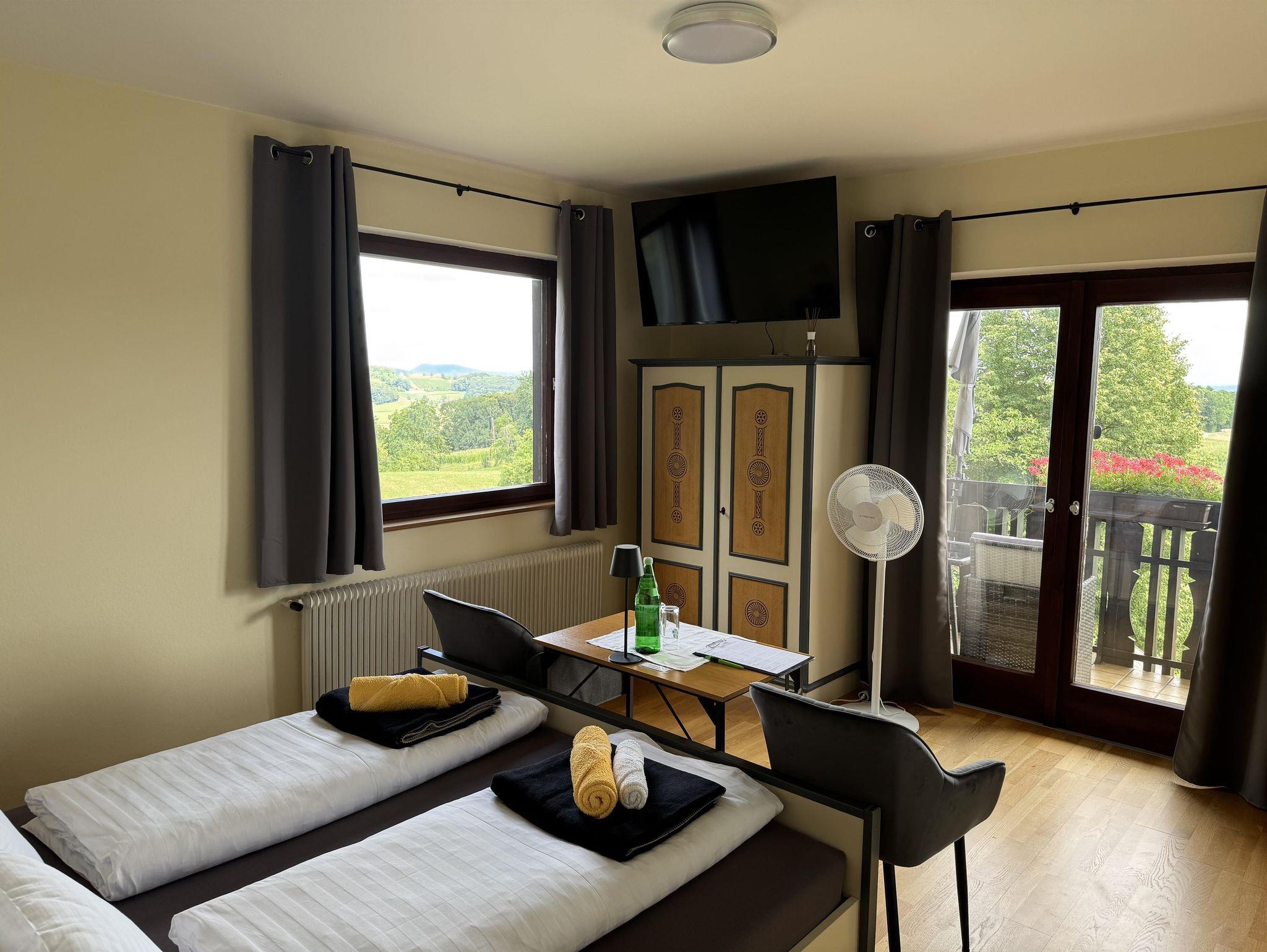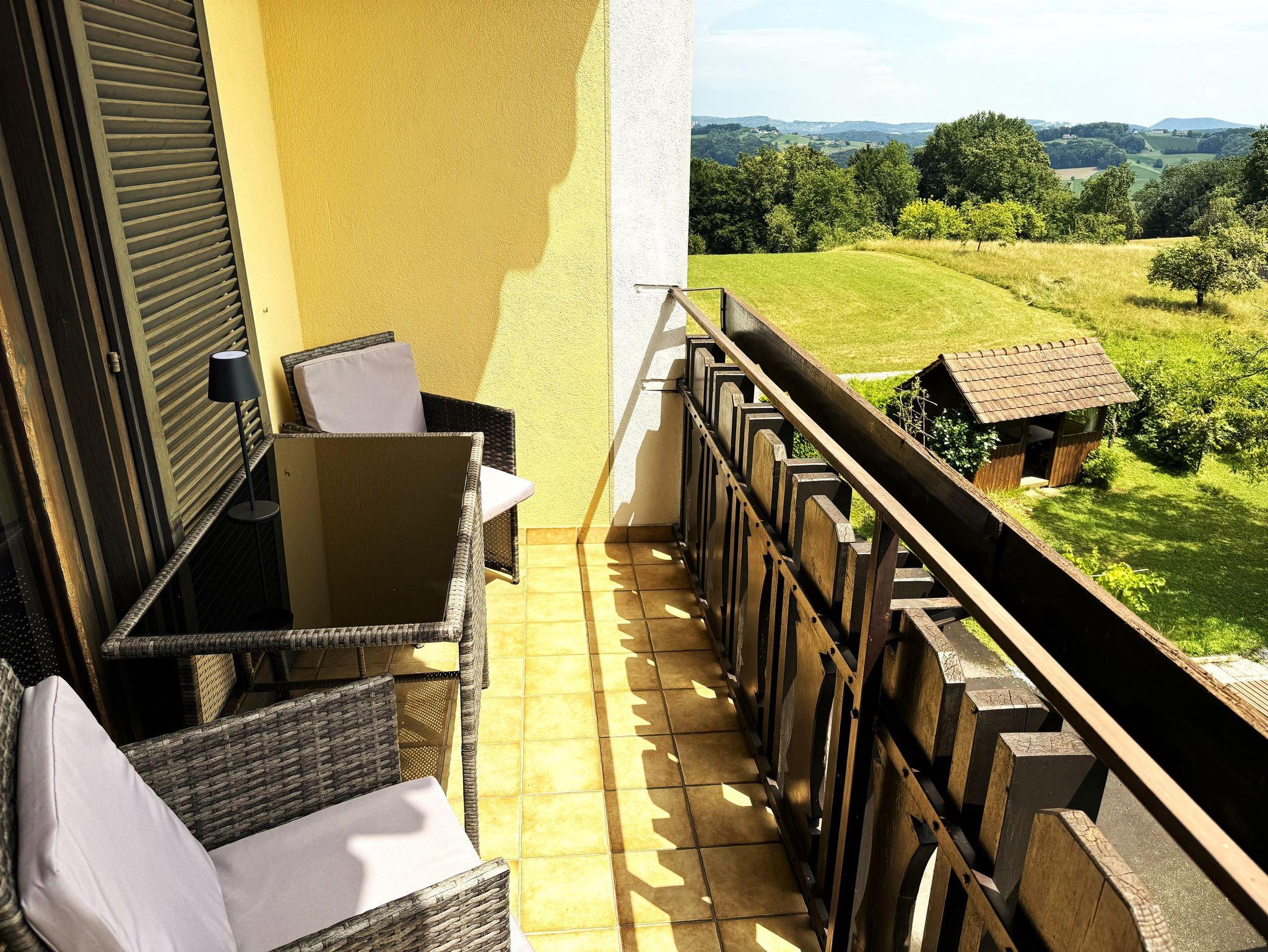 Dieses Doppelbettzimmer verfügt über einen Flachbild-TV mit Streaming-Dienst, ein eigenes Bad mit Dusche und WC, sowie einen Balkon mit Süd- (Garten) und ein Fenster mit Ostblick (Straden). Parkettboden. Das Zimmer bietet 1 Doppelbett (180x200cm).