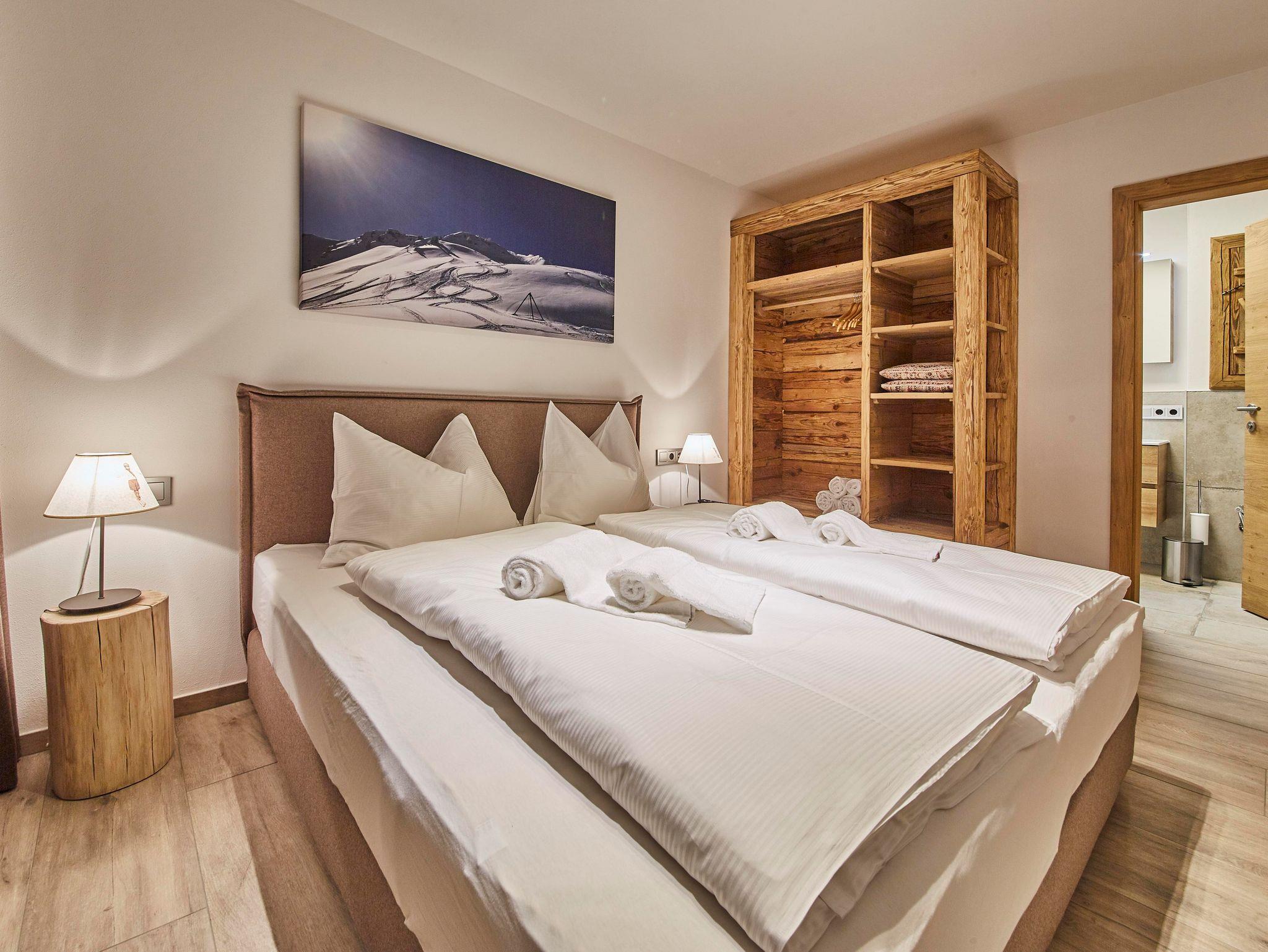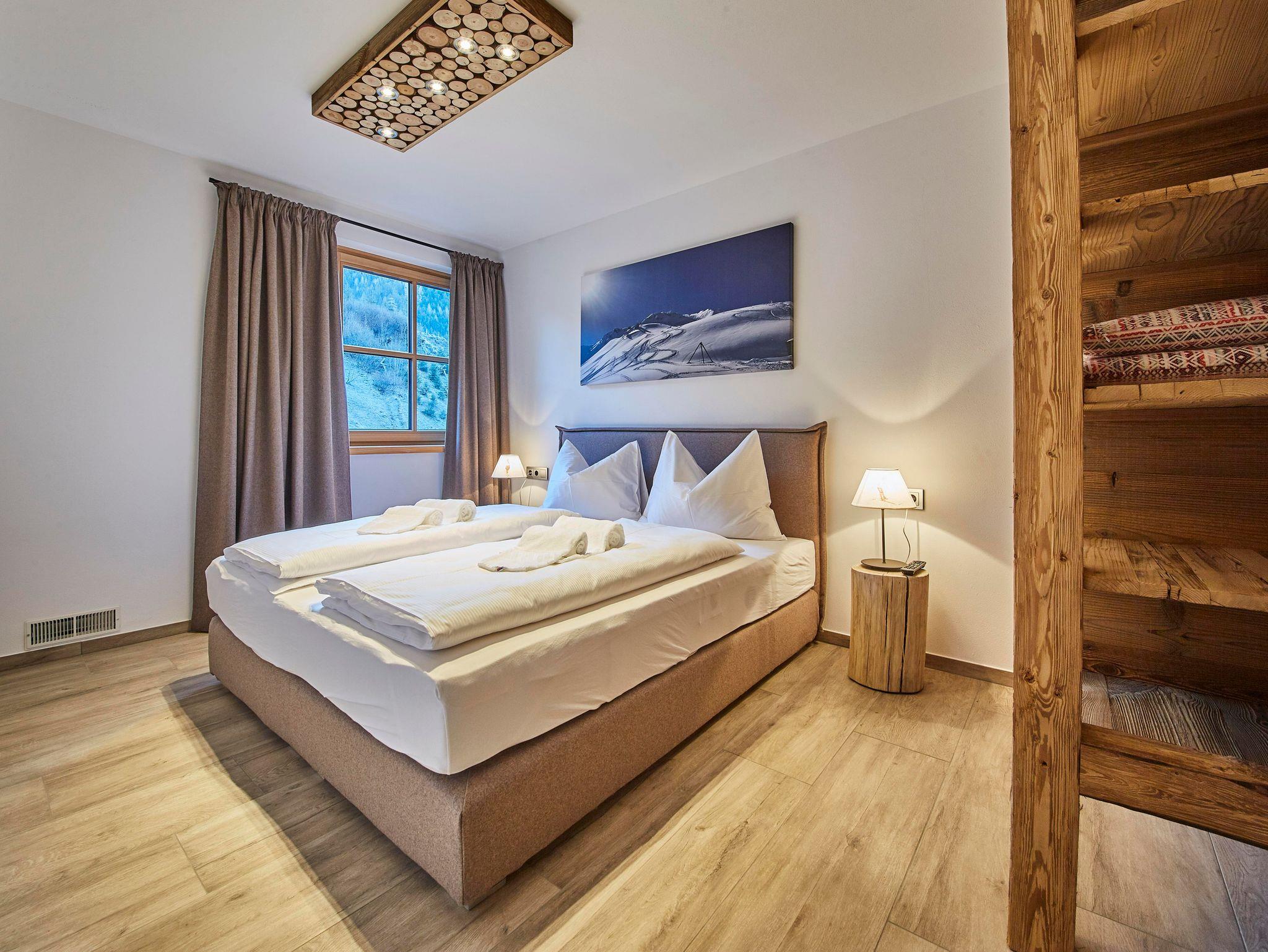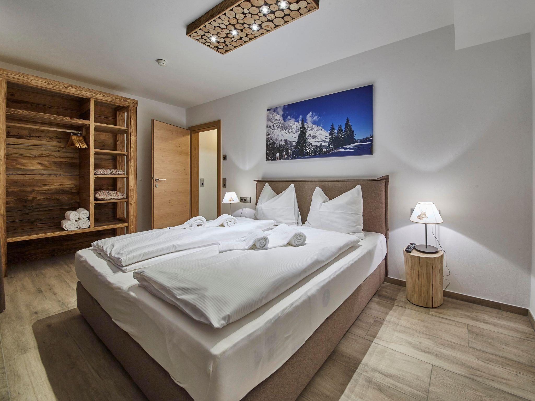 Willkommen im Premium Apartment Peak 3 mit Platz für bis zu 4 Personen! Auf 80 m² erwarten Sie 2 Schlafzimmer mit Doppelbetten und Smart-TVs sowie 2 moderne en-suite Badezimmer mit Regendusche, WC und privater Sauna. Der Wohnbereich begeistert mit einem großen Smart-TV, einer voll ausgestattete Küche mit Granit-Arbeitsplatte und Miele Geräten. Genießen Sie Blick auf das Hochkönigmassiv und die romantische Kirche vom Balkon.