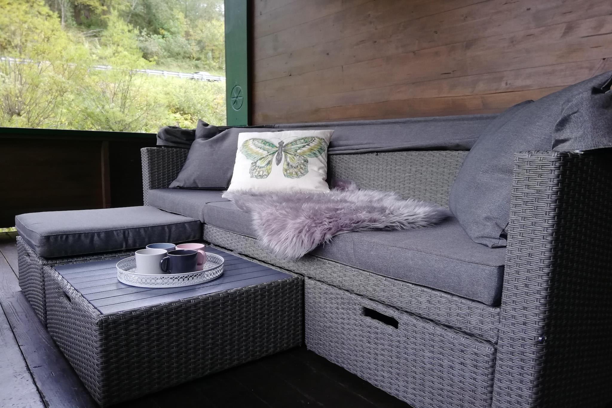 På 1. etage: (entre, Stue(dobbeltsovesofa, Fjernsyn, spisebord, balkon), Køkken(sofahjørne, brødrister, komfur, kaffemaskine, ovn, opvaskemaskine , køle-fryseskab), soveværelse(king size-seng, balkon), soveværelse(king size-seng, balkon), badeværelse(bruser, håndvask), toilet) skiopbevaring, skistøvlevarmere, have, cykelopbevaring, havemøbler, legeredskaber