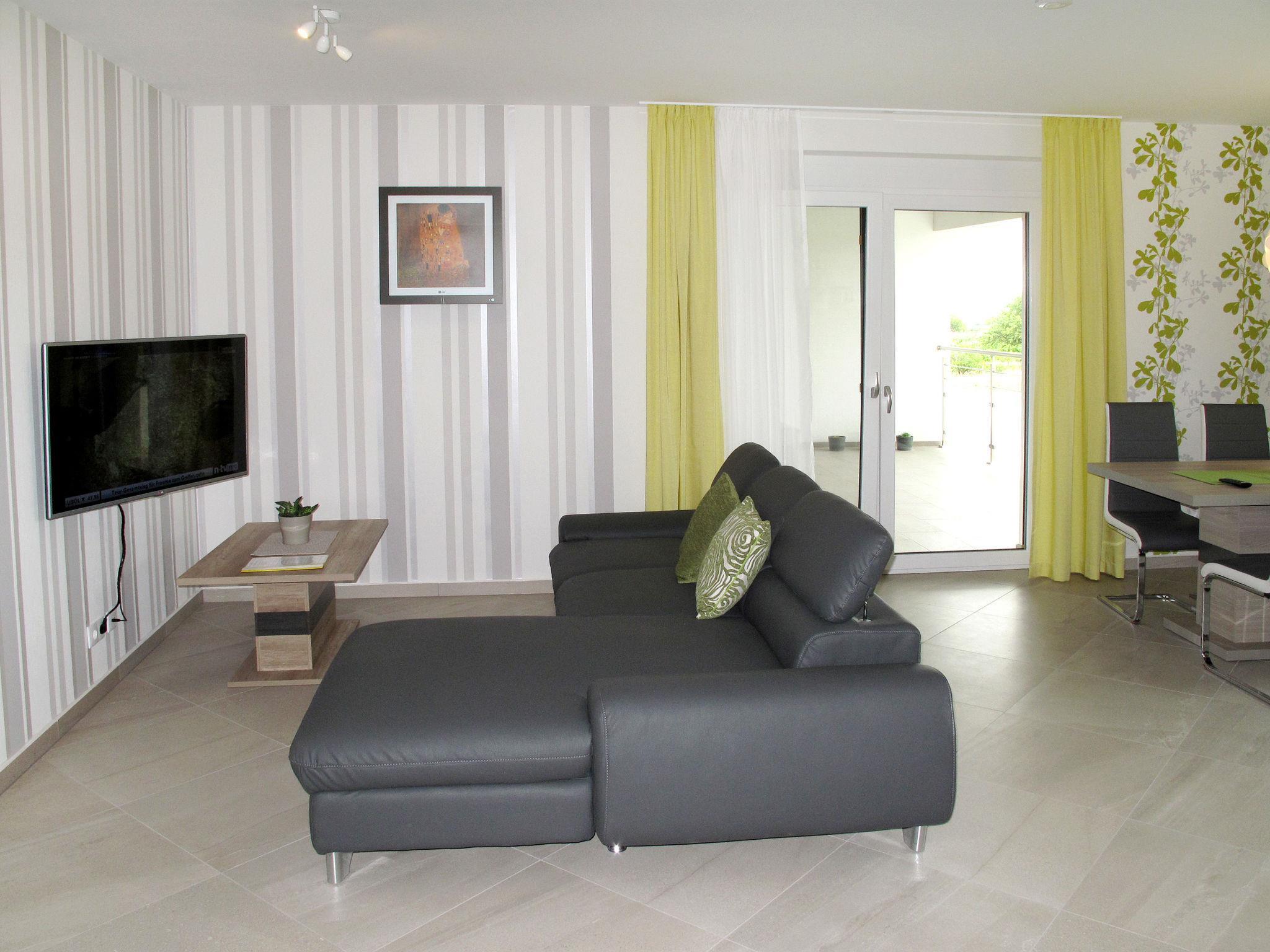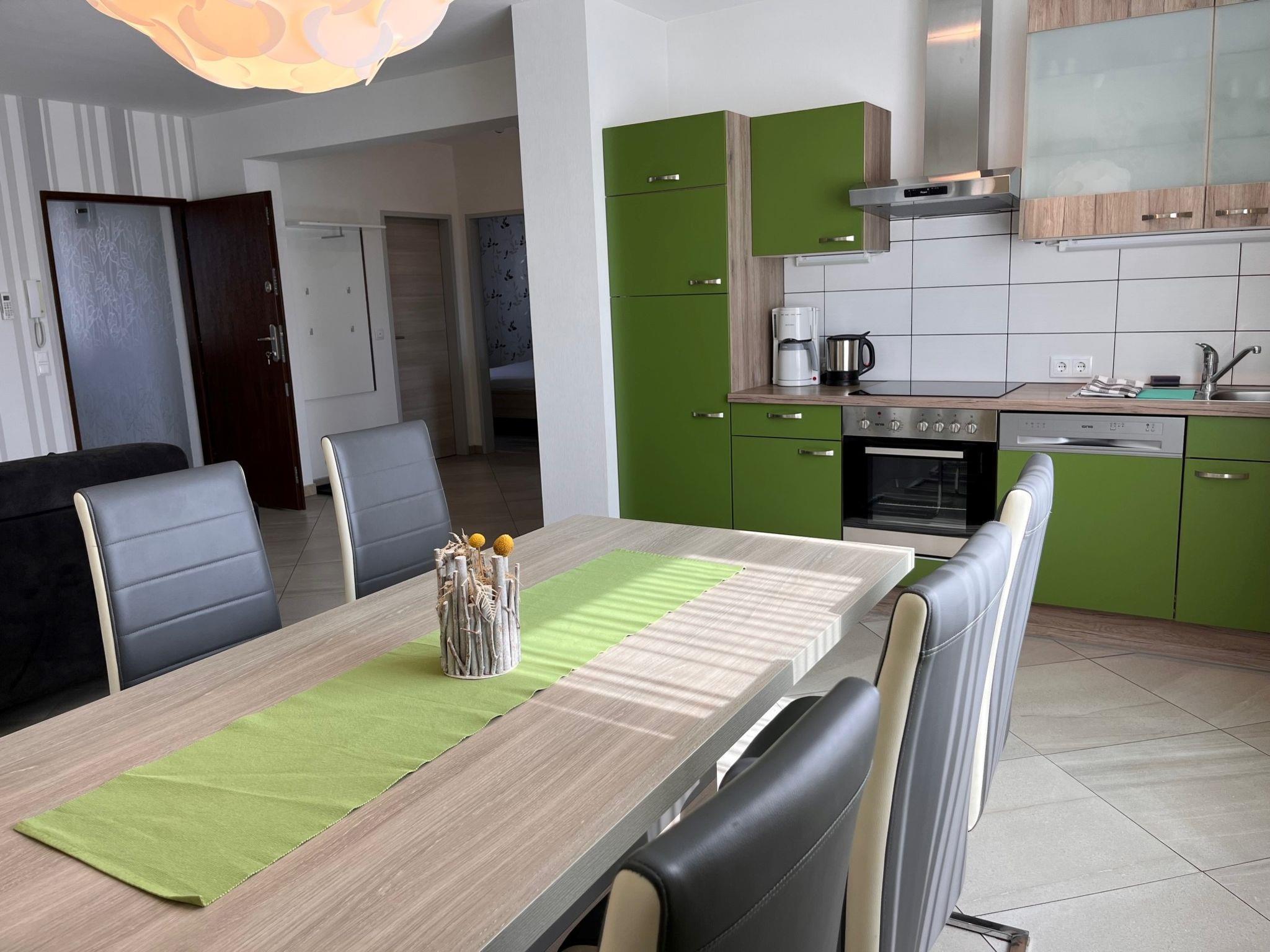 "Fuchs", 3-room apartment 80 m2, on the upper floor. Bright, modern and stylish furnishings: living/sleeping room with 1 double sofabed, dining table and cable TV. Exit to the balcony. 1 room with 1 double bed and shower/WC. 1 room with 1 double beds. Open kitchen (oven, dishwasher, 4 ceramic glass hob hotplates, toaster, kettle, electric coffee machine). Bath/WC. Air-conditioning, underfloor heating. Natural stone floors. Balcony. Balcony furniture, box-room. Facilities: mosquito net. Internet (WiFi, free). Parking (1 car). Please note: non-smokers only. Smoke alarm.
