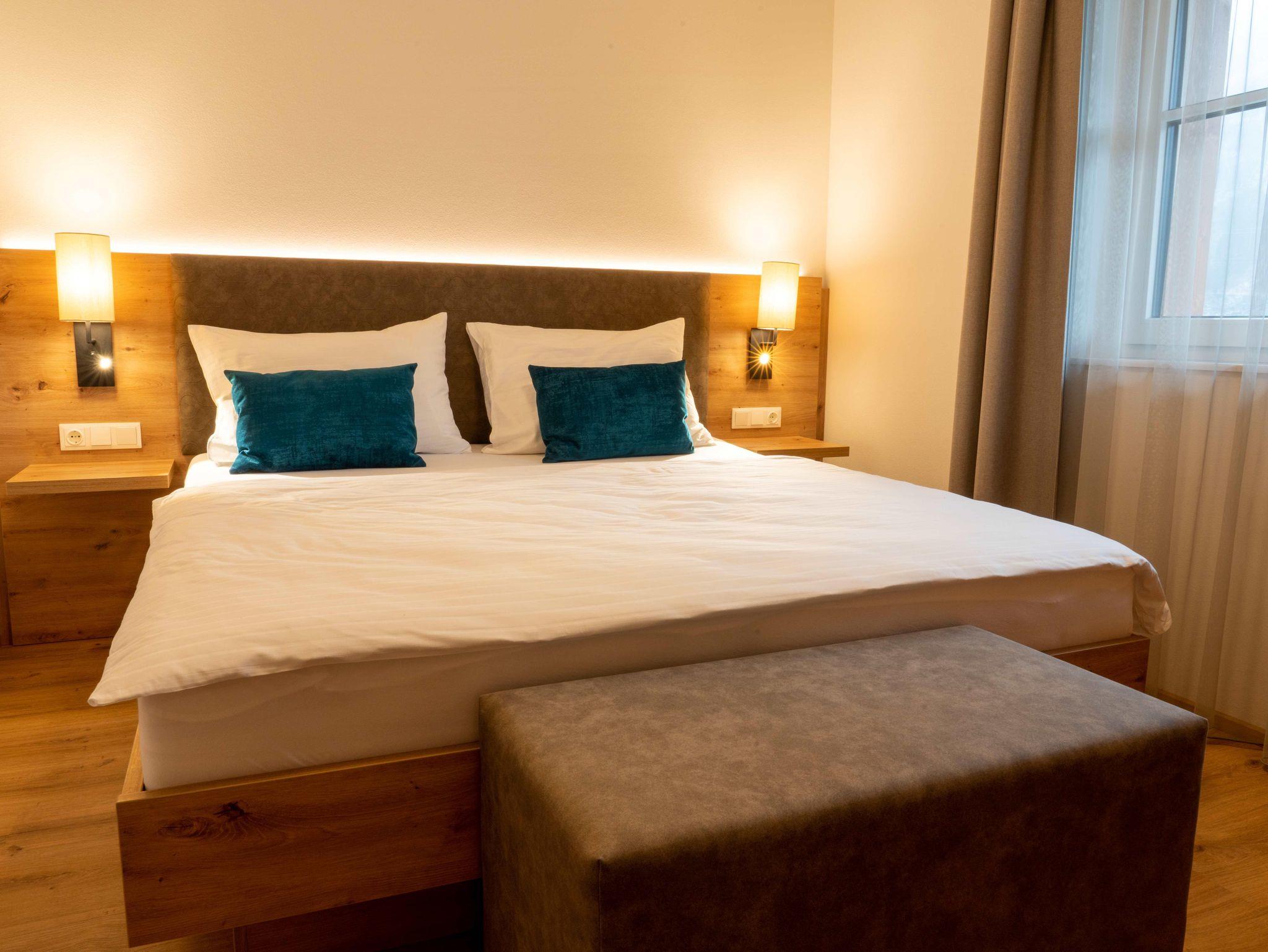 • geräumigen, Vollholz-möblierten Einzel-, Doppel-, Familienzimmern und Studios mit Boxspringbetten in „Treca“ Topqualität, Dusche oder Badewanne, separatem WC