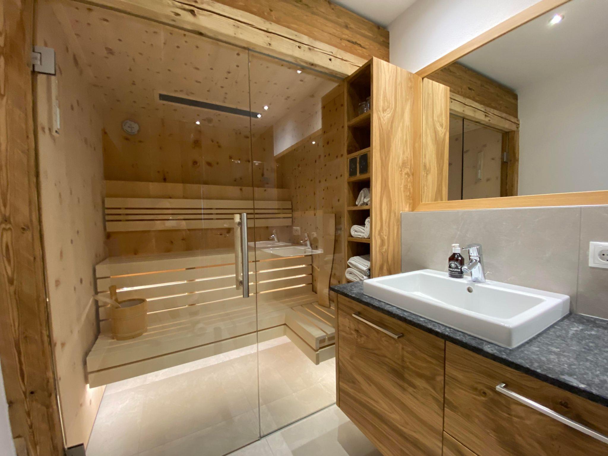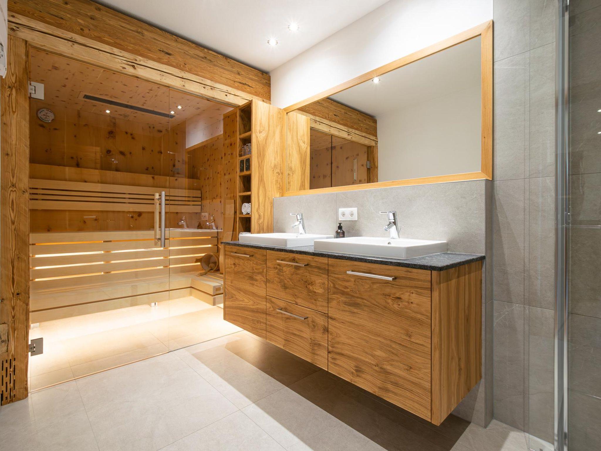 Die private Zirbensauna und Infrarotkabine im Badezimmer bieten entspannende Momente nach einem Spaziergang durch den Schnee – oder nach einem Besuch am Adventmarkt.