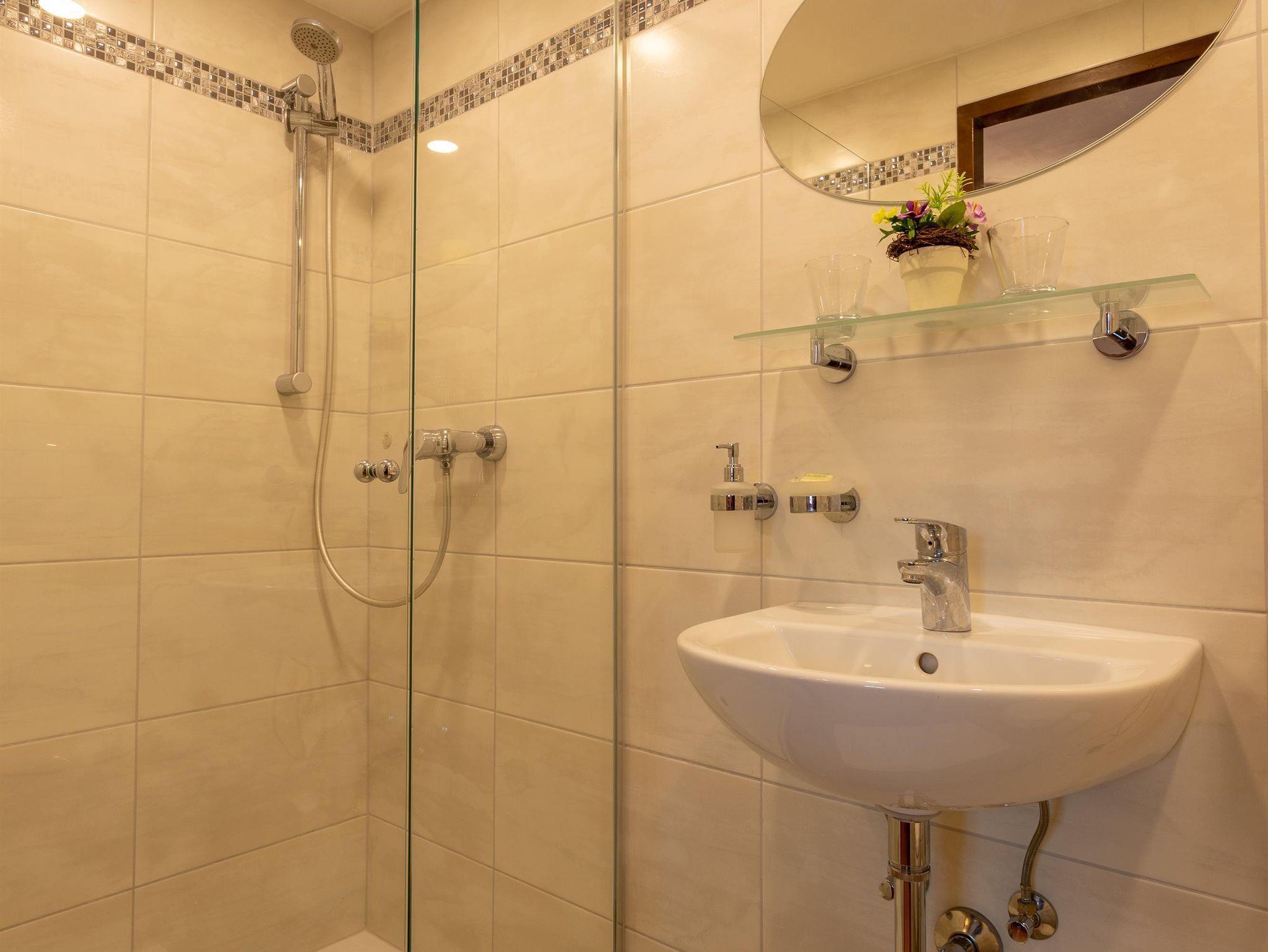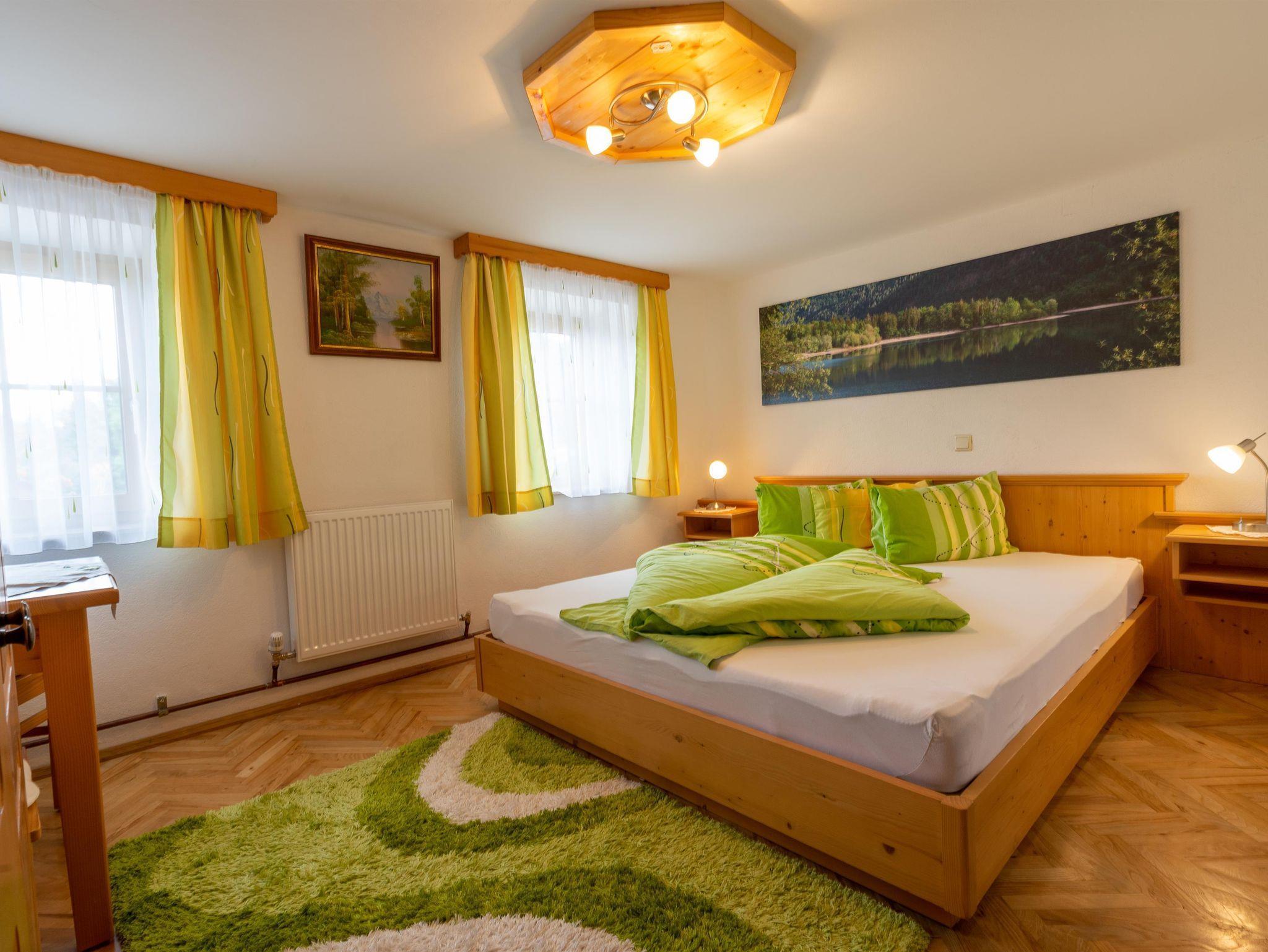 Das Komfortzimmer (Zimmer 1) ist eine kleine Ferienwohnung im Erdgeschoß (2 Räume) gelegen, ausgestattet mit Kochnische u. Geschirr, Kabel-TV, Couch, Parkettböden, Dusche und WC und getrenntem Schlafzimmer. Auch ein Kinderbett findet noch Platz.