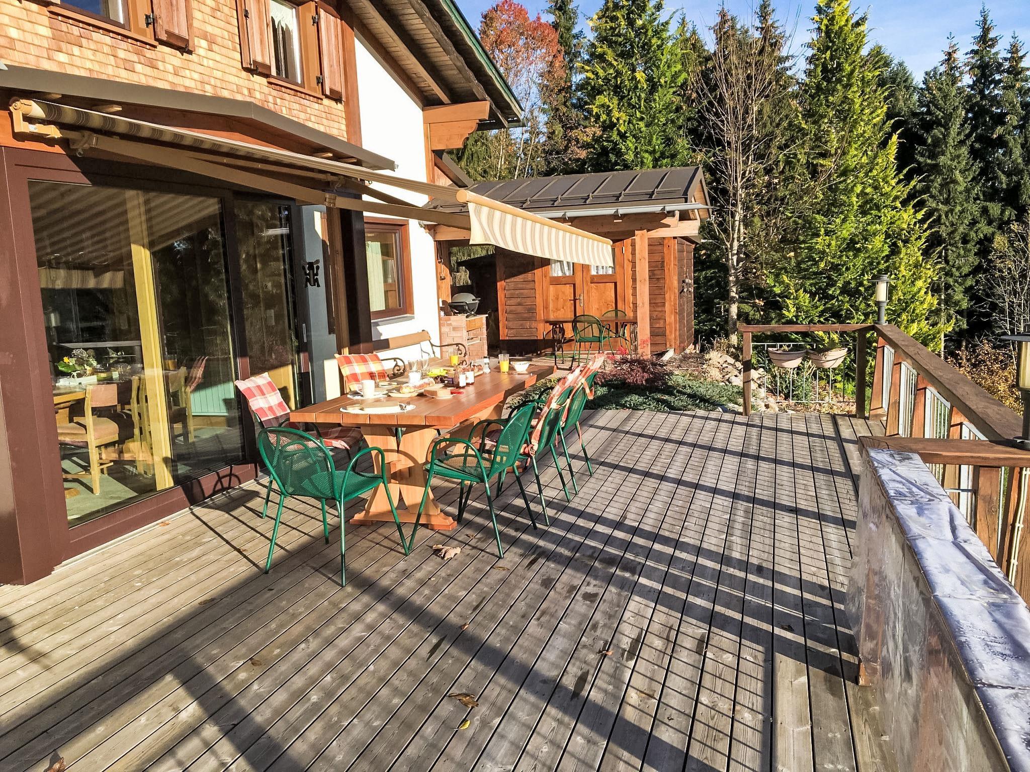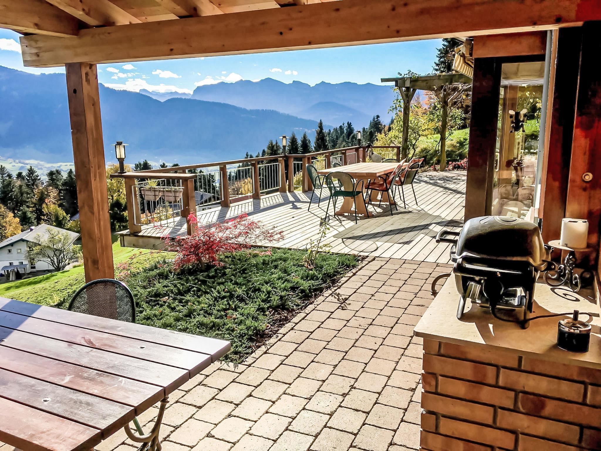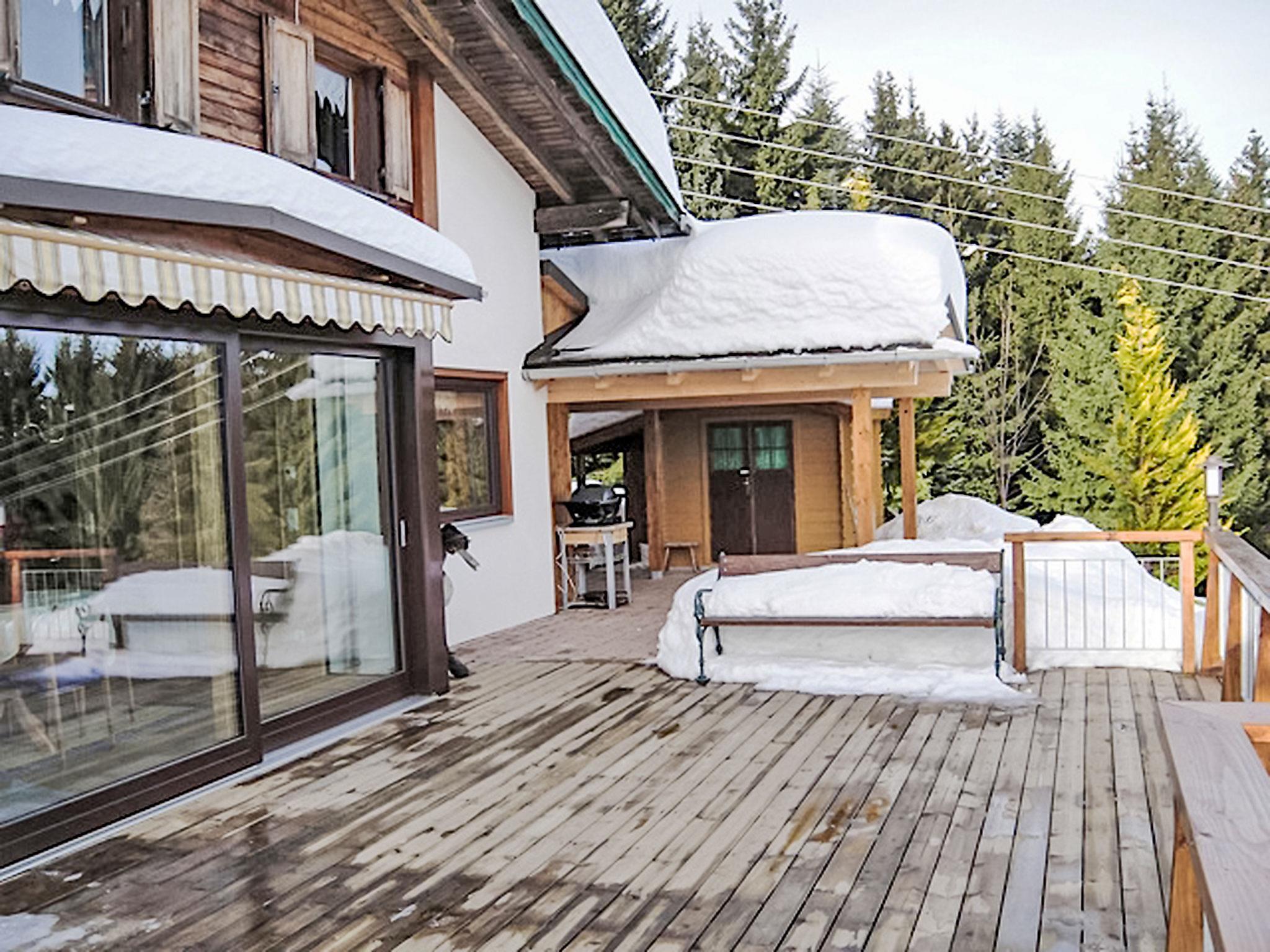 6-room chalet 190 m2. Stylish and cosy furnishings: entrance hall. Large living room with panoramic window with cable TV, hi-fi system, DVD and tiled stove. Exit to the garden, to the terrace. Open lounge with winter garden. Kitchen (oven, dishwasher, 4 ceramic glass hob hotplates, microwave, freezer) with dining table. Shower/WC, double hand-basin. Underfloor heating. Upper floor: 3 double bedrooms. 1 room with sloping ceilings with 2 beds. Gallery with satellite TV. Bath/WC. Large terrace 44 m2. Terrace furniture, barbecue, deck chairs. Marvellous panoramic view of the mountains and the countryside. Facilities: washing machine, baby cot, hair dryer. Internet (WiFi, free). Please note: non-smoking house. Smoke alarm.