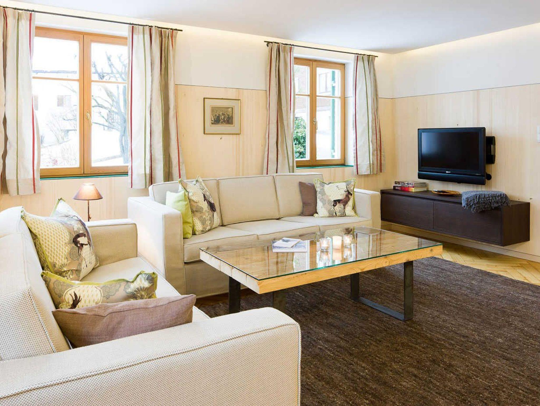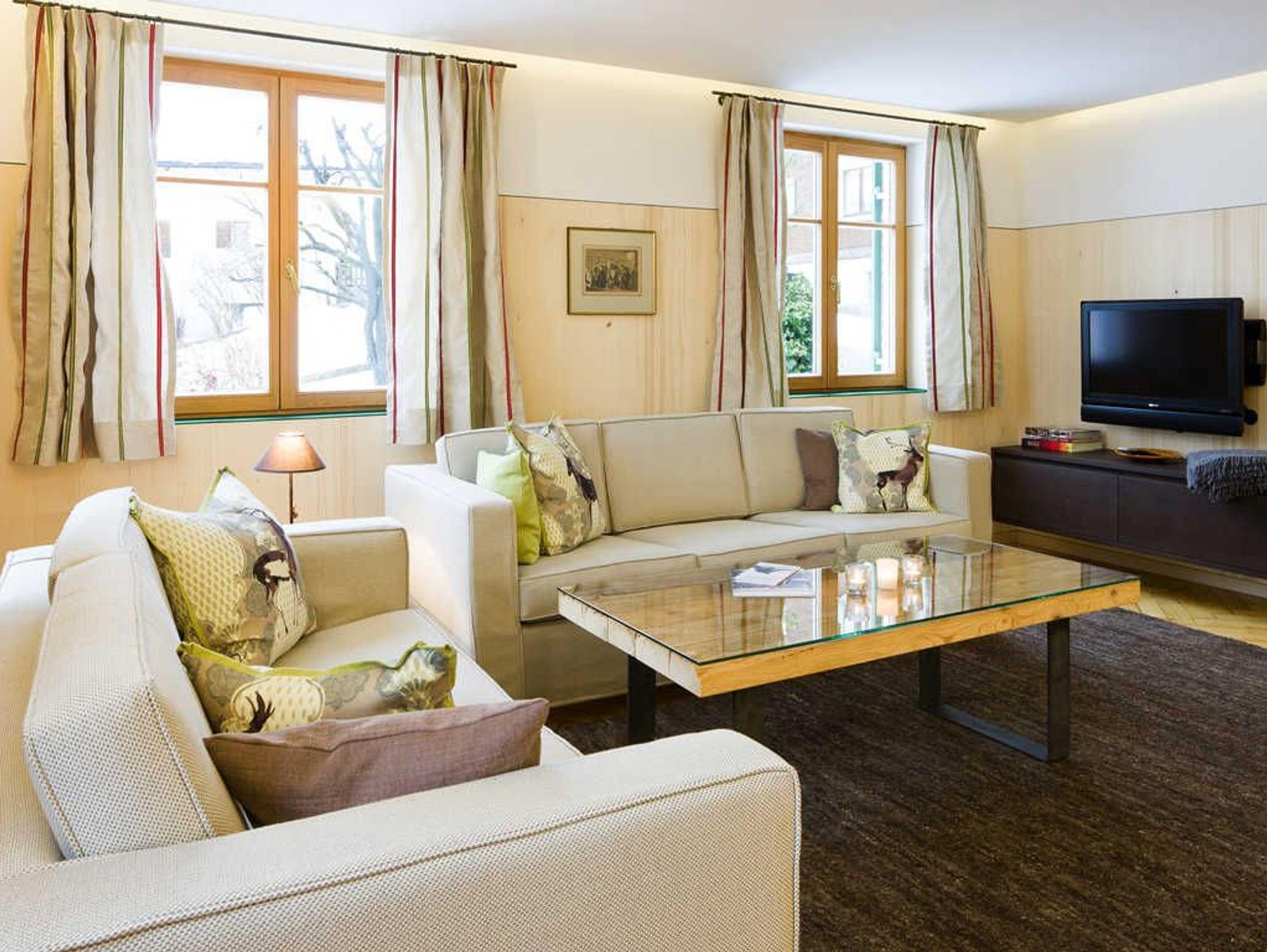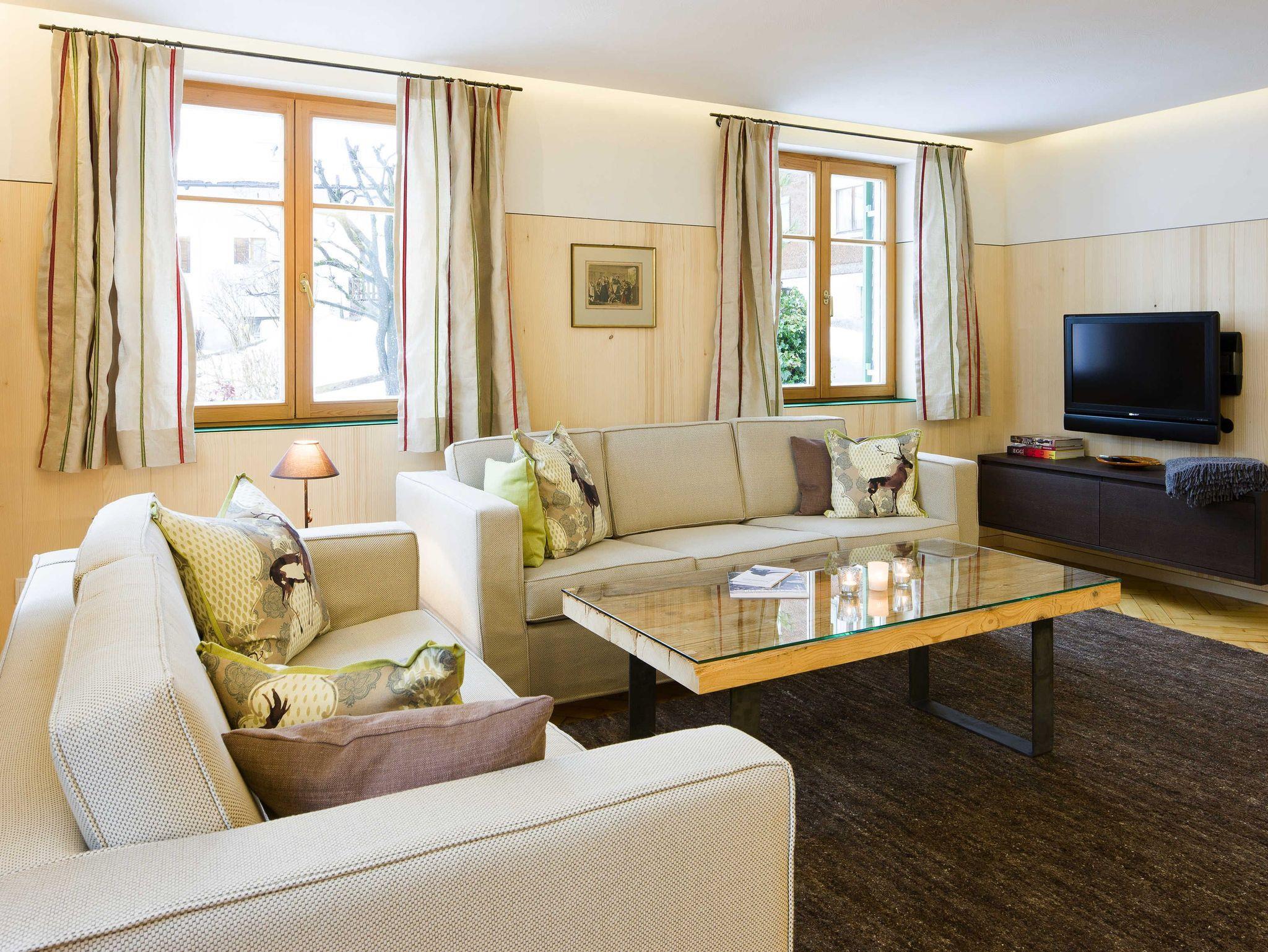 Eine sehr elegantes, großzügiges Wohnzimmer und geräumiges Schlafzimmer mit jeweils Zugang zum großen Balkon und herrlich freiem Blick in die Berge.