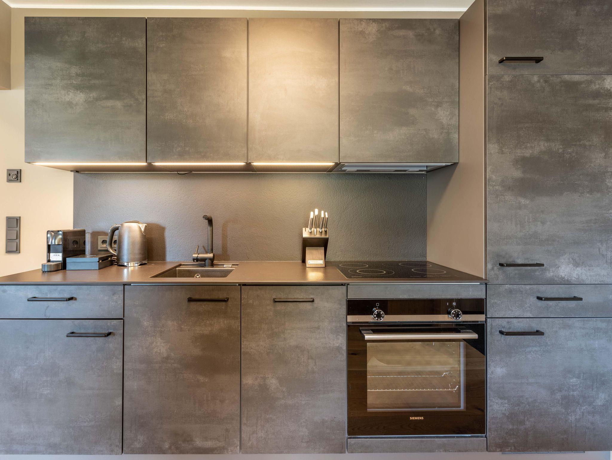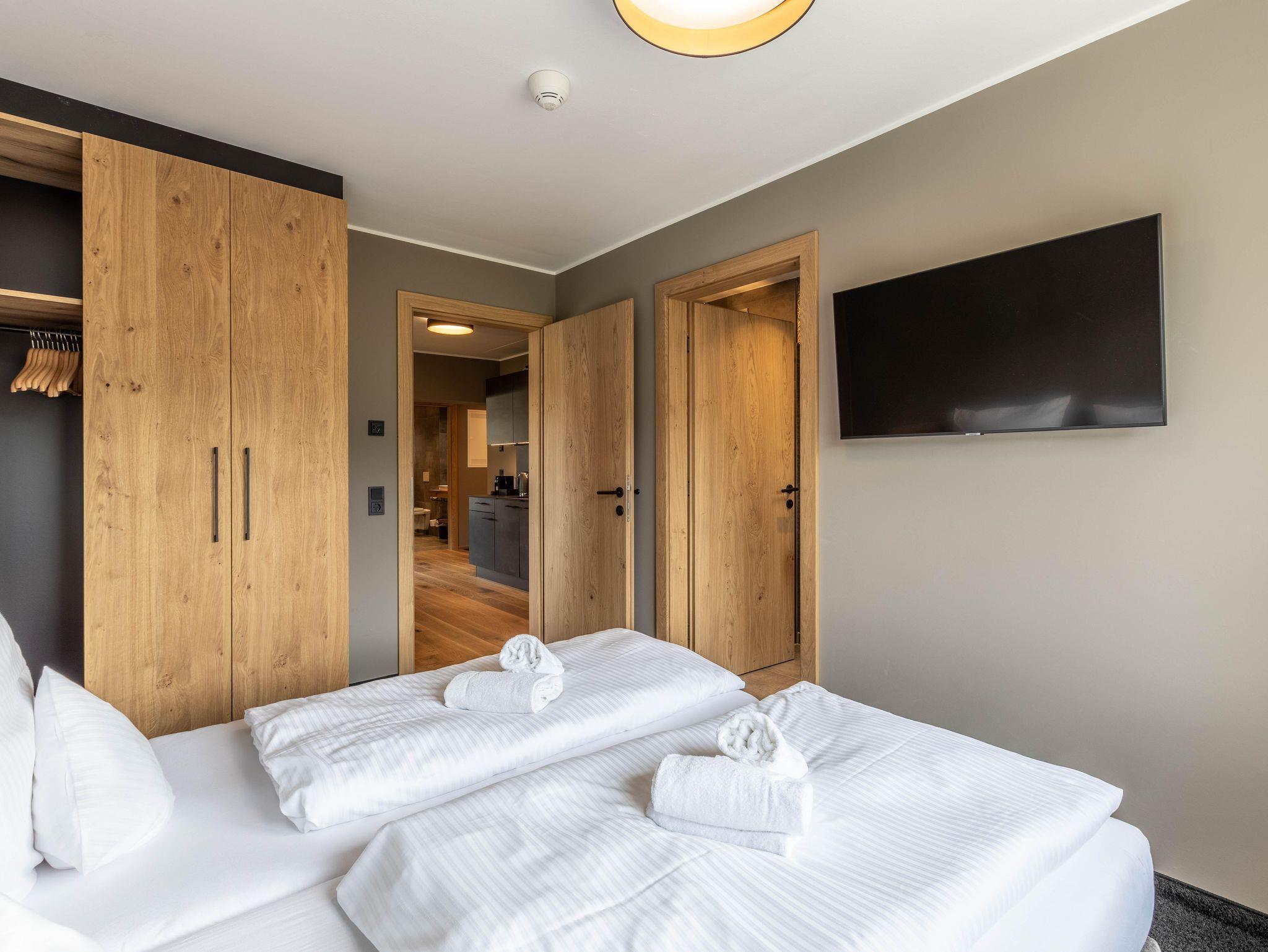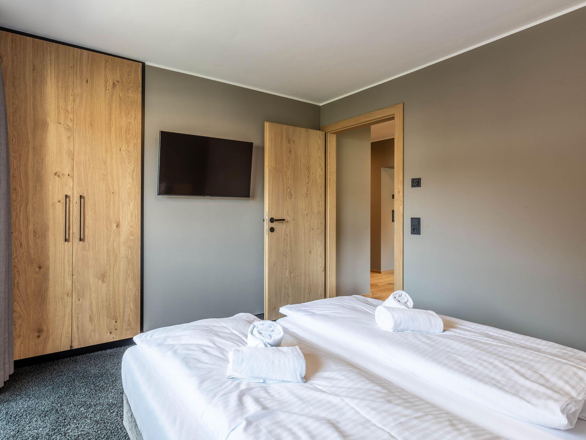 Das Apartment für 6 Personen bietet Wohnküche, 2 Schlafzimmer (Boxspringbetten, 1xeigenes Bad, 1x Balkonzugang), 2 Badezimmer und Balkon. Der Eingangsbereich, mit Garderobe, führt direkt in die Wohnküche, welche mit Küchengeräten, Kühl-Gefrierkombi sowie Nespresso Kaffeemaschine ausgestattet ist. Die Küche verfügt außerdem über Küchengeschirr. Der Esstisch bietet Platz, um ein selbstgekochtes Mahl zu genießen. Im Wohnbereich befindet sich TV, Kleiderschrank und Ausziehsofa. .